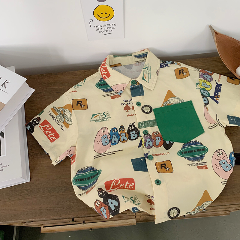 남자들의 잘 생긴 풀 프린트 만화 셔츠 여름 어린이 반팔 순면 셔츠 올매치 중반의 얇은 유행 서양식스토어 가기