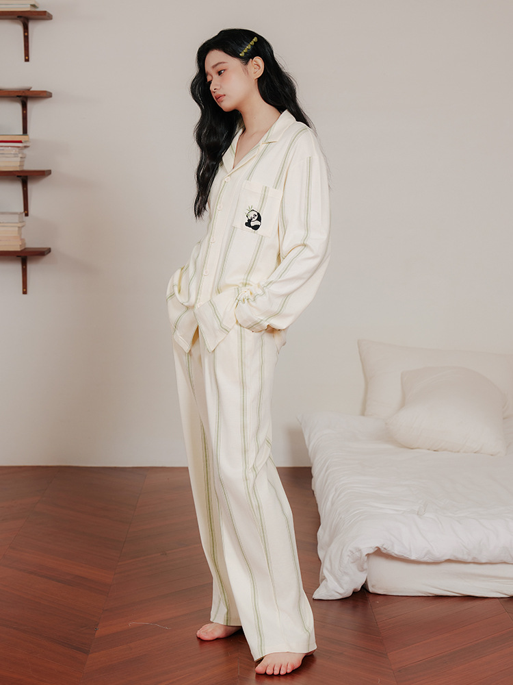 봄 녹색 수직 패턴 클래스 박테리아 퓨어 코튼 커플 잠옷 남자와 여자의 귀여운 팬더 긴 소매 홈 의류 세트