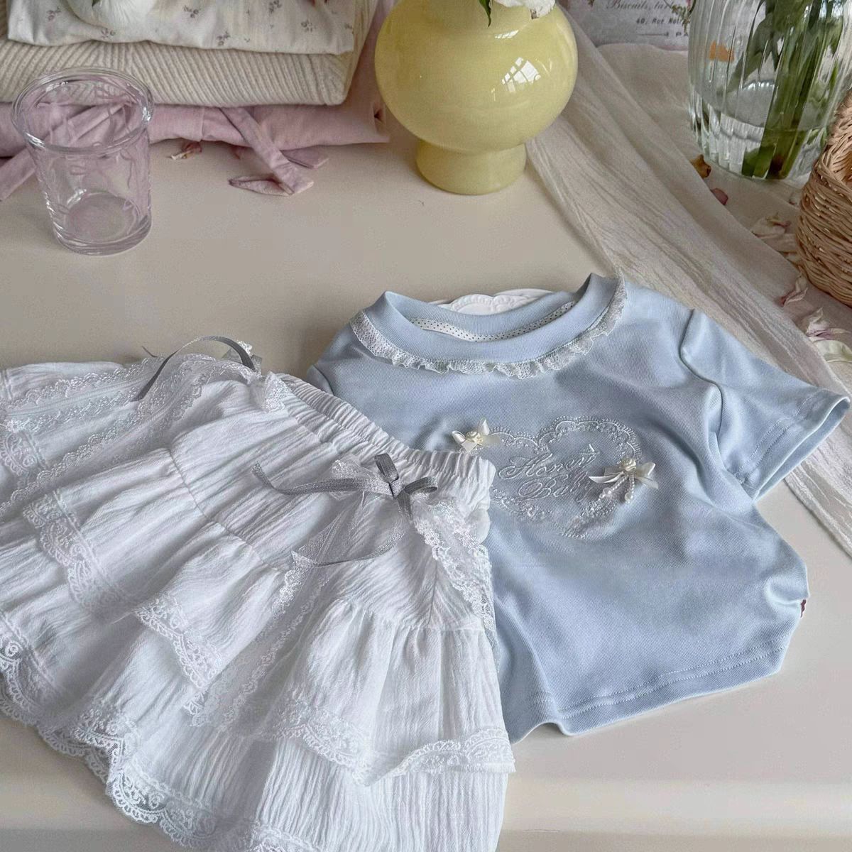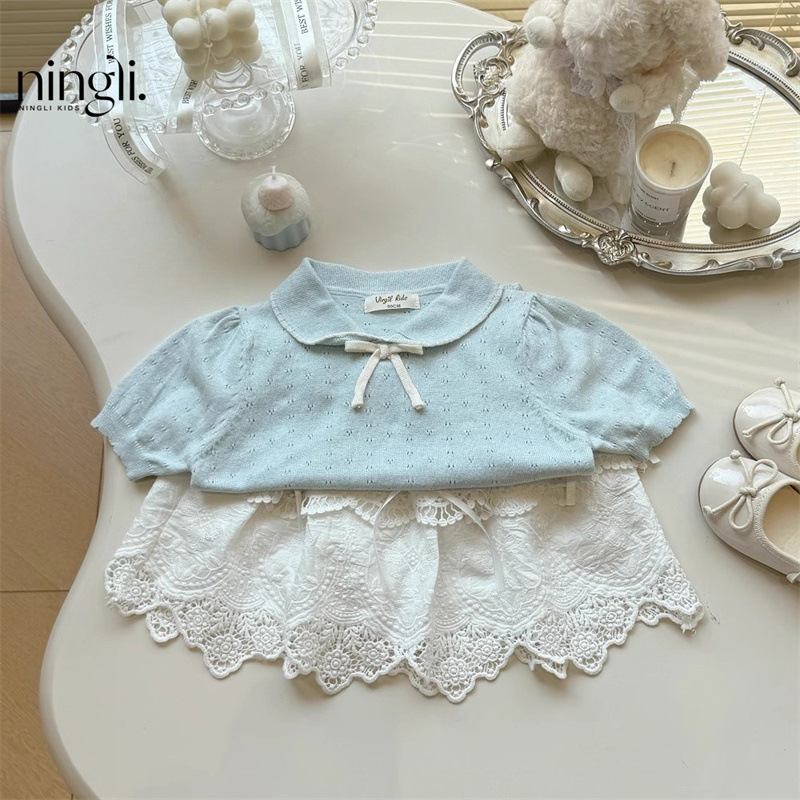 라임 소녀의 반팔 티셔츠 반바지 세트 여름 스타일 어린이 스타일 레이스 레이스 칼라 탑 트렌디 스커트스토어 가기