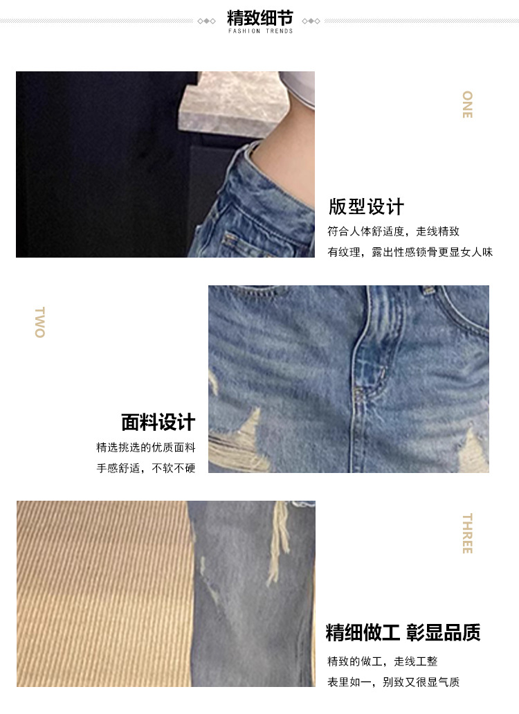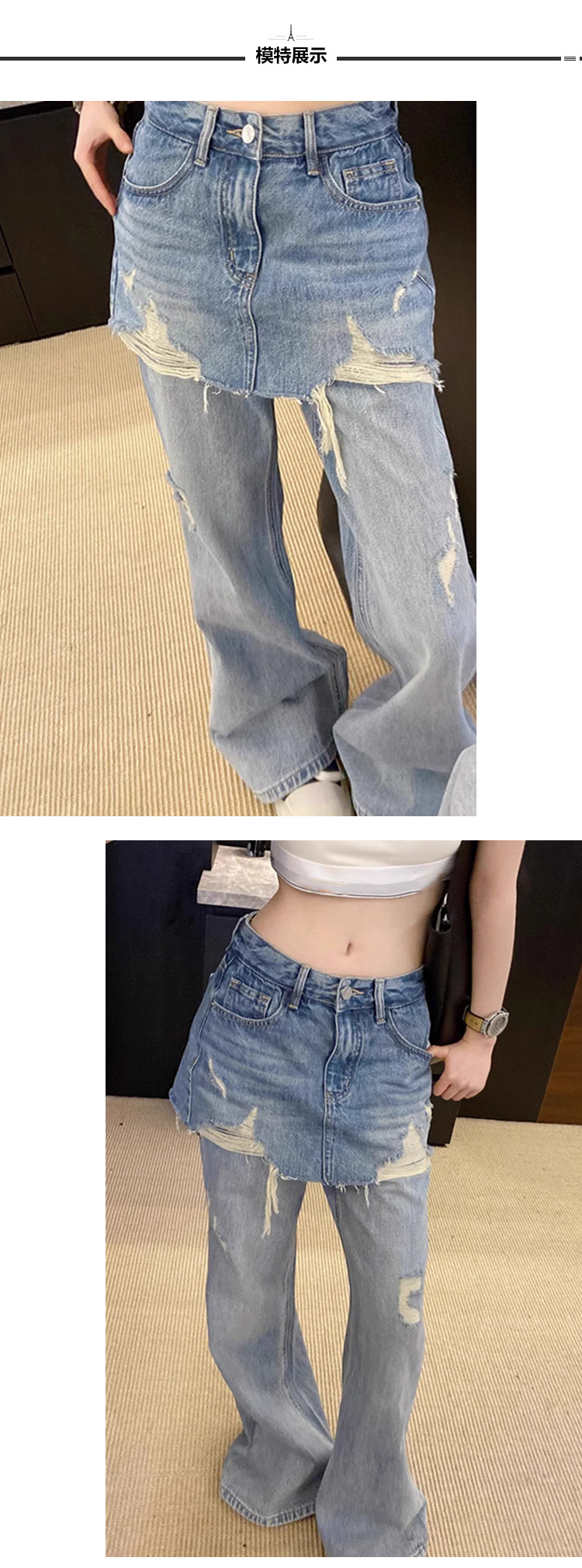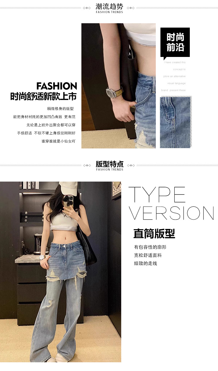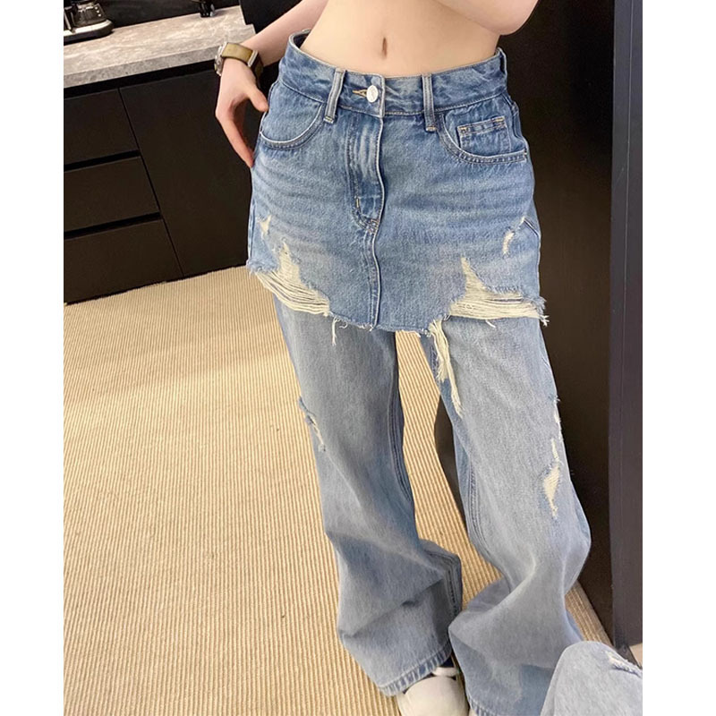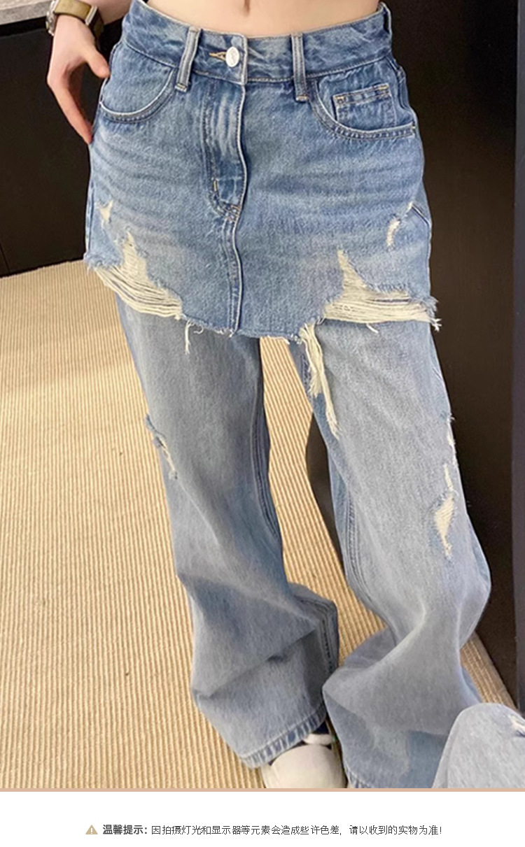 심천 25 신상품 Nanyou 여성 유럽 가짜 투피스 찢어진 엉덩이 커튼 하이 웨이스트 슬리밍 루즈 와이드 레그 청바지 여성용스토어 가기