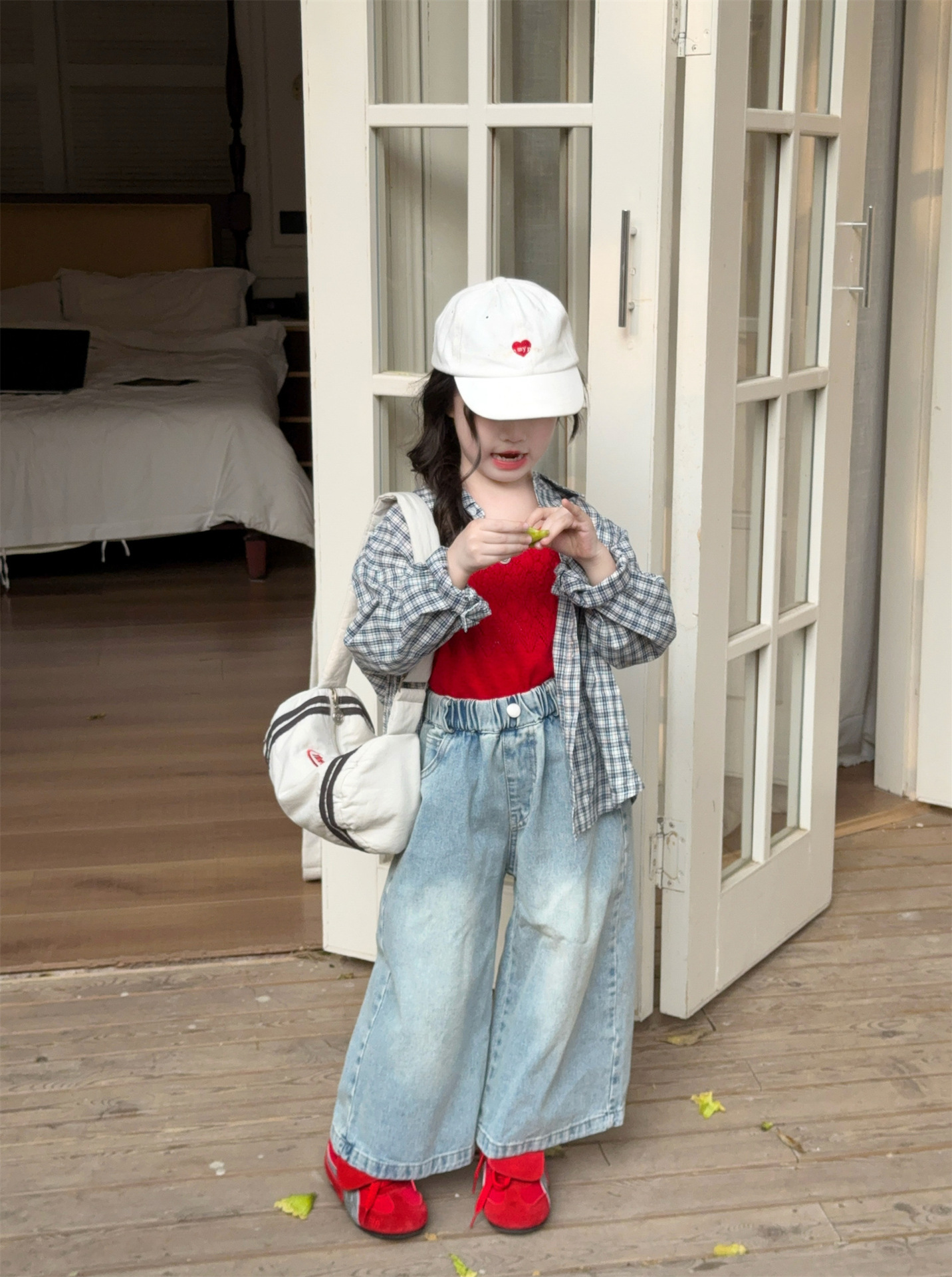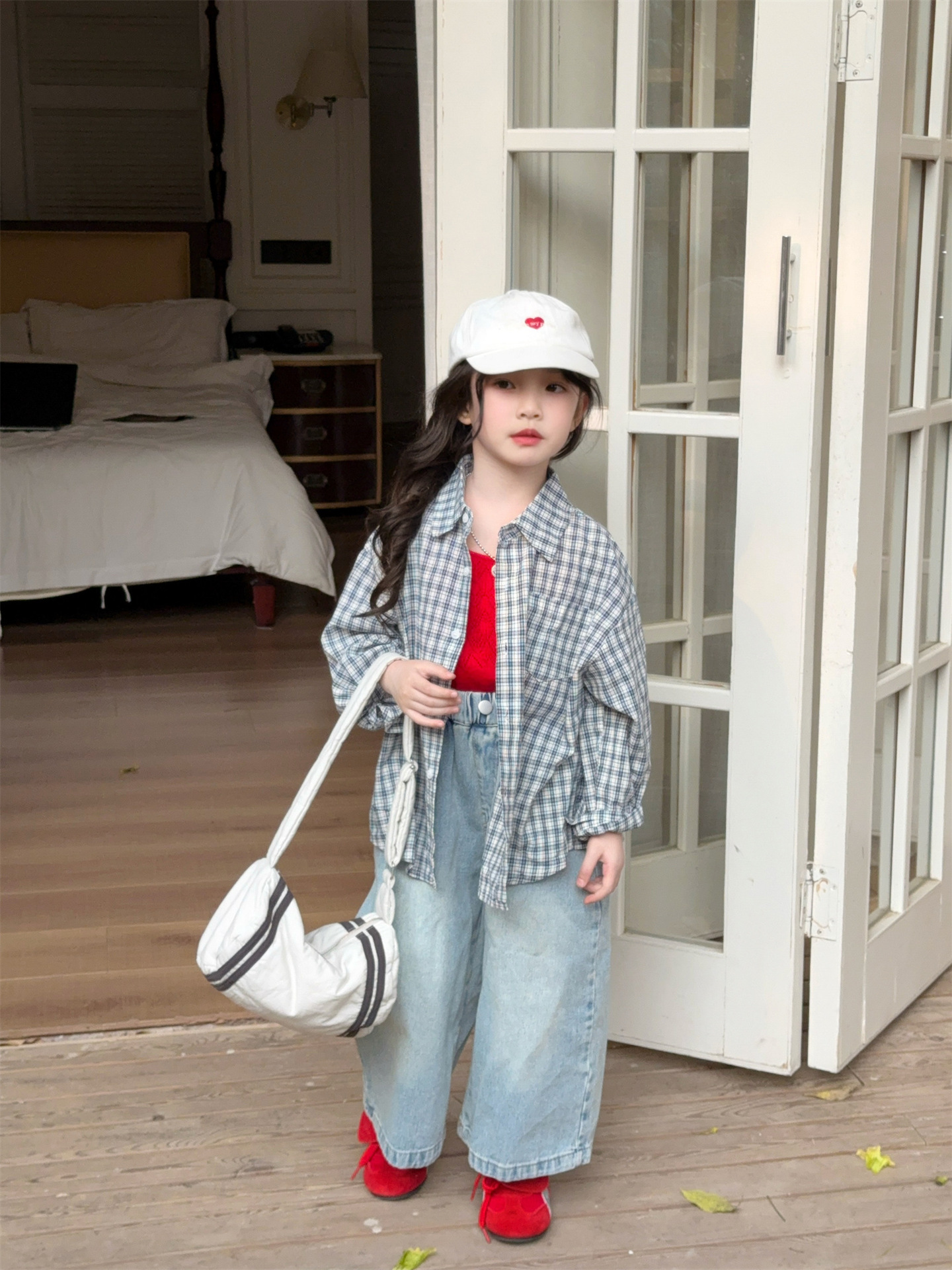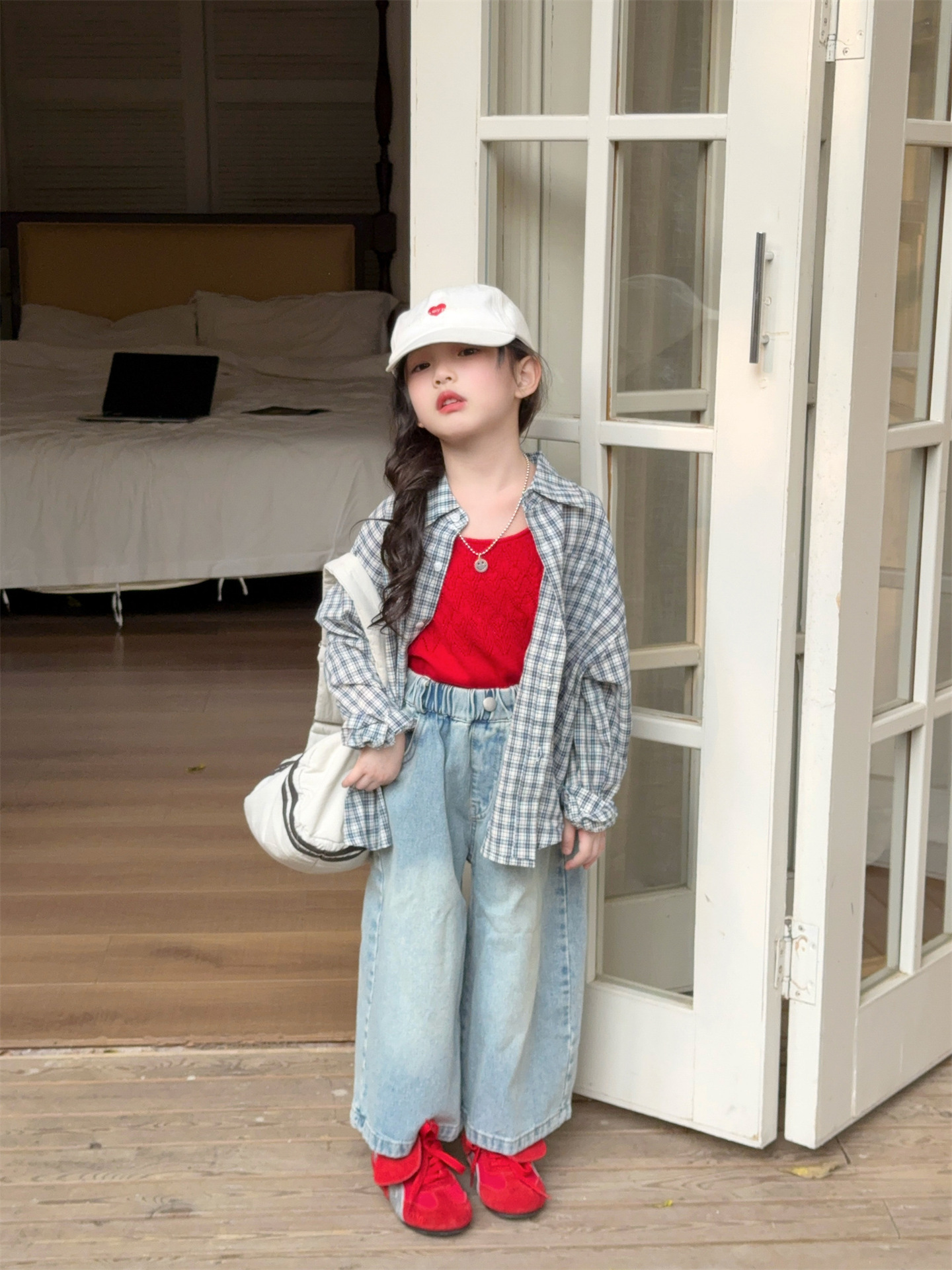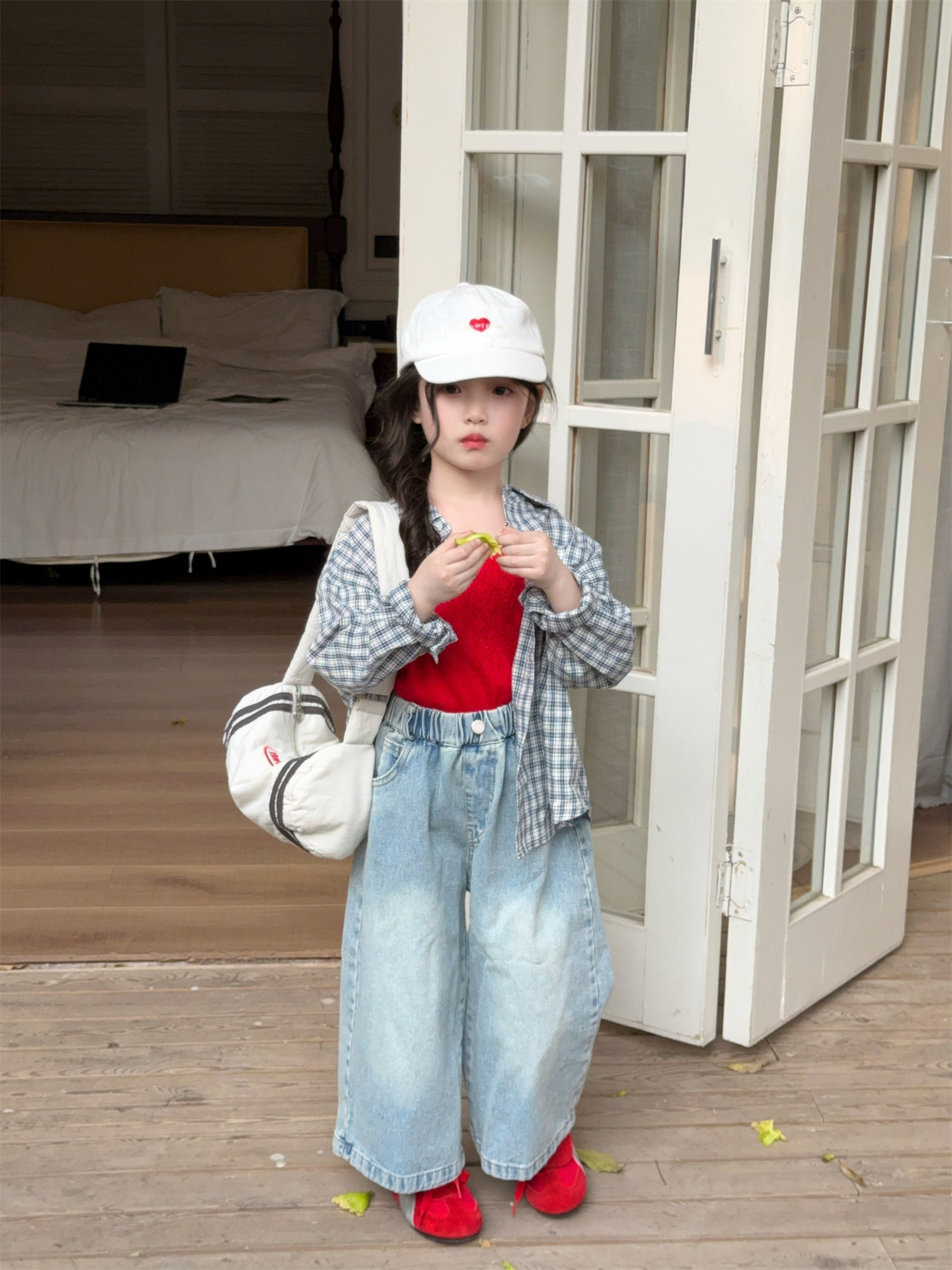 2025 봄과 여름 새로운 세트 소녀의 세련된 격자 무늬 셔츠 니트 조끼 유행 청바지 3 종 세트스토어 가기