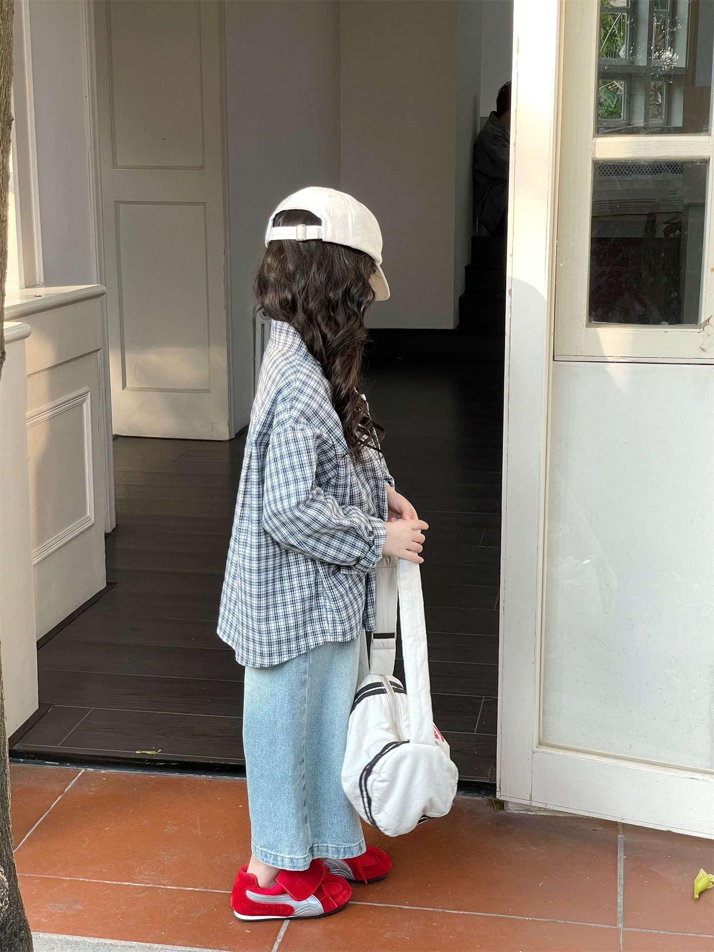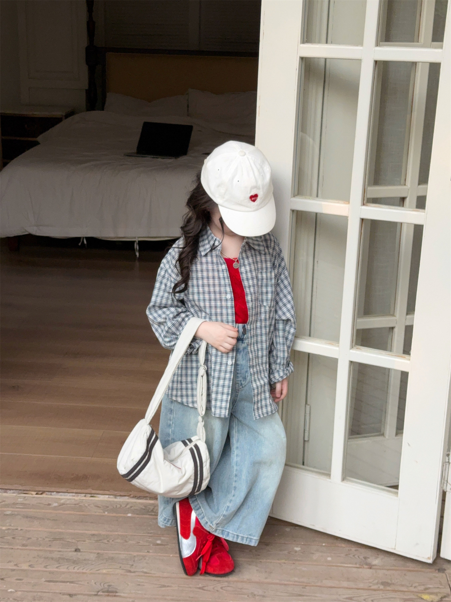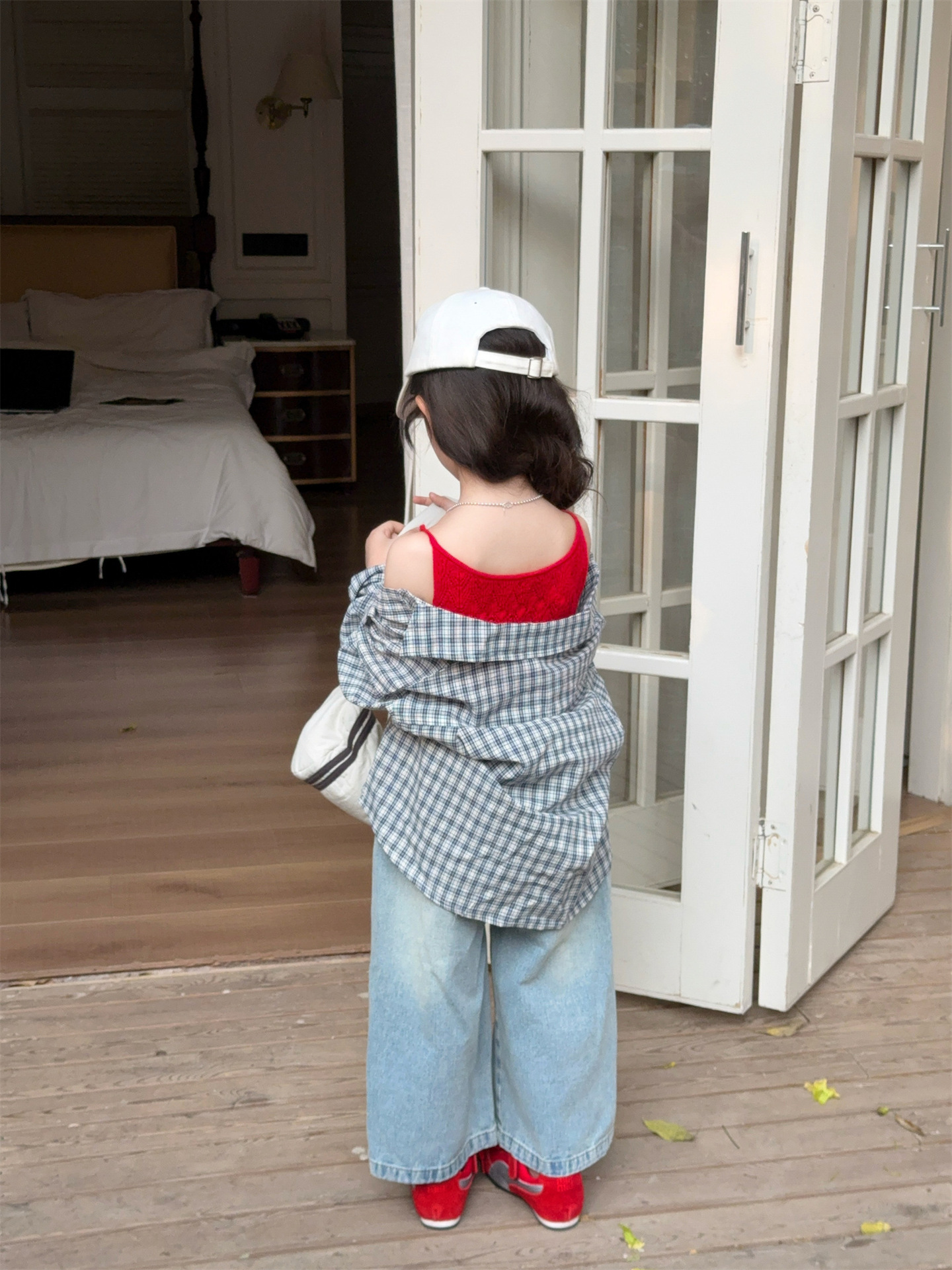 2025 봄과 여름 새로운 세트 소녀의 세련된 격자 무늬 셔츠 니트 조끼 유행 청바지 3 종 세트스토어 가기