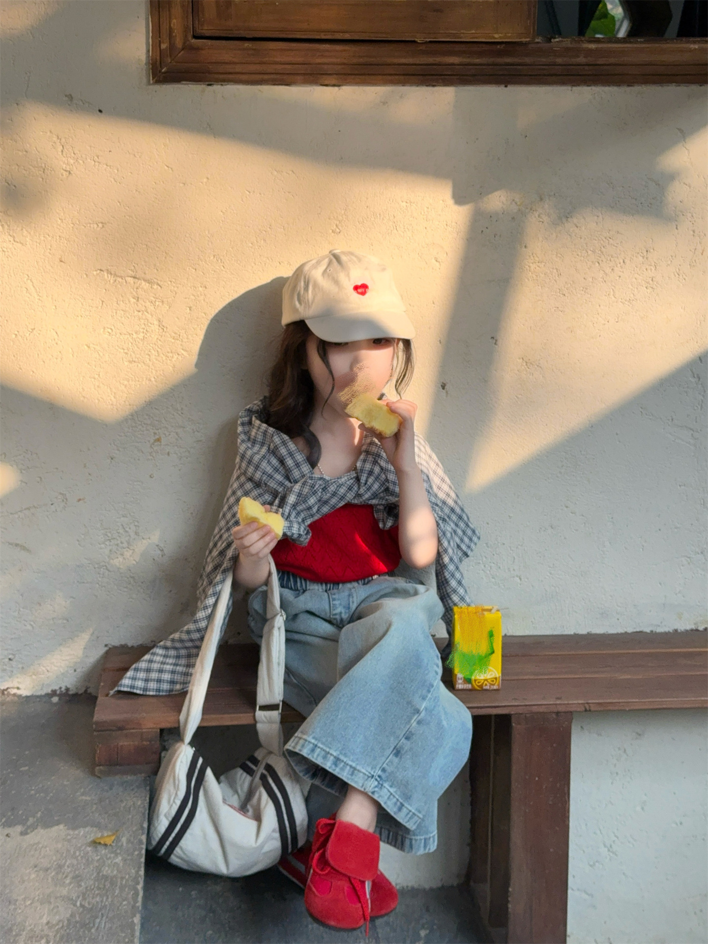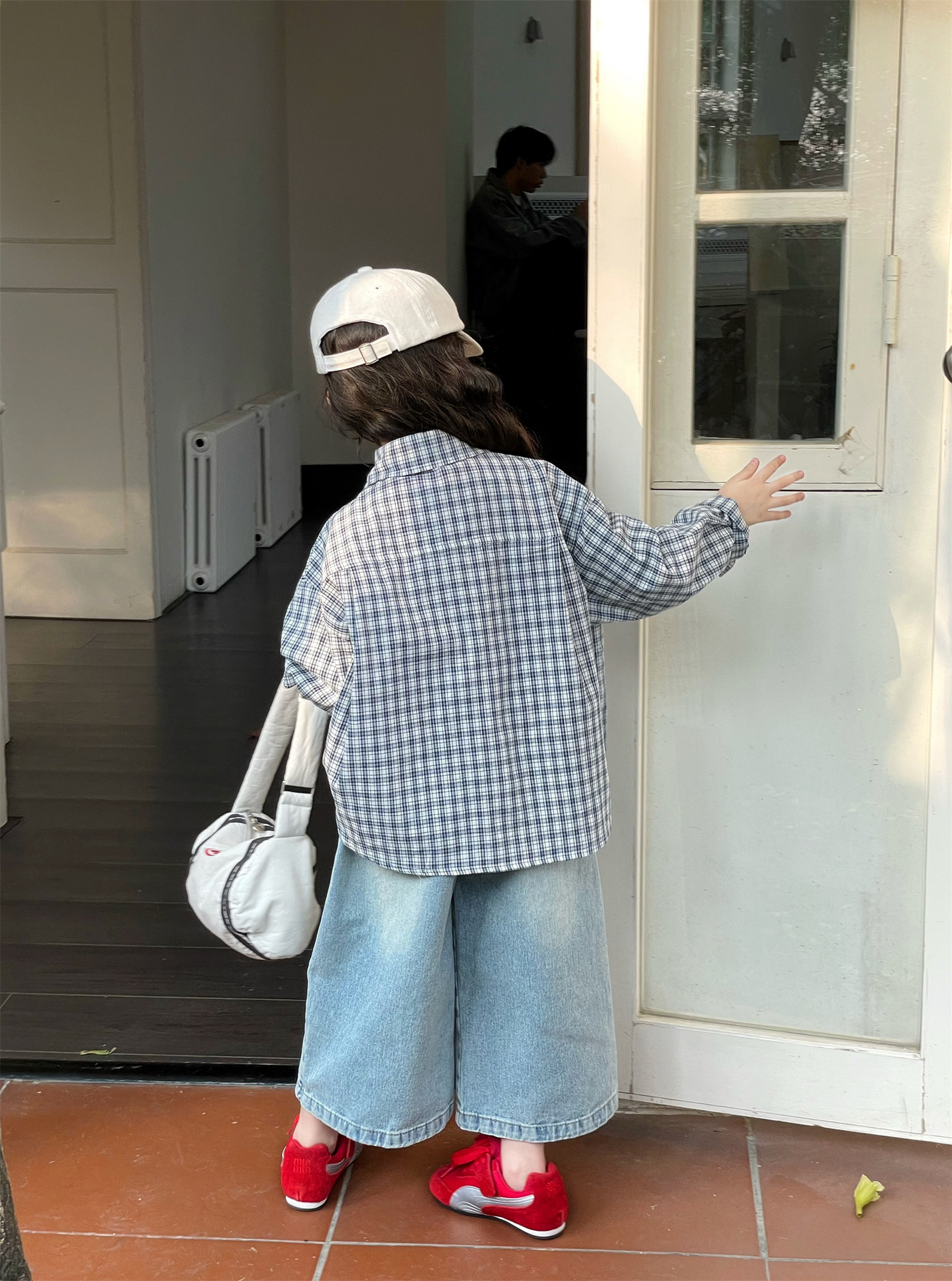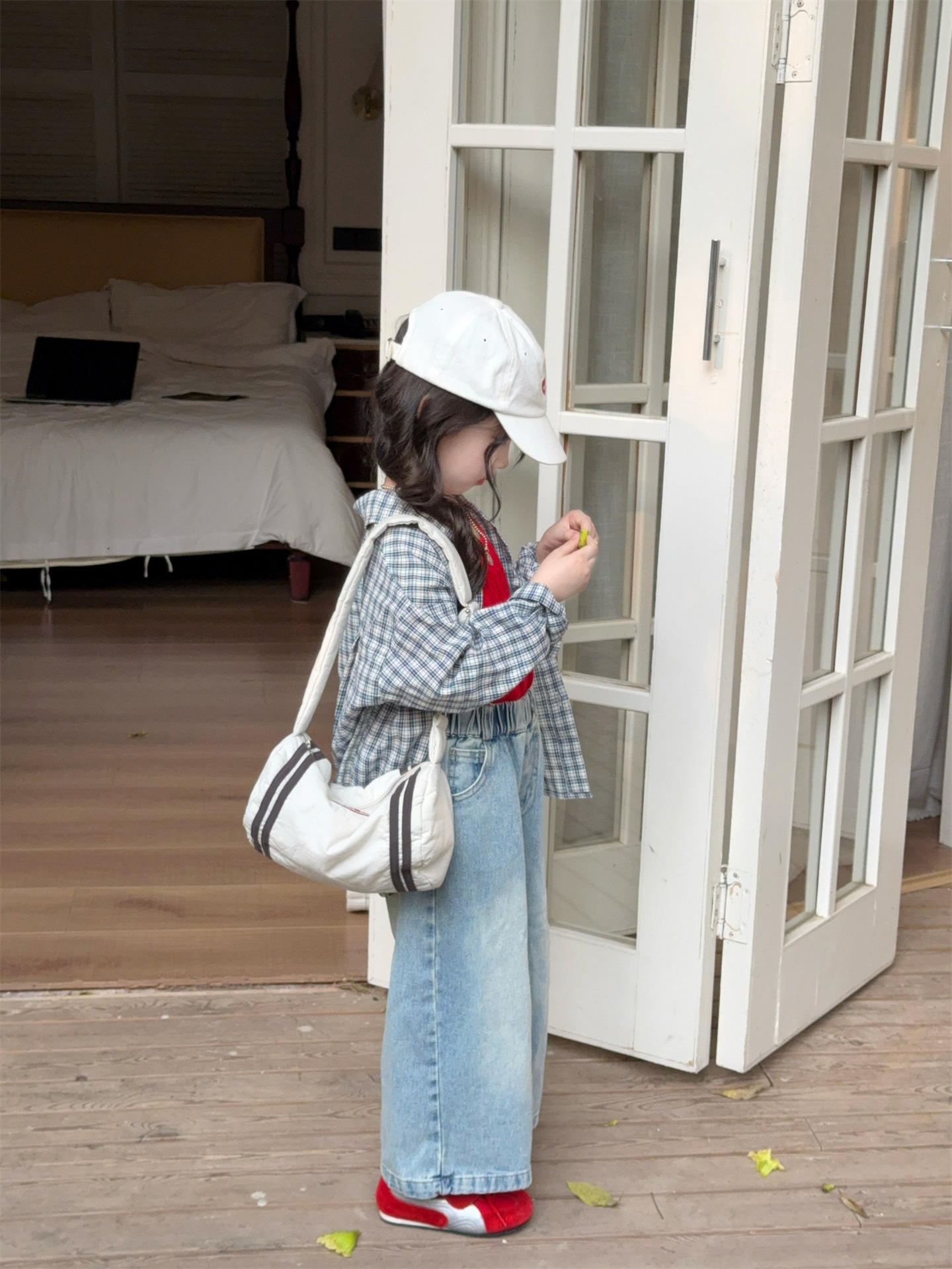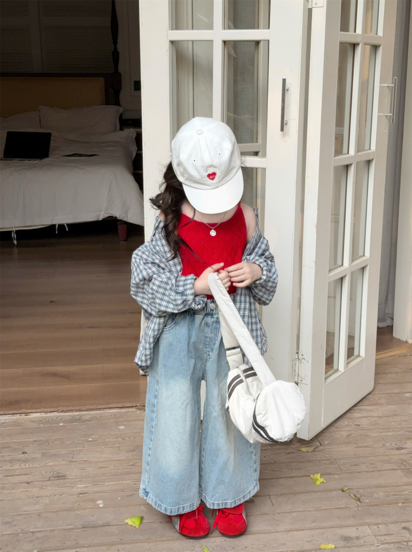 2025 봄과 여름 새로운 세트 소녀의 세련된 격자 무늬 셔츠 니트 조끼 유행 청바지 3 종 세트스토어 가기