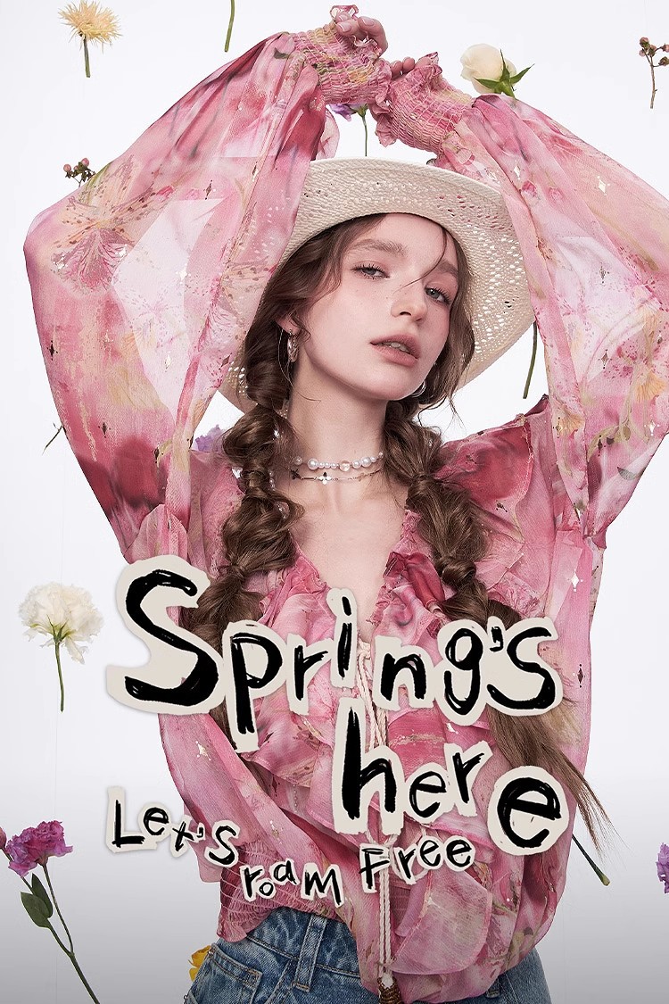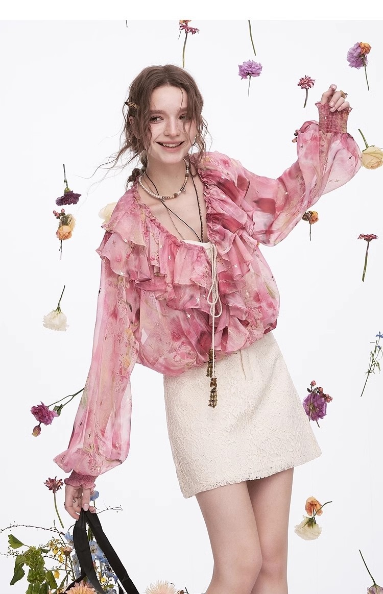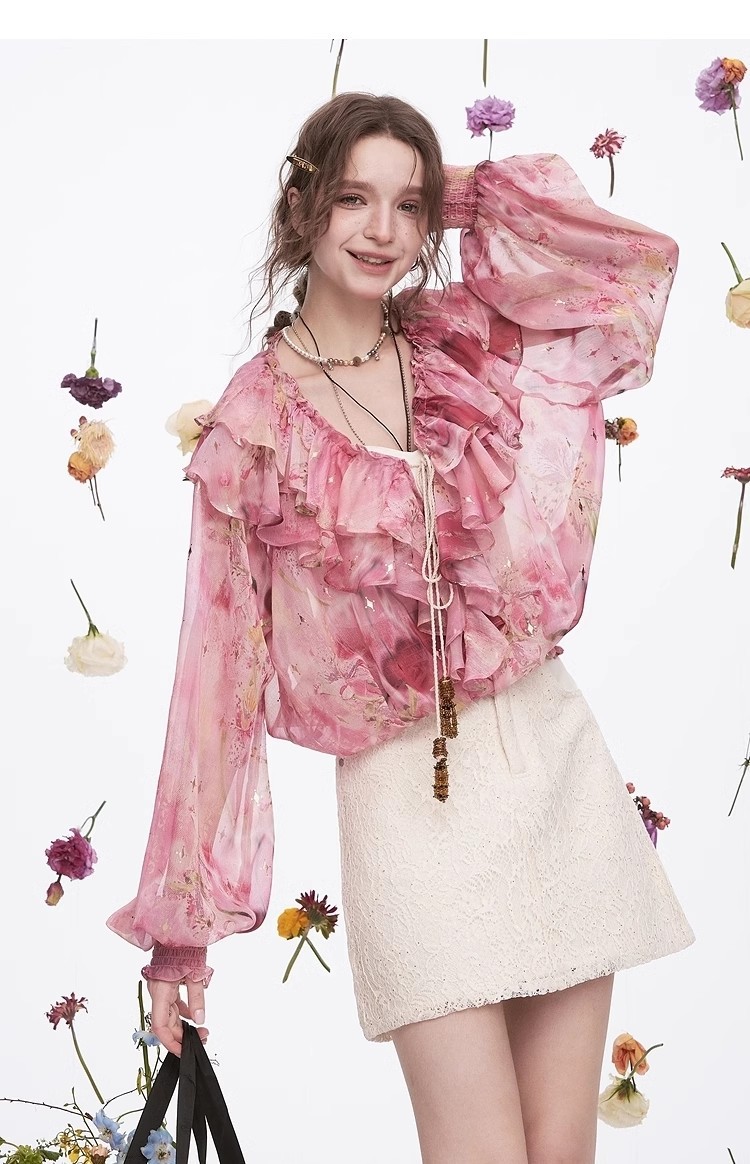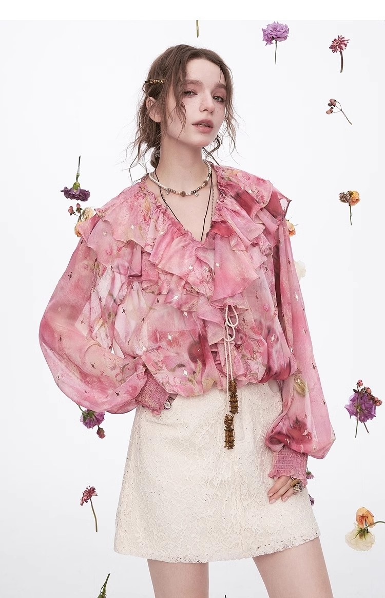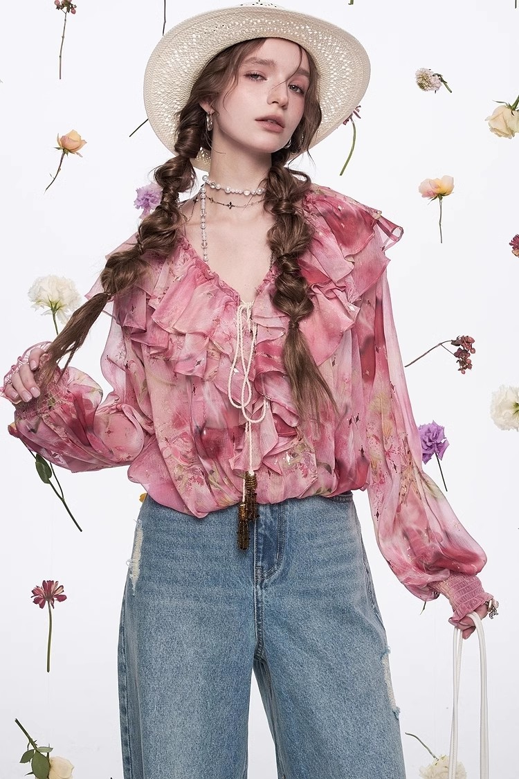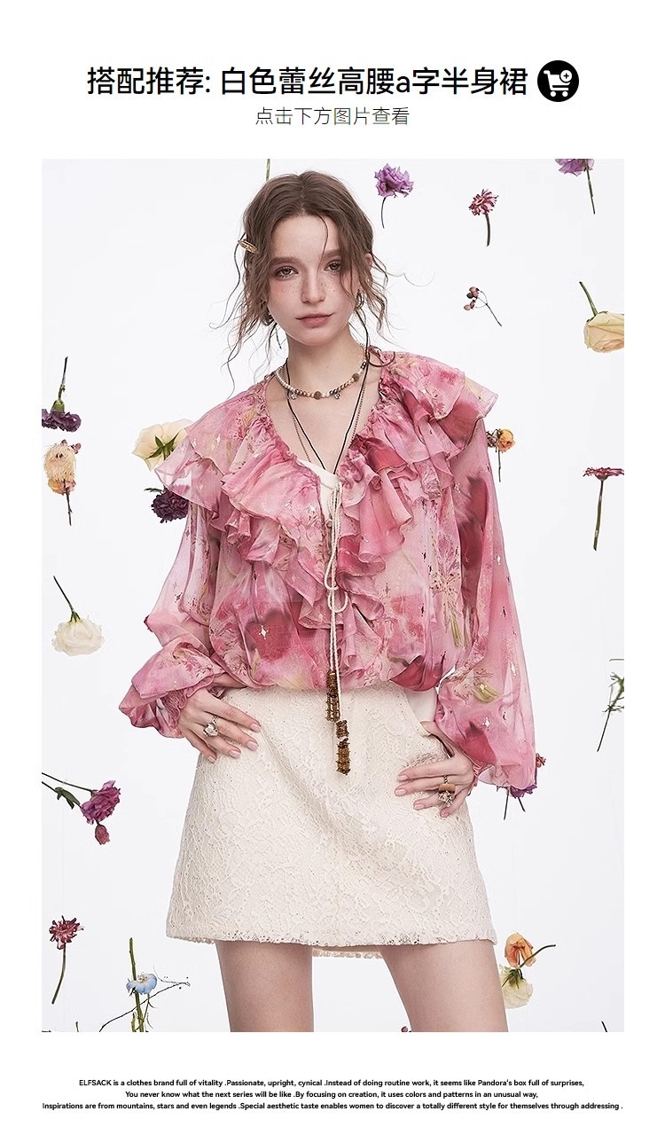 고블린의 포켓 프렌치 러플 프린트 쉬폰 셔츠 여성의 2025 봄 새로운 디자인 감각 우아한 탑스토어 가기