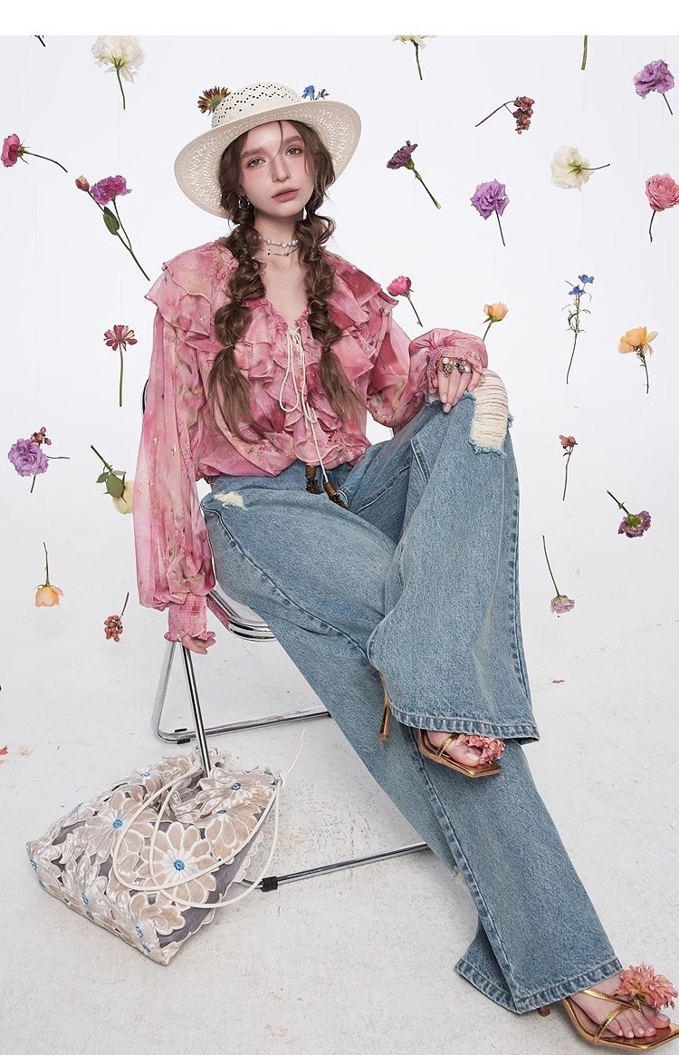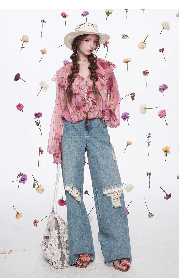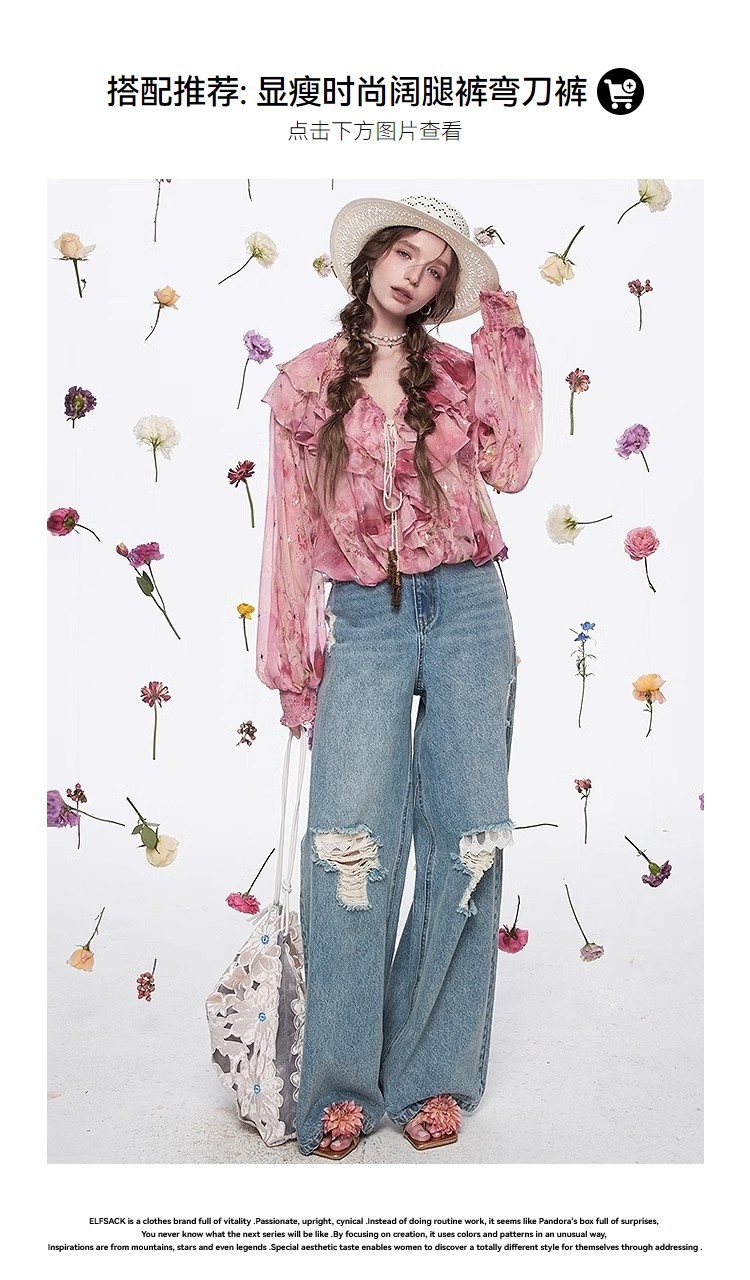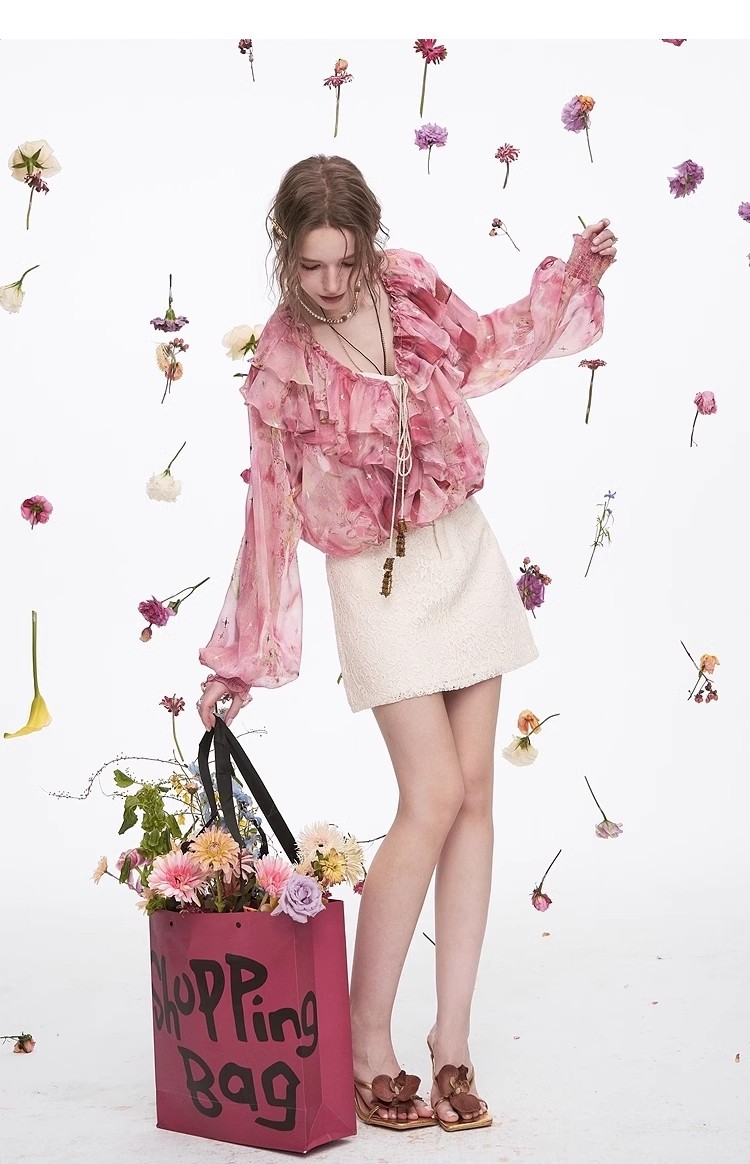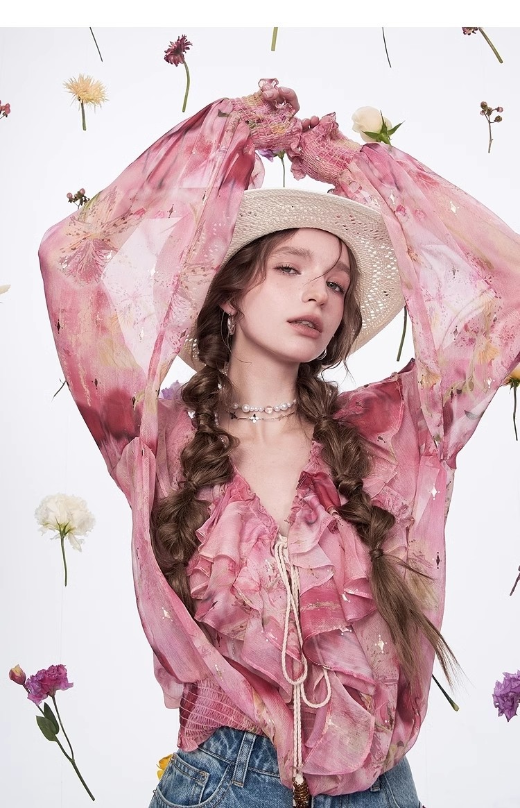고블린의 포켓 프렌치 러플 프린트 쉬폰 셔츠 여성의 2025 봄 새로운 디자인 감각 우아한 탑스토어 가기