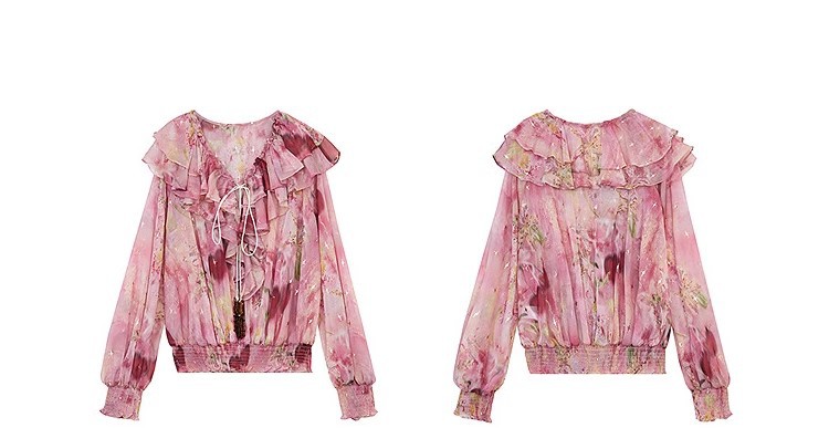 고블린의 포켓 프렌치 러플 프린트 쉬폰 셔츠 여성의 2025 봄 새로운 디자인 감각 우아한 탑