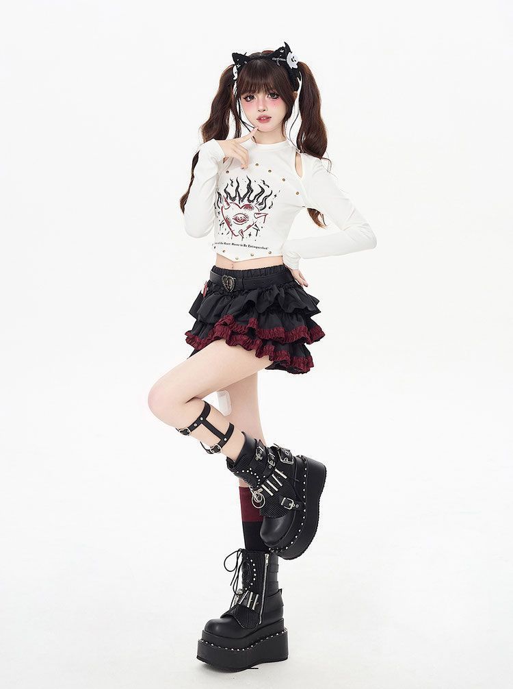 • 레드 레이스가 달린 블랙 스커트 [벨트는 포함되어 있지 않습니다]