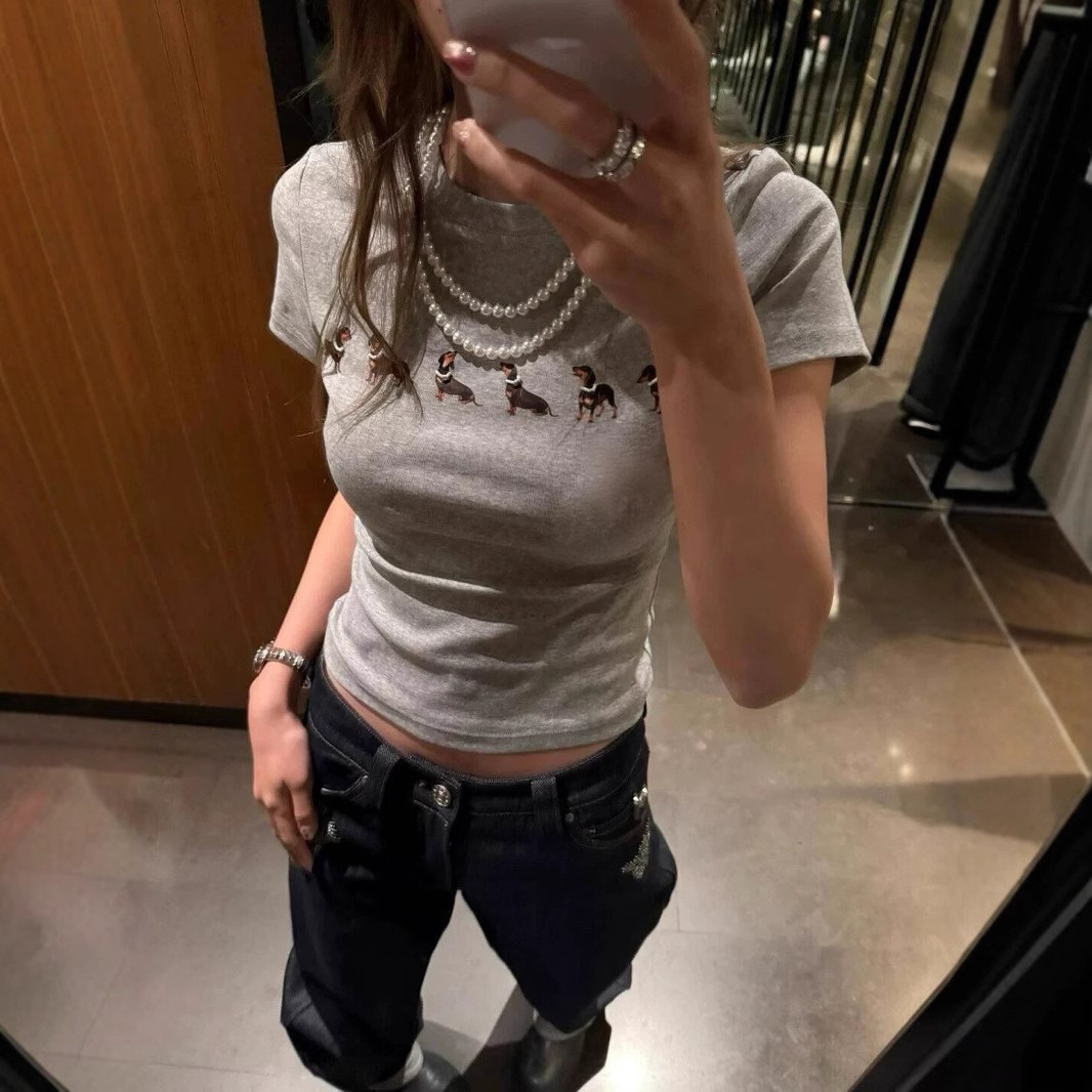 그레이 닥스 훈트 강아지 어깨 반팔 티셔츠 여성 여름 2025 새로운 슬림 핏 짧은 핫 걸 탑 Ins스토어 가기