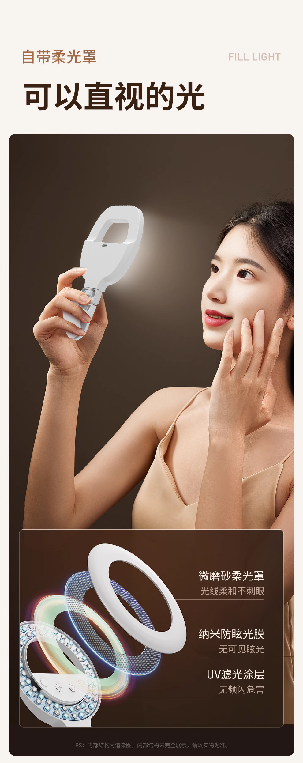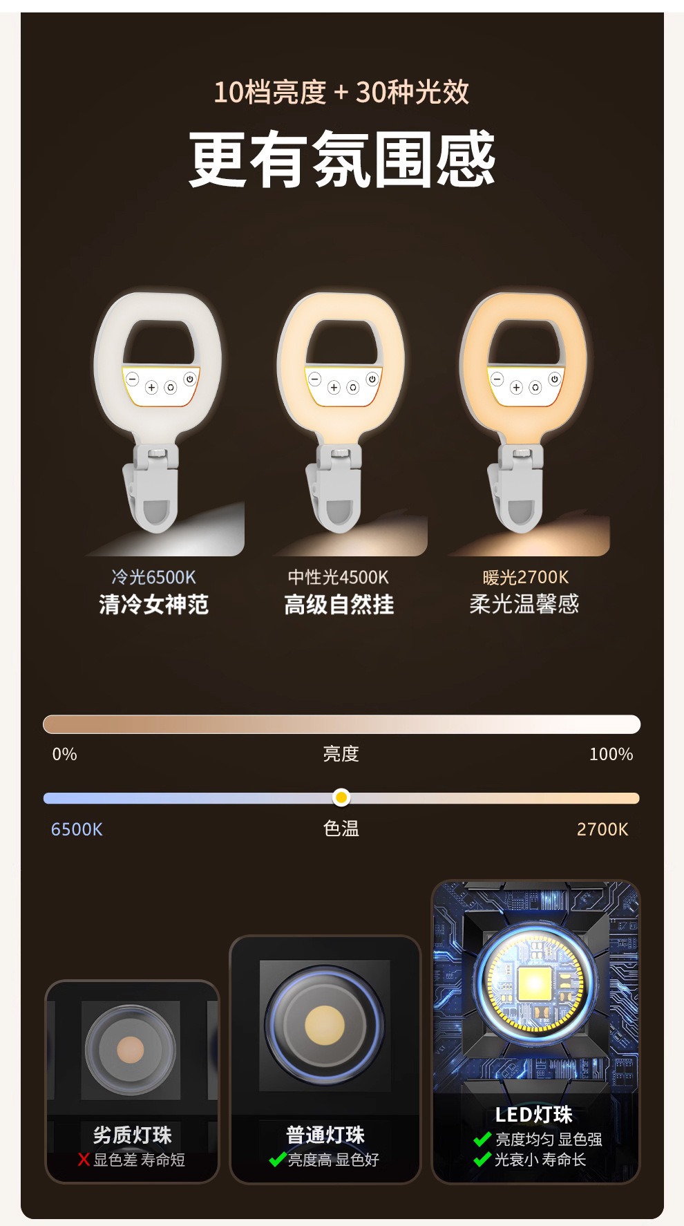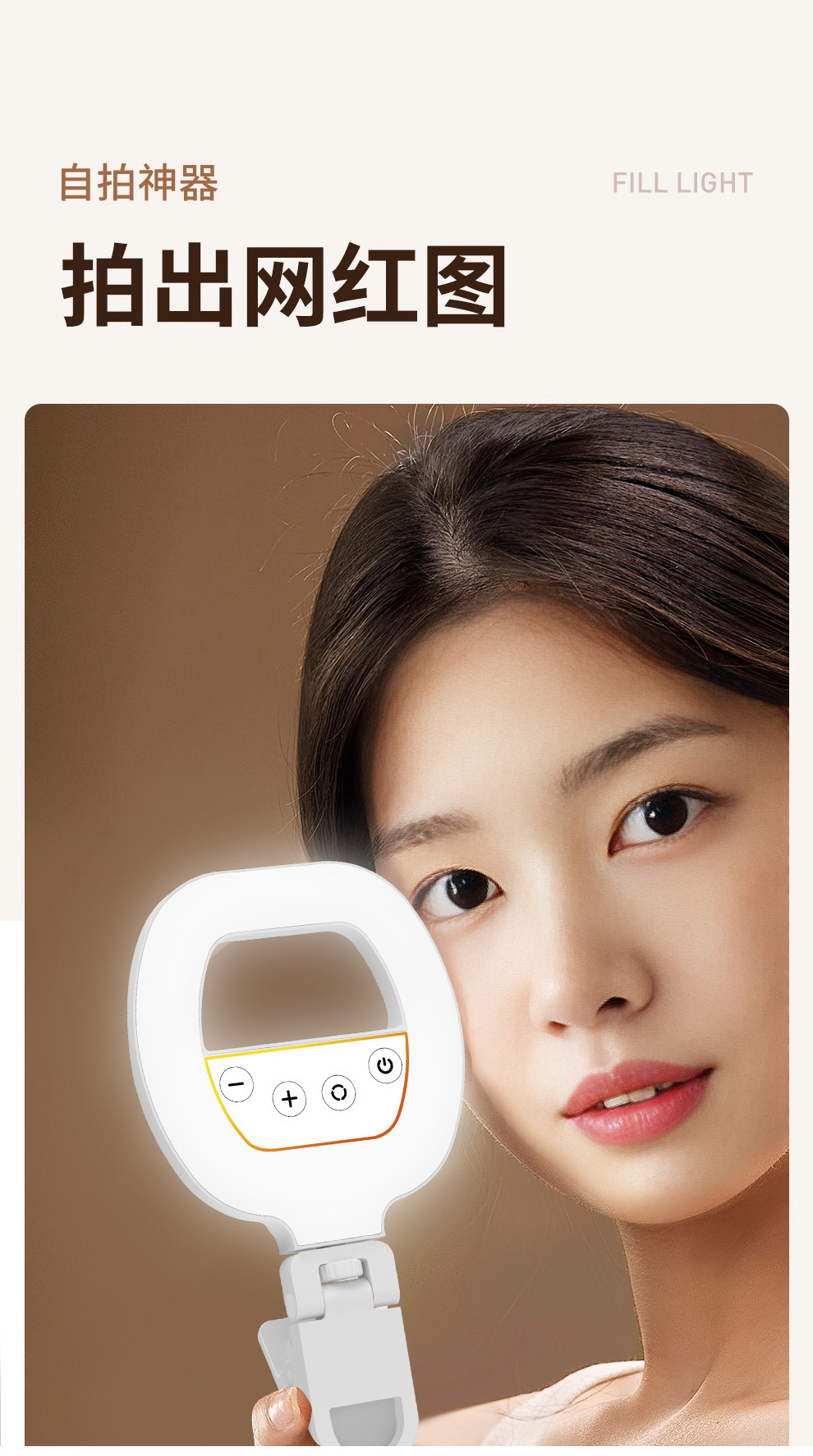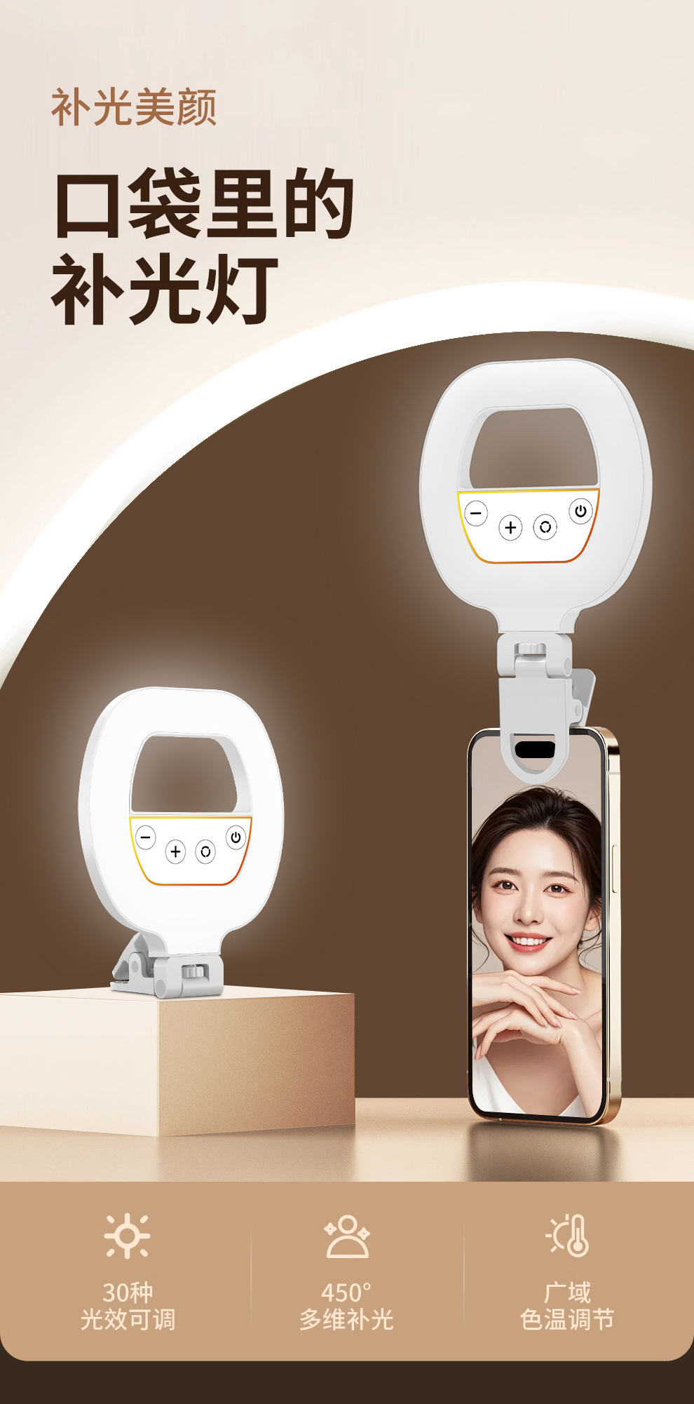 • 충전식 RGB 풀 컬러 필 라이트 + 휴대폰 클립