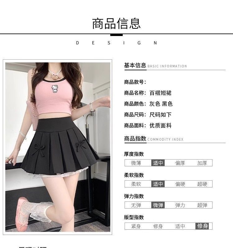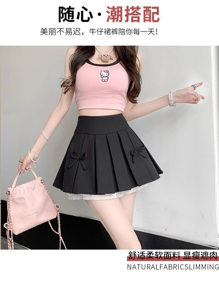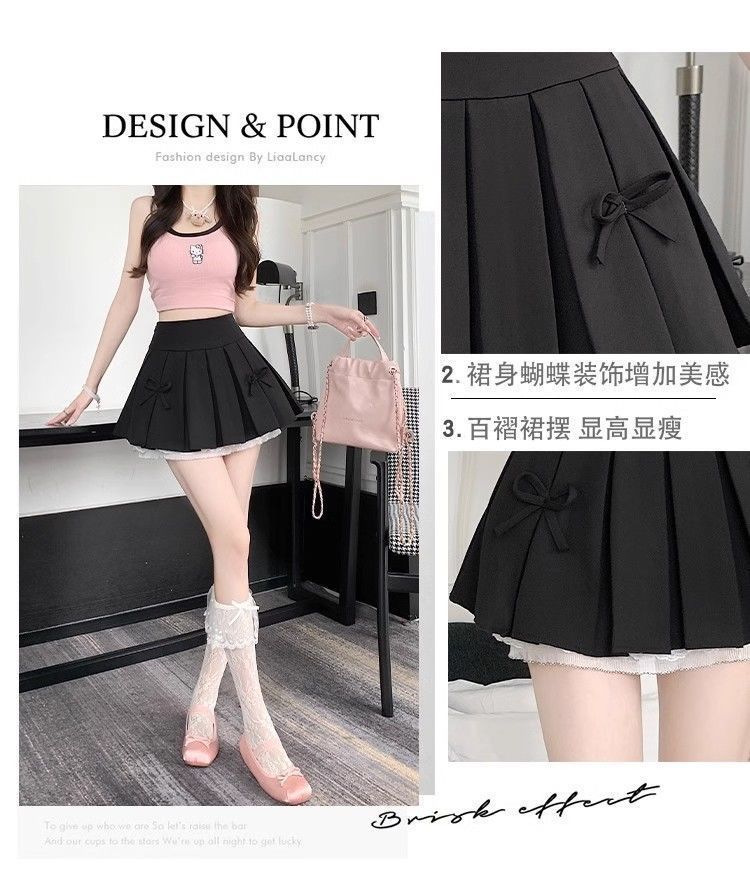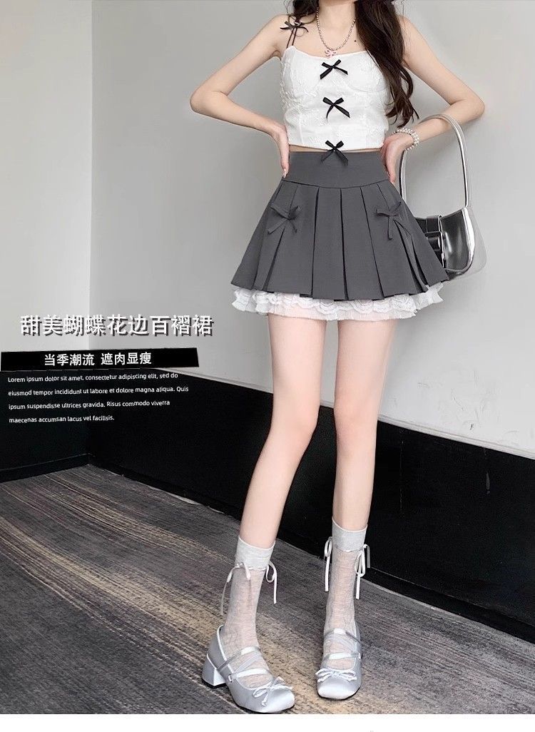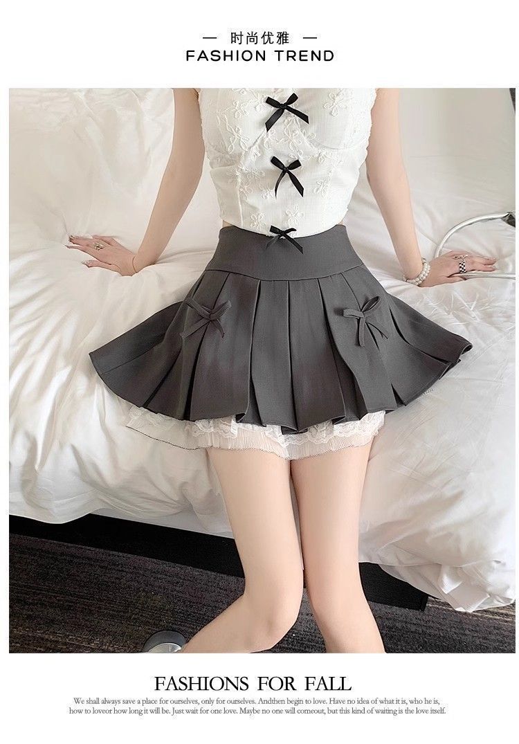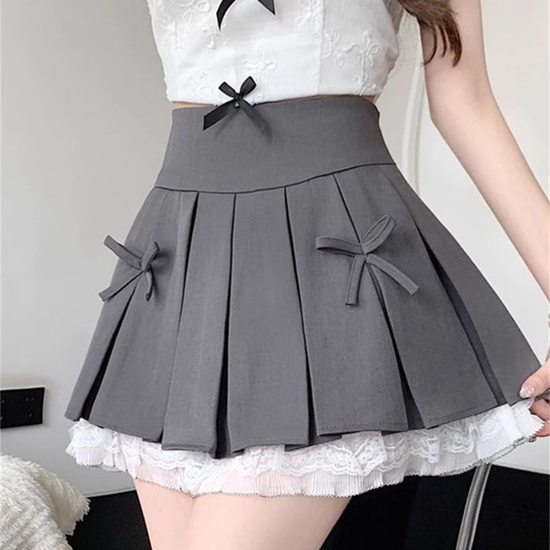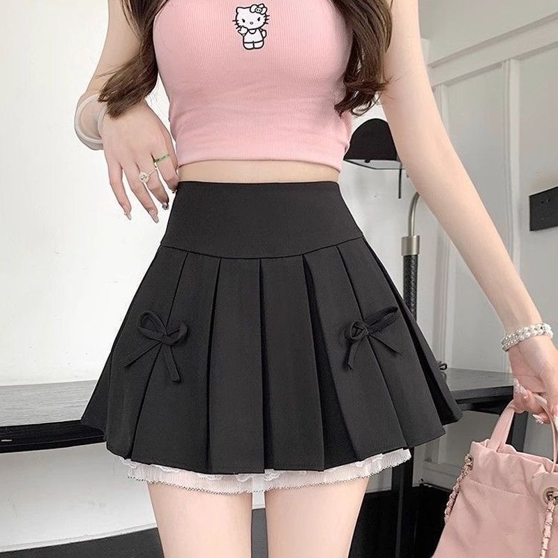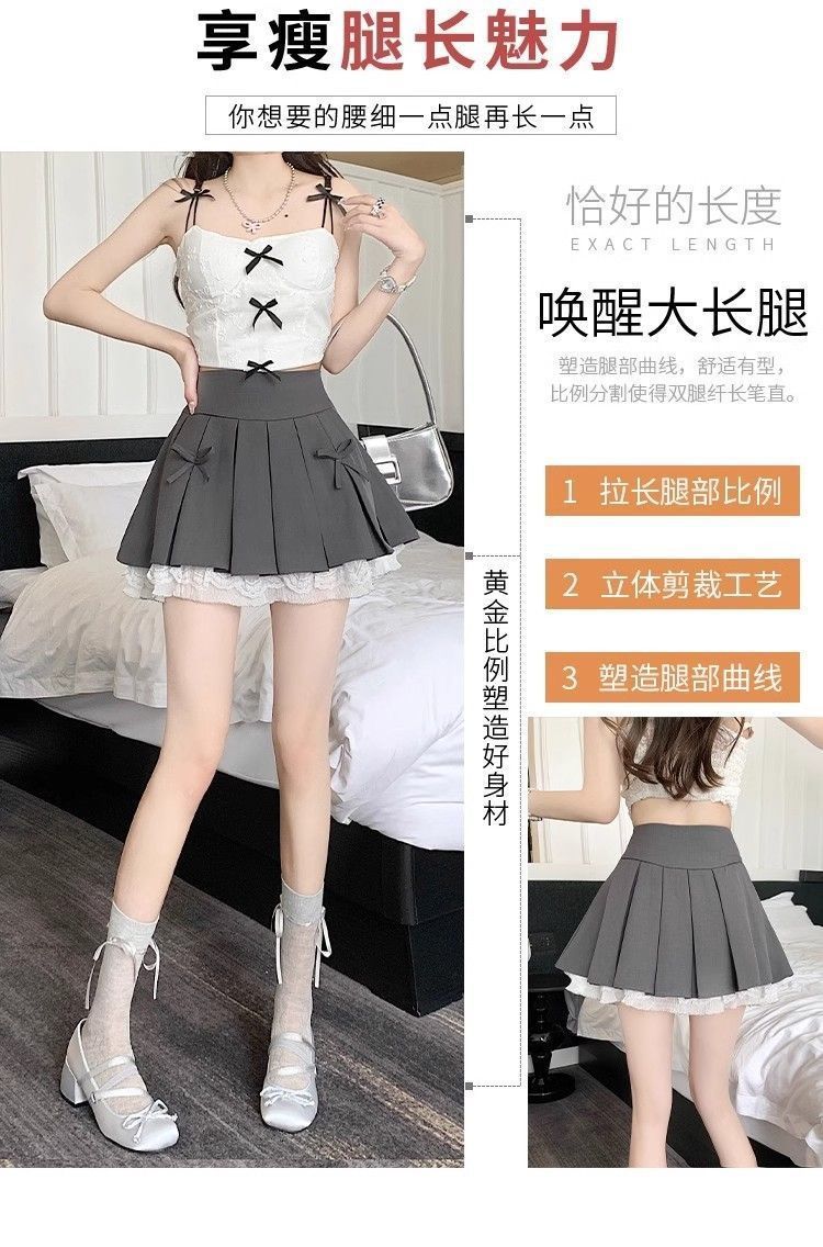 대학 스타일 주름 치마 레이스 보우 스커트 여성의 봄과 여름 높은 허리 스티칭 A 라인 스커트 미끄럼 방지 스커트스토어 가기