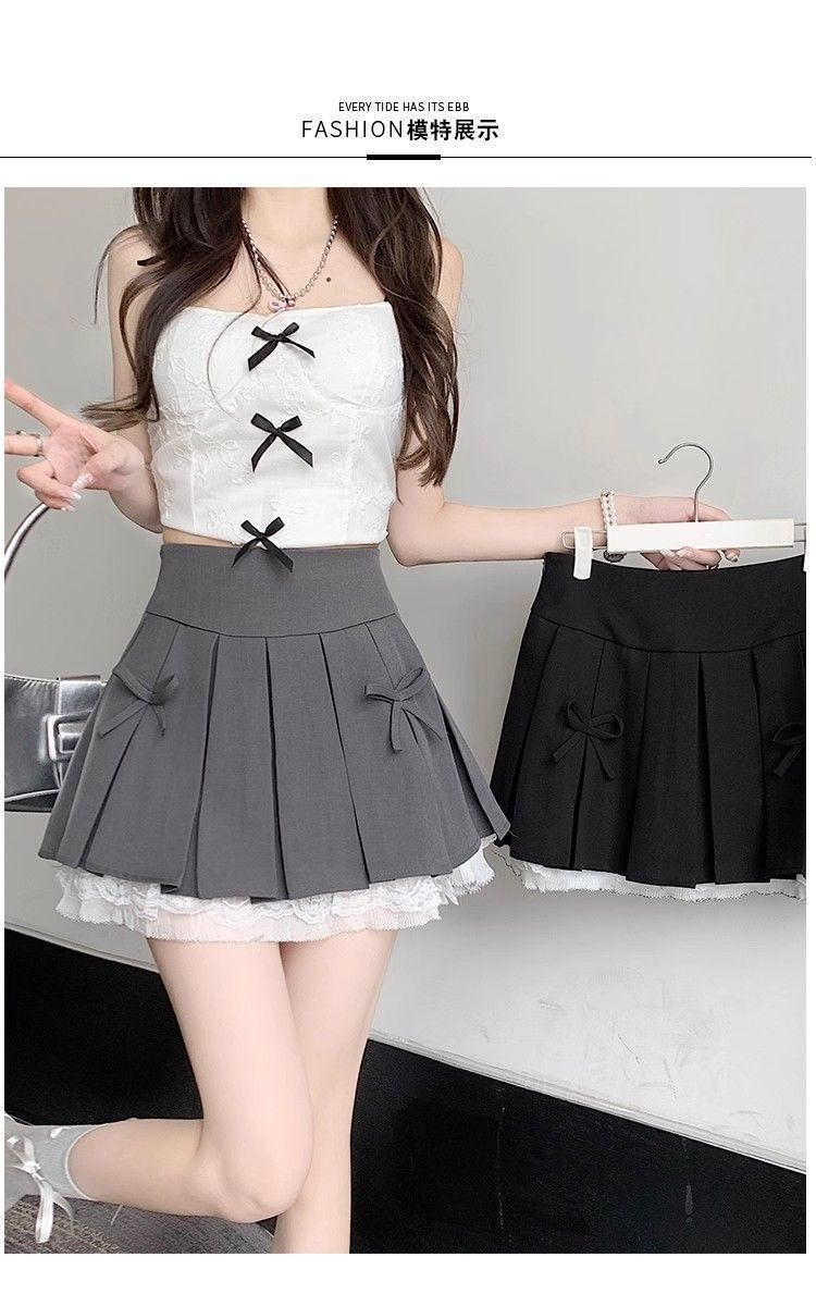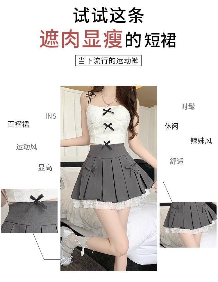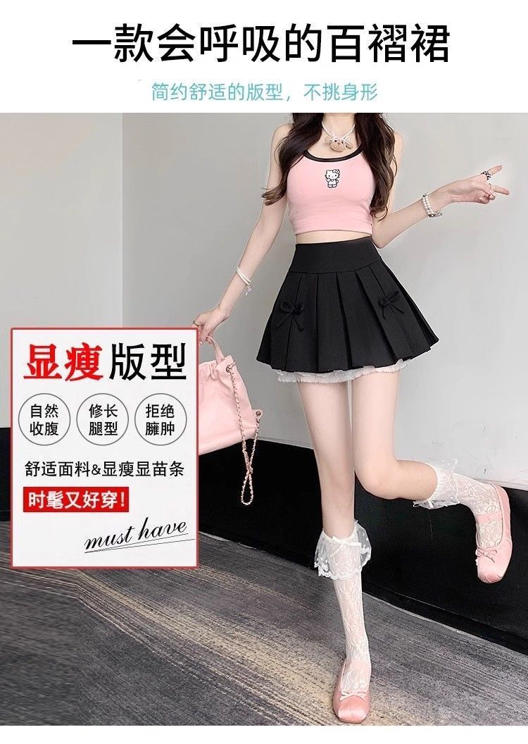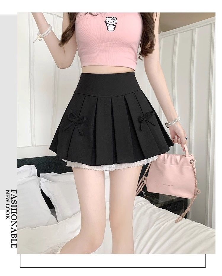 대학 스타일 주름 치마 레이스 보우 스커트 여성의 봄과 여름 높은 허리 스티칭 A 라인 스커트 미끄럼 방지 스커트