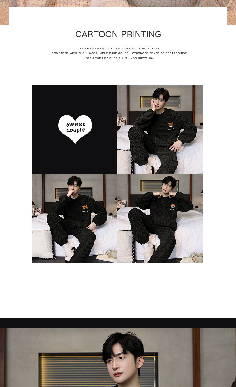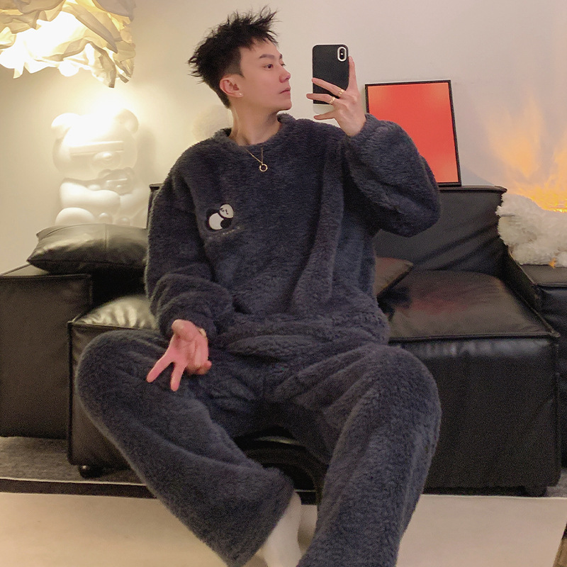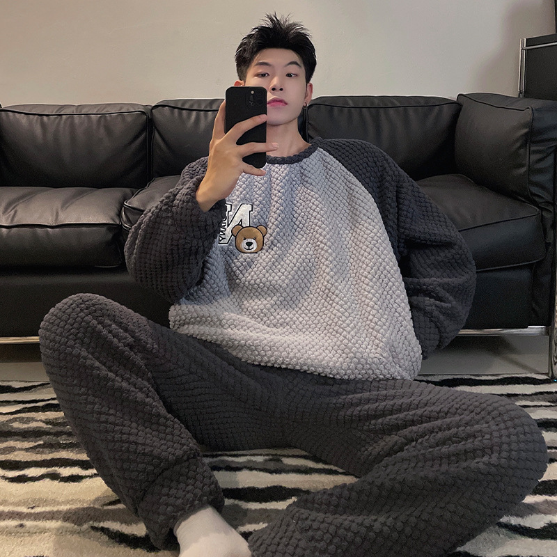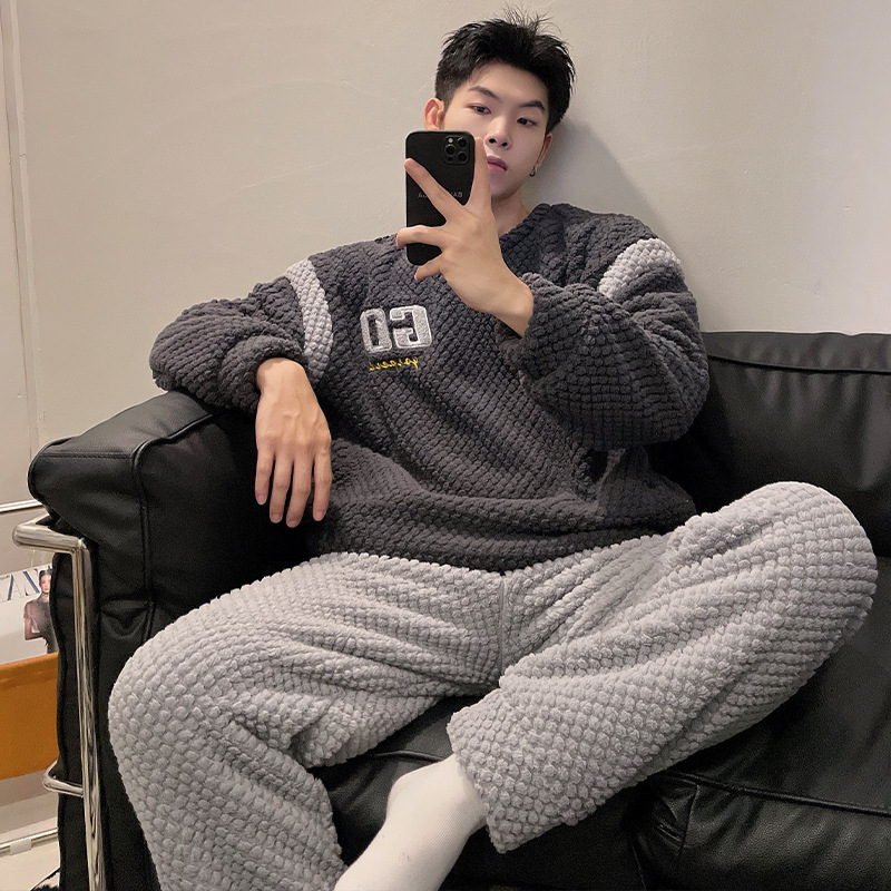 2024 겨울 새로운 플란넬 남성용 두꺼운 잠옷, 긴 소매와 바지, 플러시 홈웨어 세트 외부 착용 가능스토어 가기