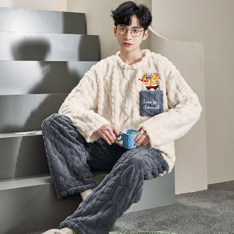 2024 겨울 새로운 플란넬 남성용 두꺼운 잠옷, 긴 소매와 바지, 플러시 홈웨어 세트 외부 착용 가능