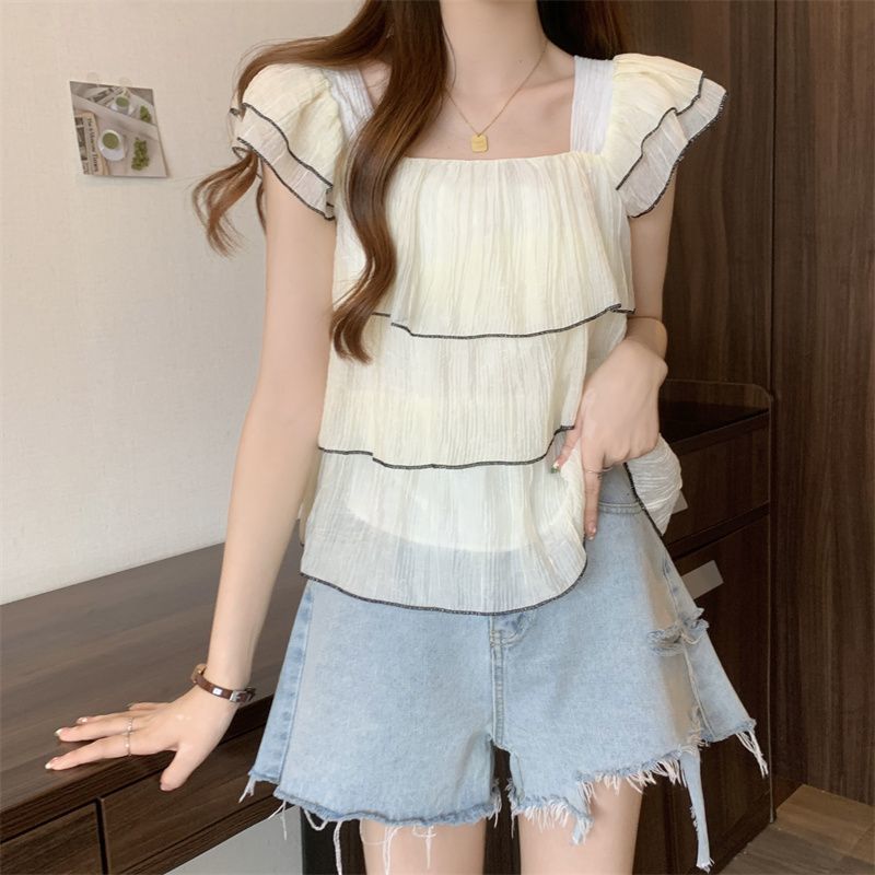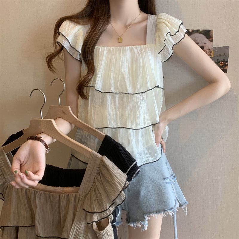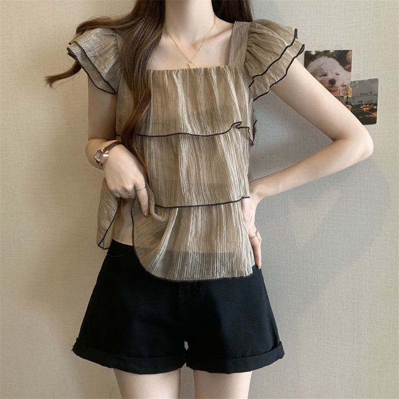 짧은 소매 쉬폰 셔츠 여성 여름 2025 새로운 광장 칼라 러플 인형 셔츠 배꼽 커버 짧은 작은 비행 슬리브 탑스토어 가기
