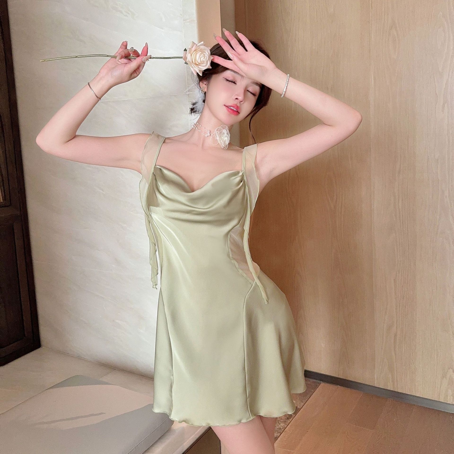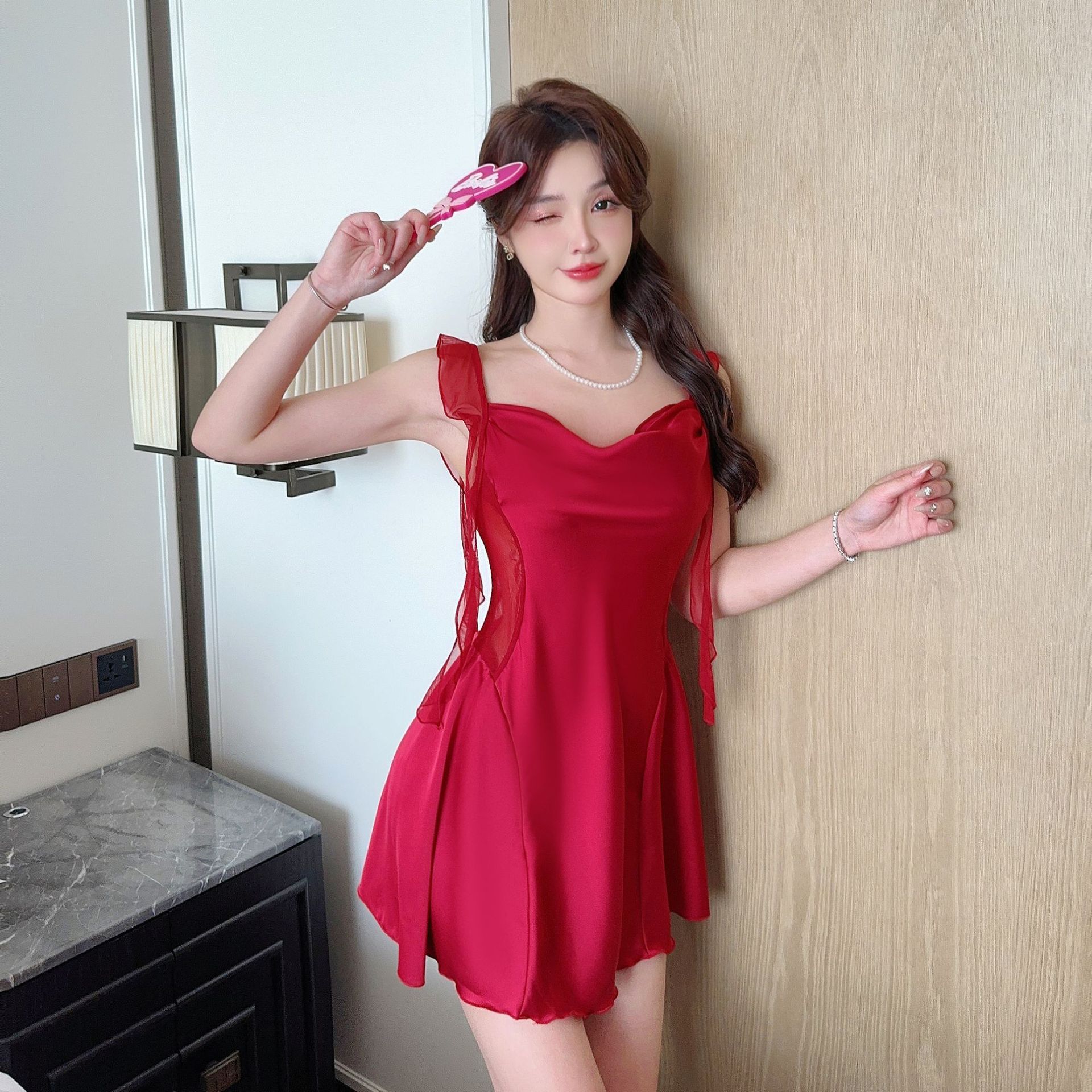 섹시한 잠옷 여성용 아이스 리본 가슴 패드 노출 실크 메쉬 레드 같은 스타일 2024 새로운 스타일 메쉬 슬링 나이트 가운 나이트 가운 외부 착용스토어 가기