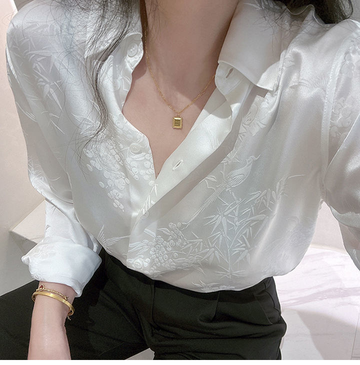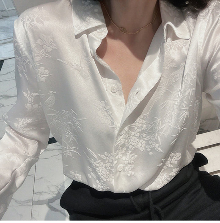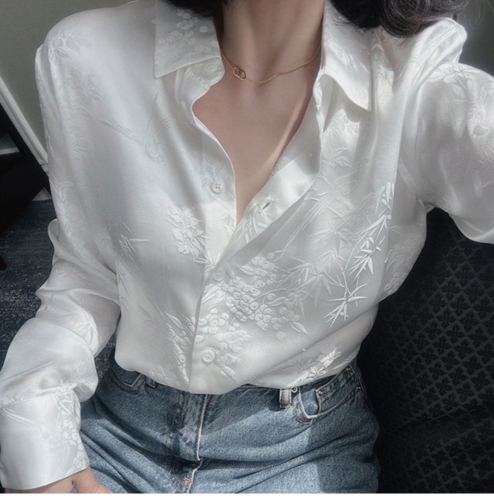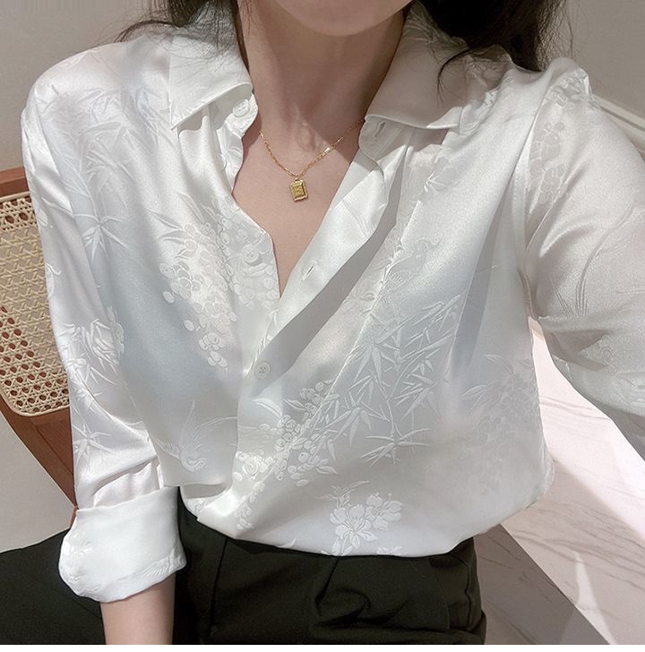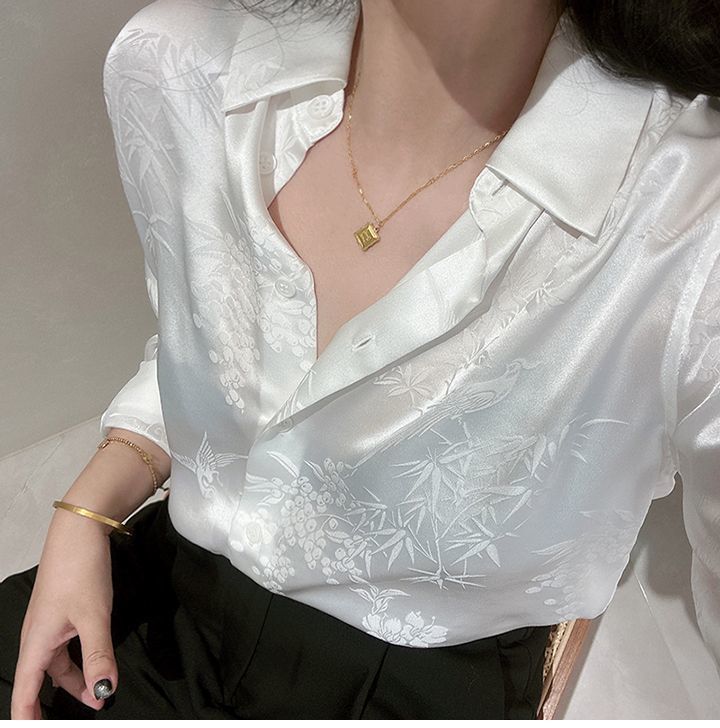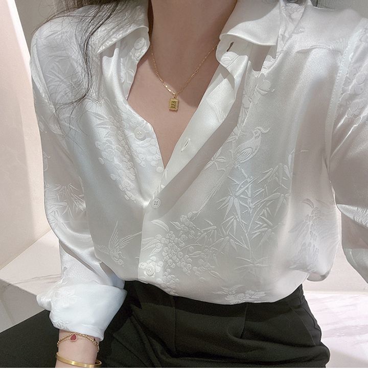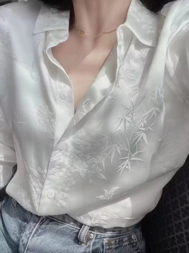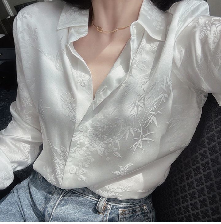 2025 새로운 빈티지 국립 스타일 새 대나무 숲 하이 엔드 자카드 다크 패턴 옷깃 폭발성 새틴 셔츠 최고 여성스토어 가기
