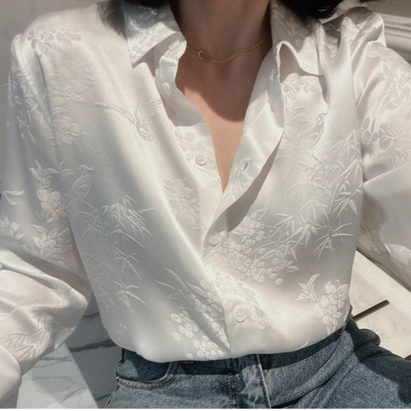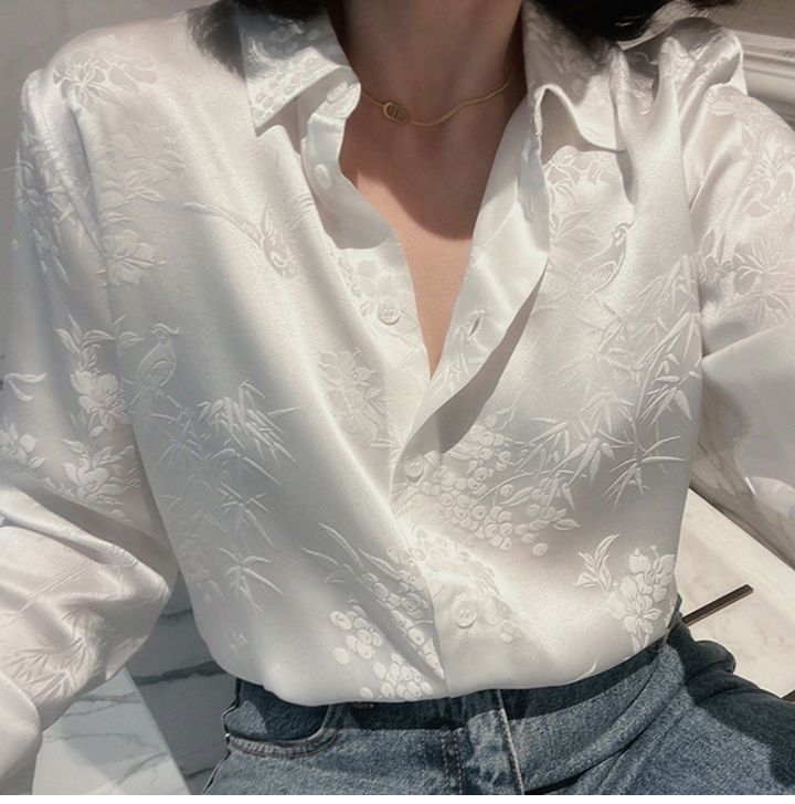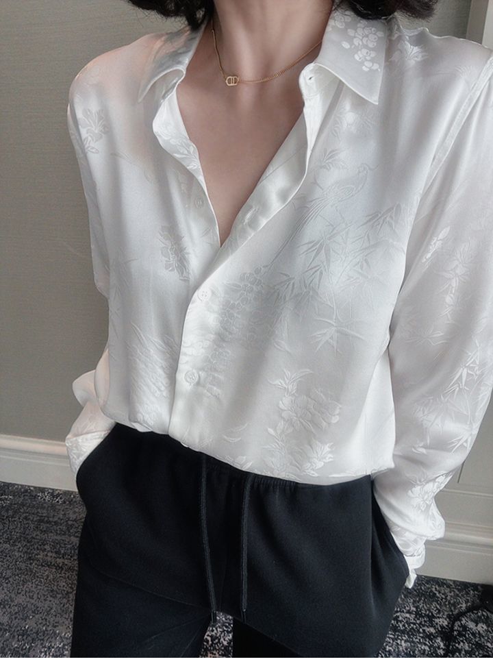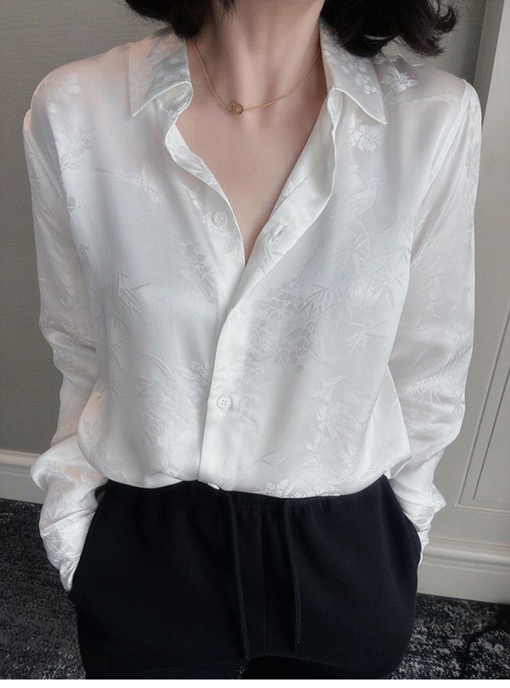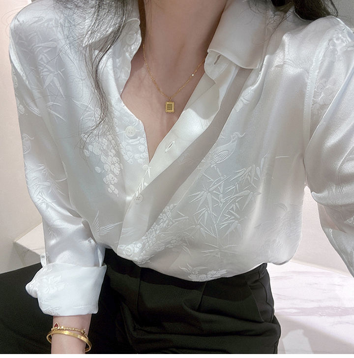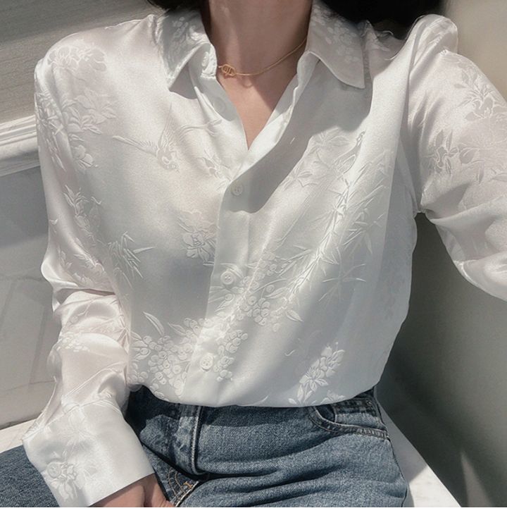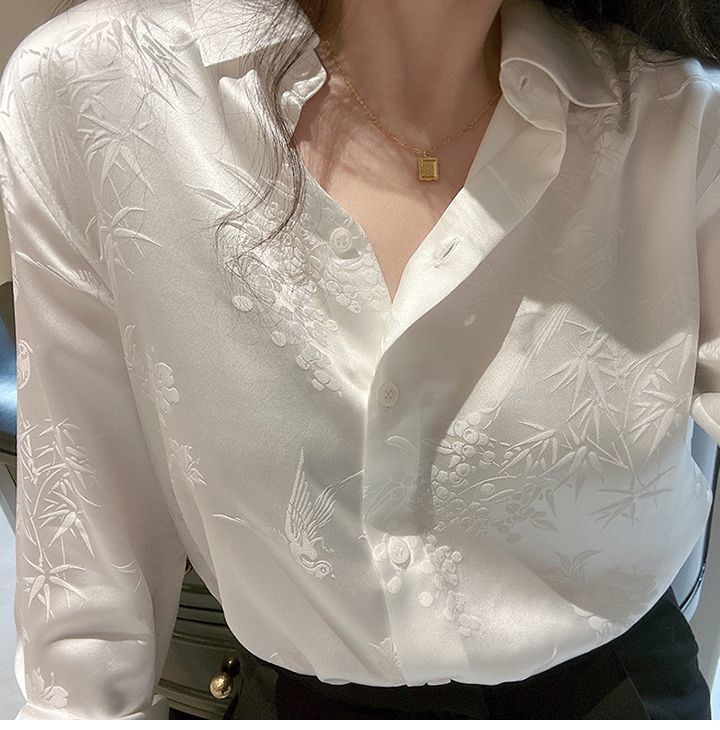 2025 새로운 빈티지 국립 스타일 새 대나무 숲 하이 엔드 자카드 다크 패턴 옷깃 폭발성 새틴 셔츠 최고 여성스토어 가기