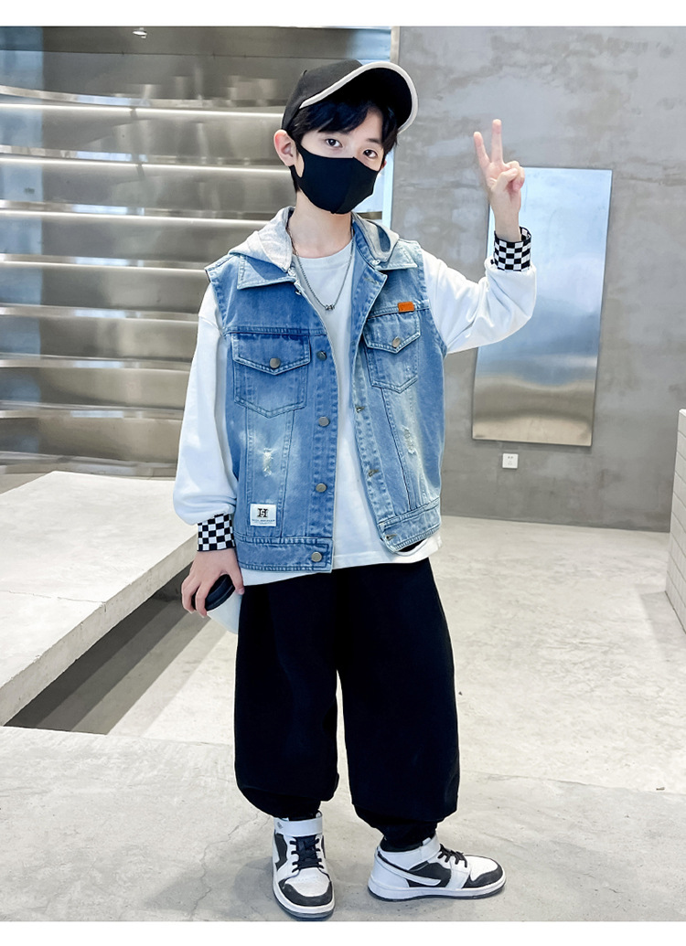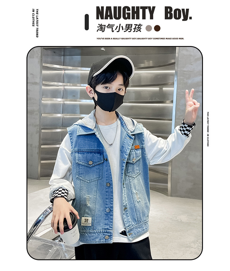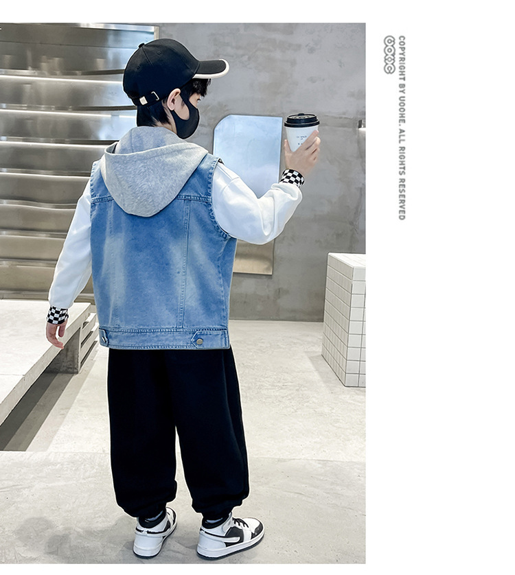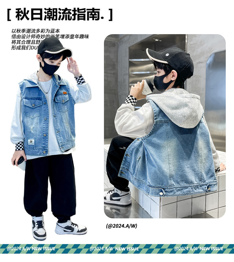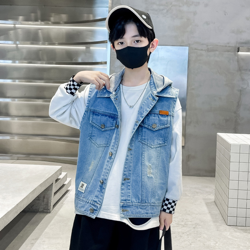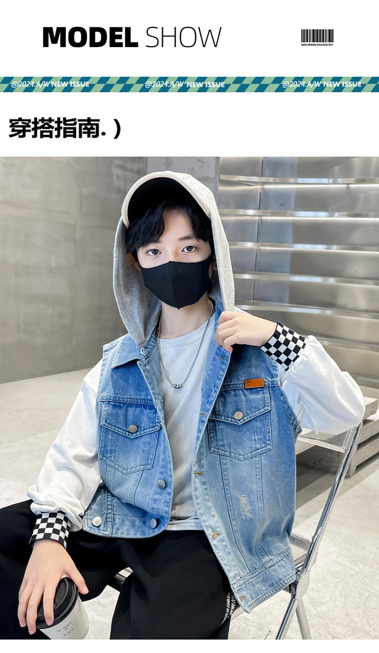 어린이 소년 베이비 데님 조끼 봄, 가을 겉옷 2025 한국어 버전 어린이 후드 루즈 조끼 도매스토어 가기