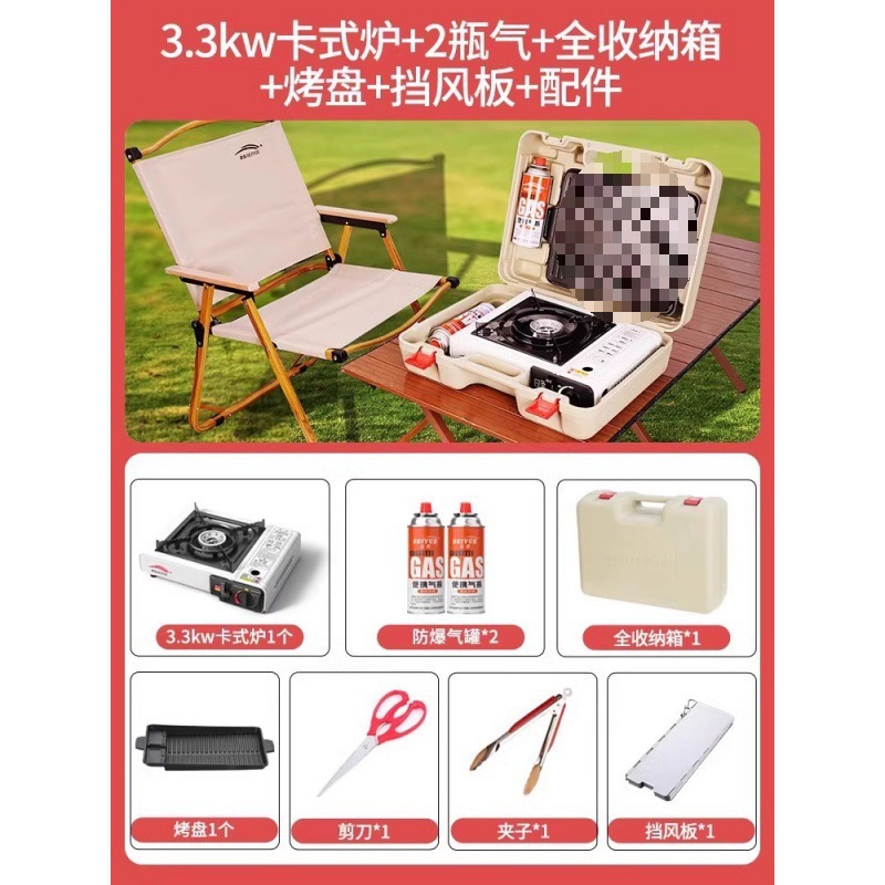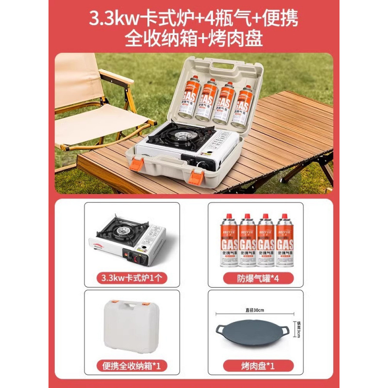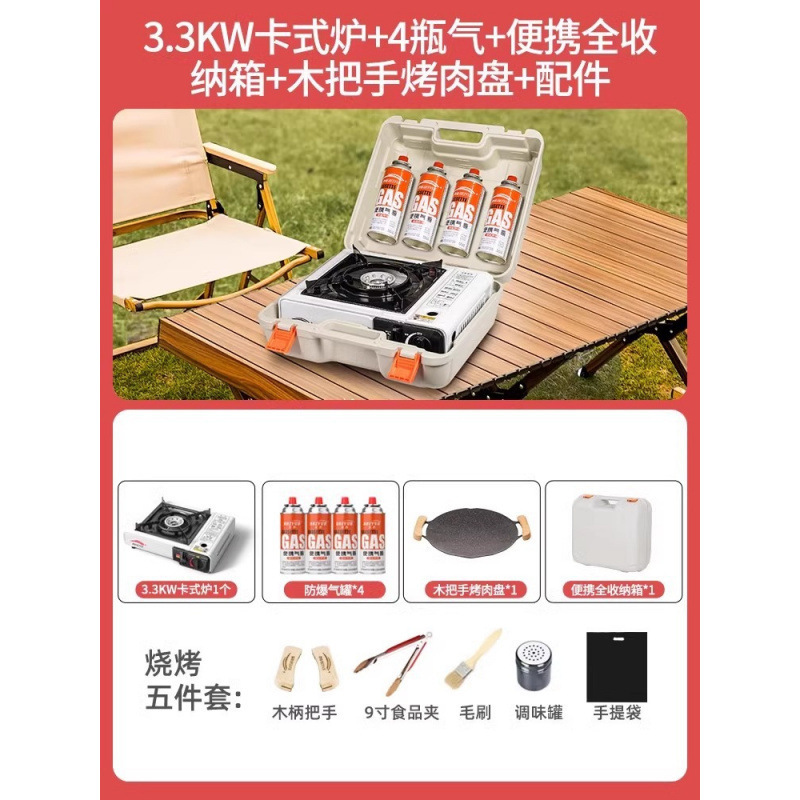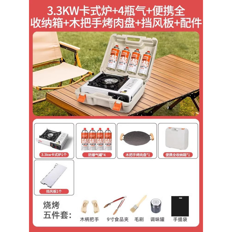 • 업그레이드된 카세트 스토브 + 가스 4병 + 휴대용 전체 보관함 + 나무 손잡이 바베큐 플레이트 + 앞유리 + 액세서리
