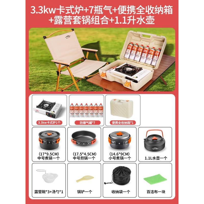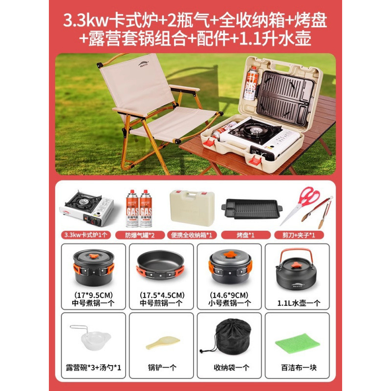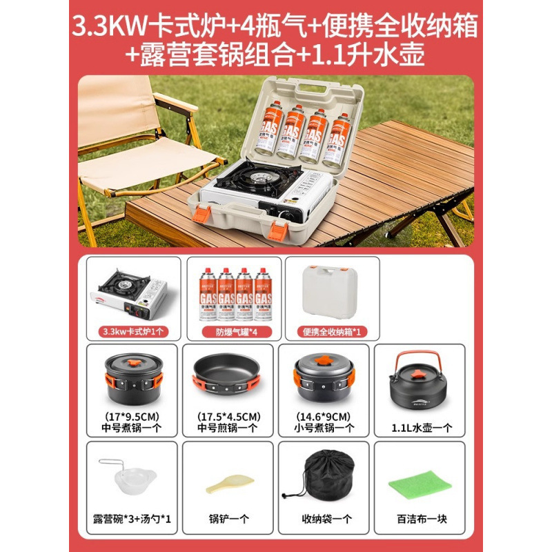 • 업그레이드된 카세트 스토브 + 가스 2병 + 풀 수납함 + 베이킹 팬 + 캠핑 냄비 세트 + 액세서리 + 1.1리터 주전자