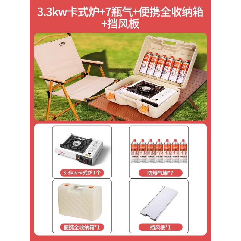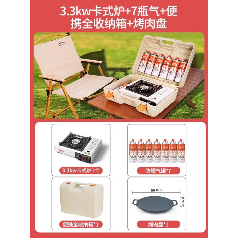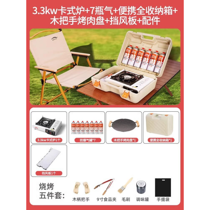 • 업그레이드된 카세트 스토브 + 가스 7병 + 휴대용 전체 보관함 + 나무 손잡이 바베큐 플레이트 + 앞유리 + 액세서리