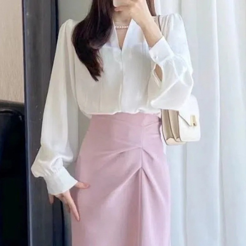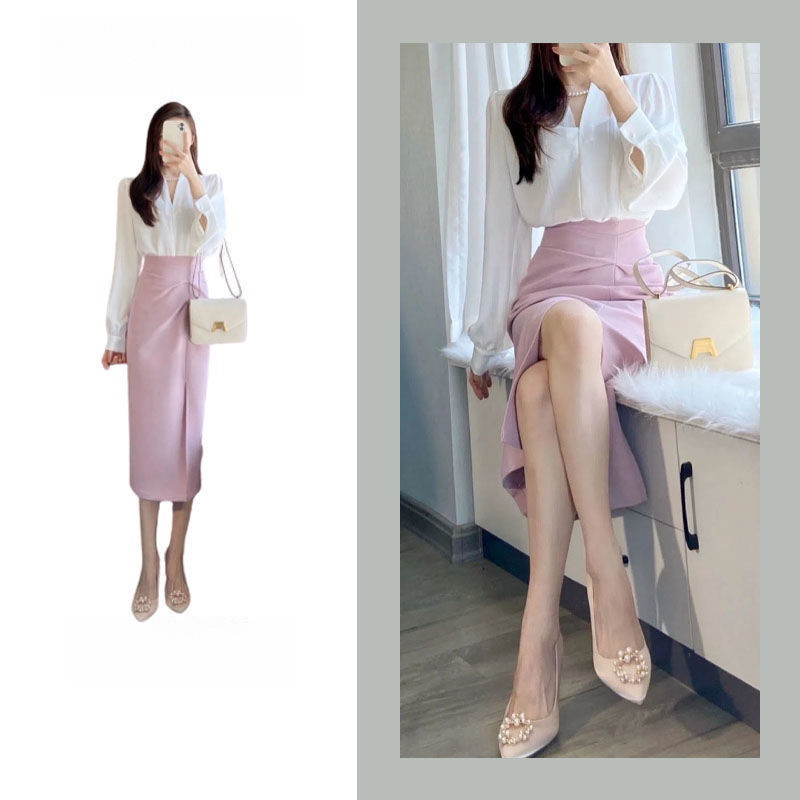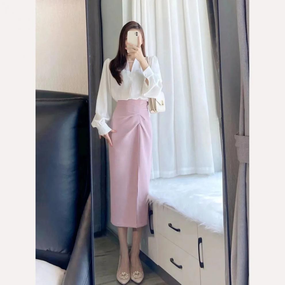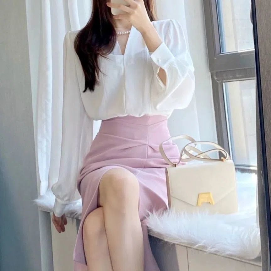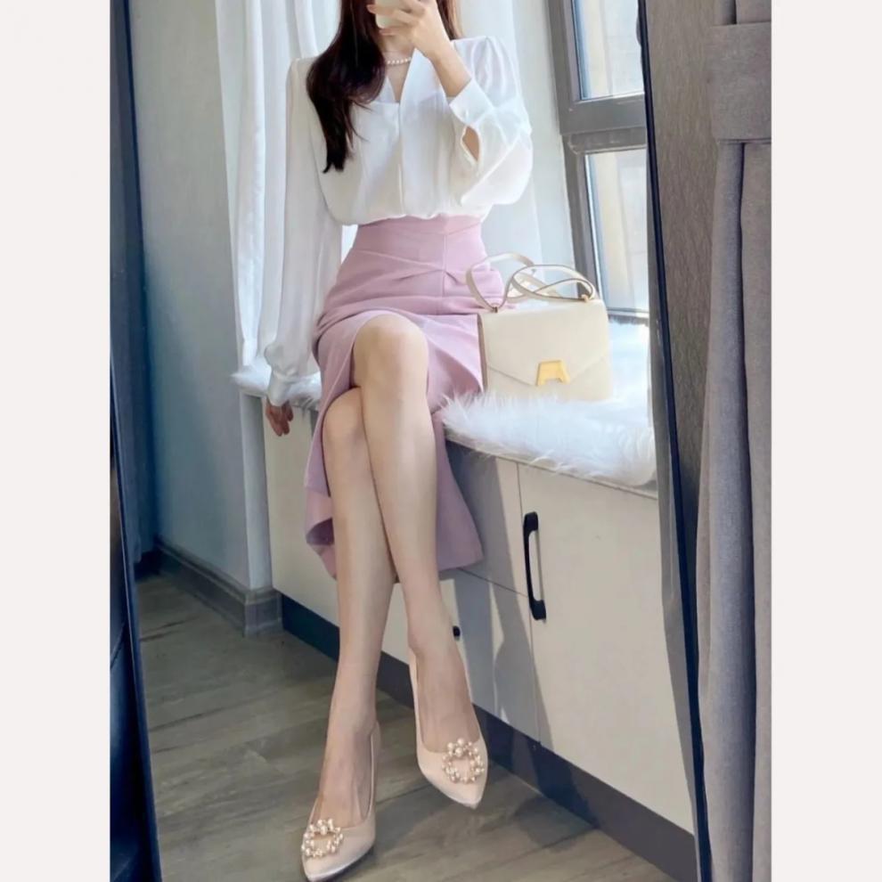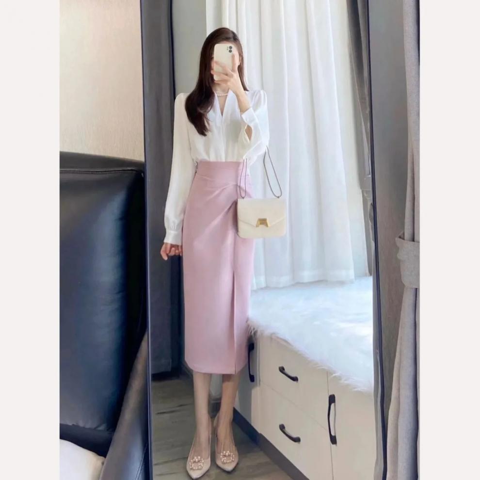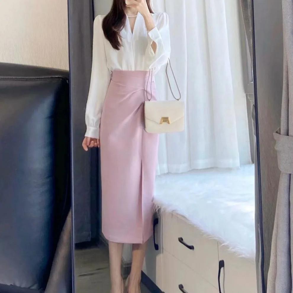 새로운 봄 높은 허리 핑크 스커트 투피스 우아한 여신 팬 전문 통근자 착용 셔츠 세트 여성