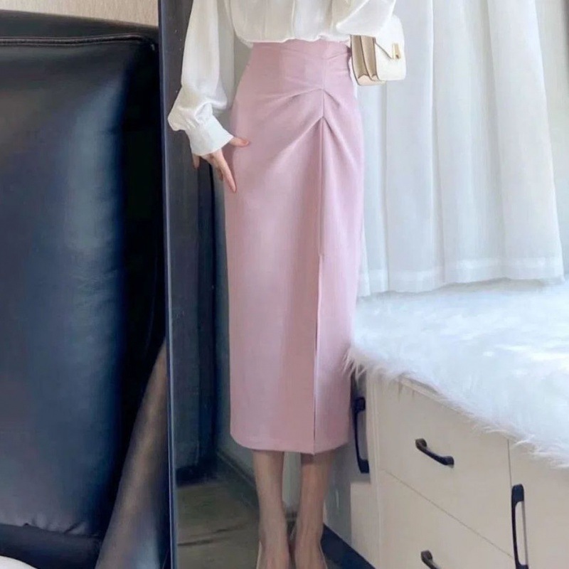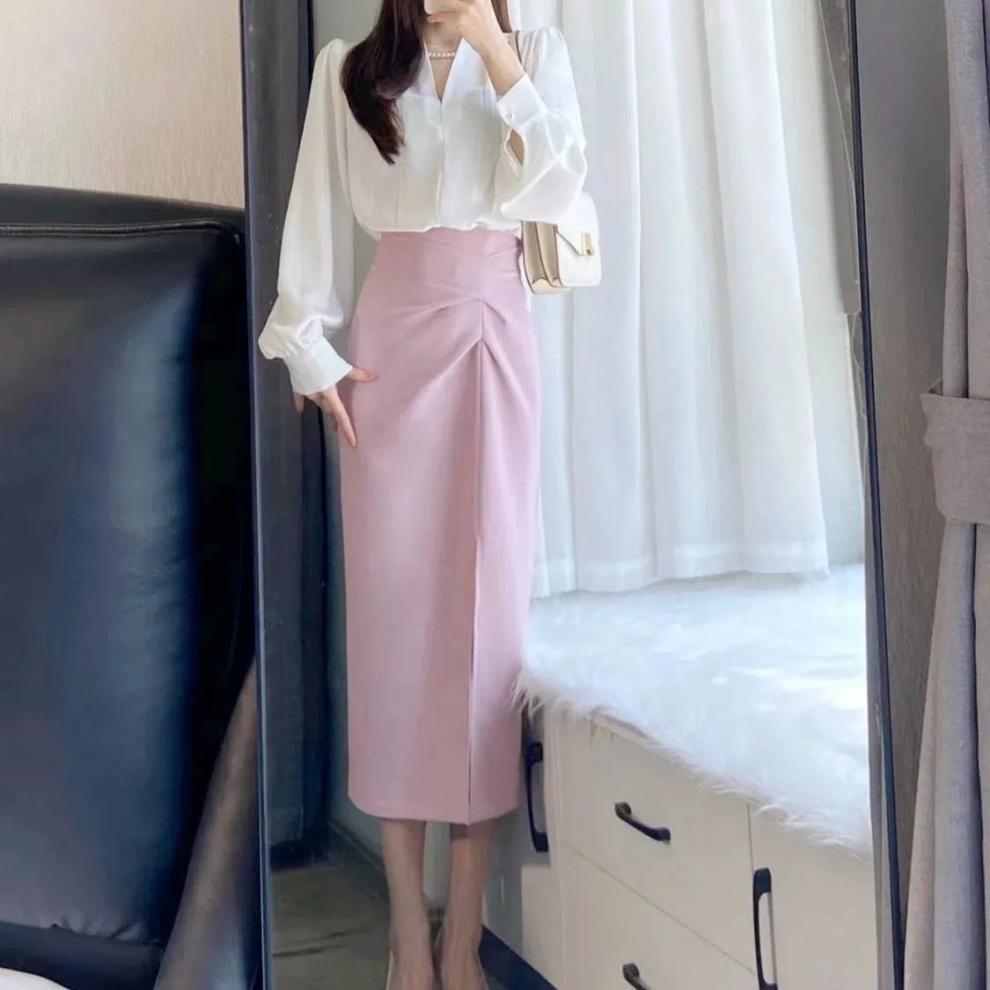 새로운 봄 높은 허리 핑크 스커트 투피스 우아한 여신 팬 전문 통근자 착용 셔츠 세트 여성스토어 가기