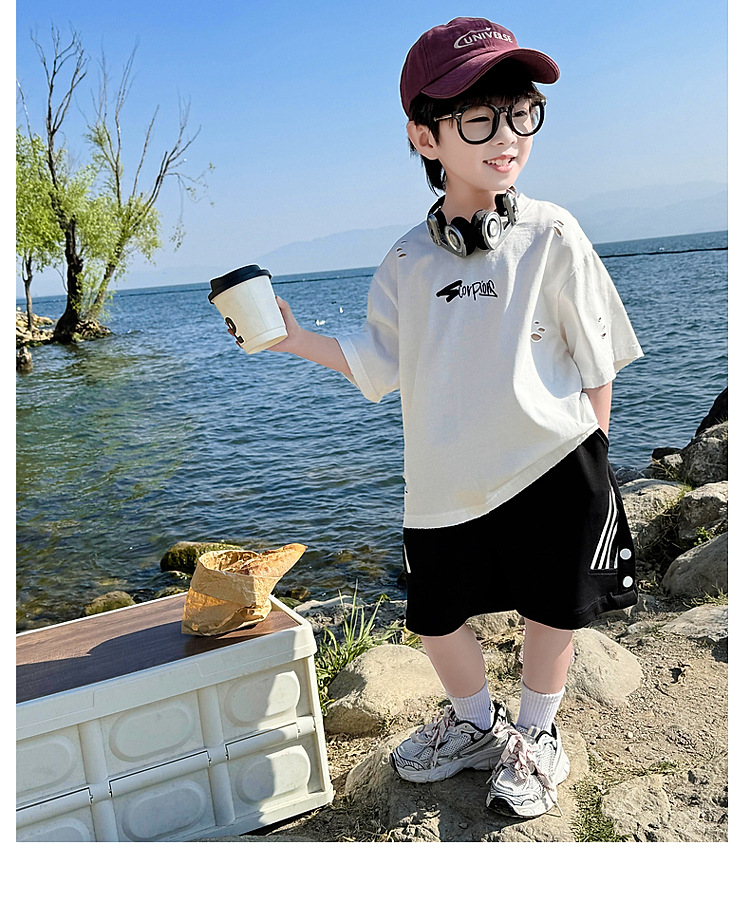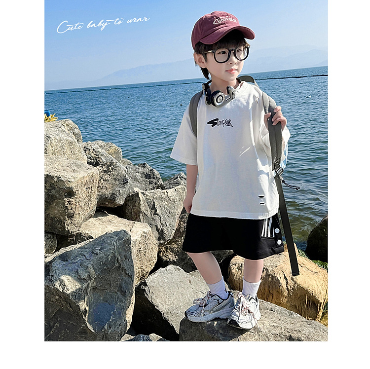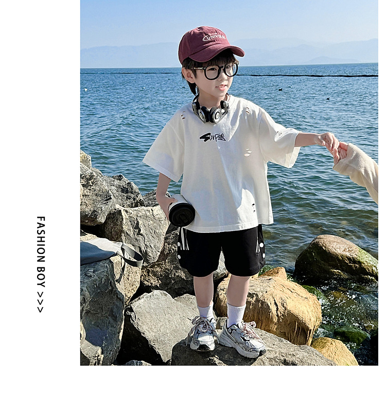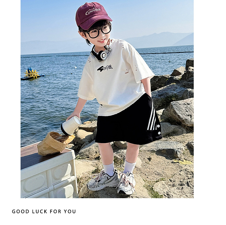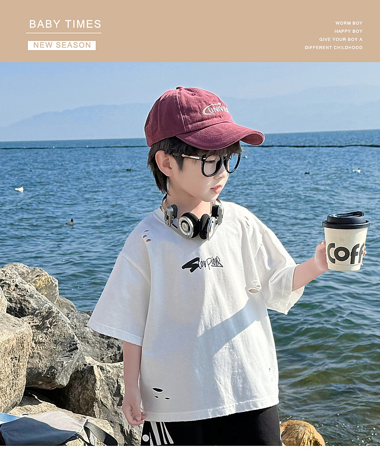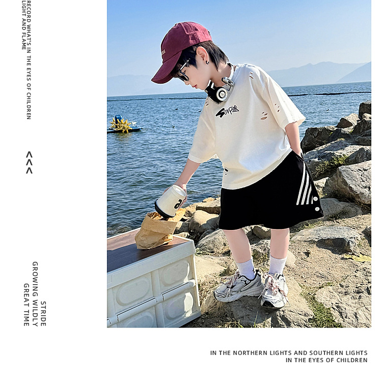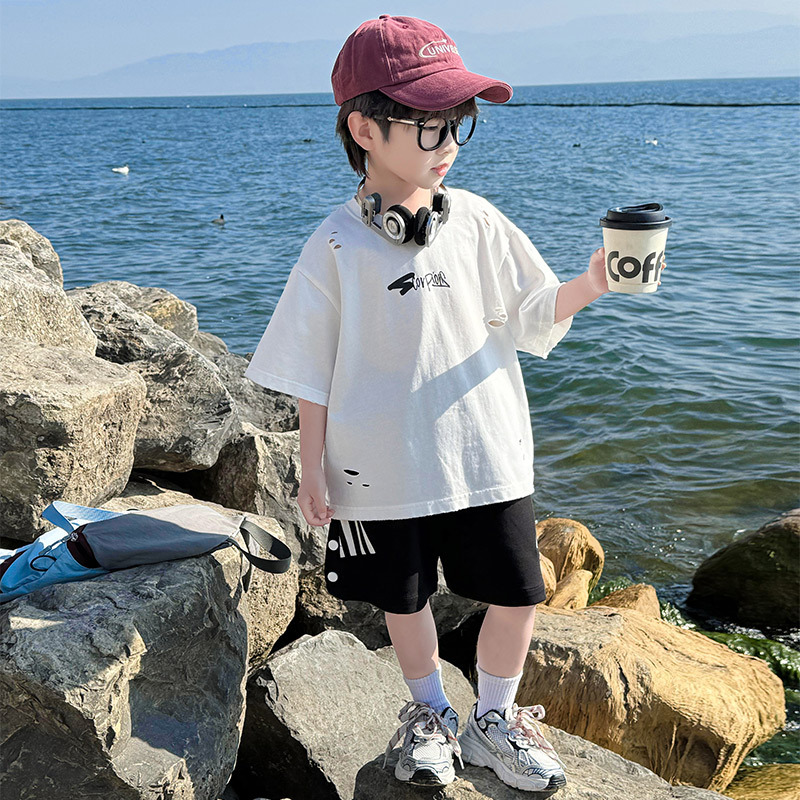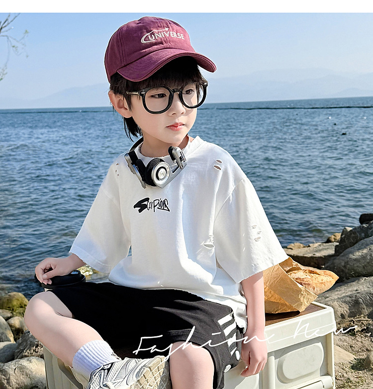 남자들의 여름 반팔 티셔츠 2025 새로운 어린이 여름 서양식 화이트 플루톤 핸섬 톱 보이즈의 느슨한 여름