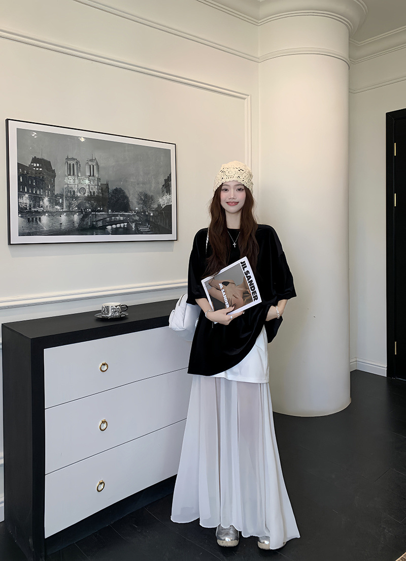 [5480 컬렉션] 느슨한 벨벳 반팔 티셔츠 슬림 메쉬 스커트 여성 2025 년 착용 휴식스토어 가기