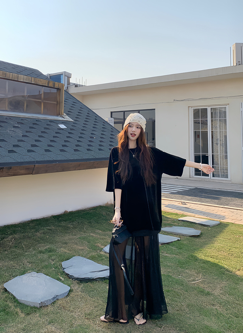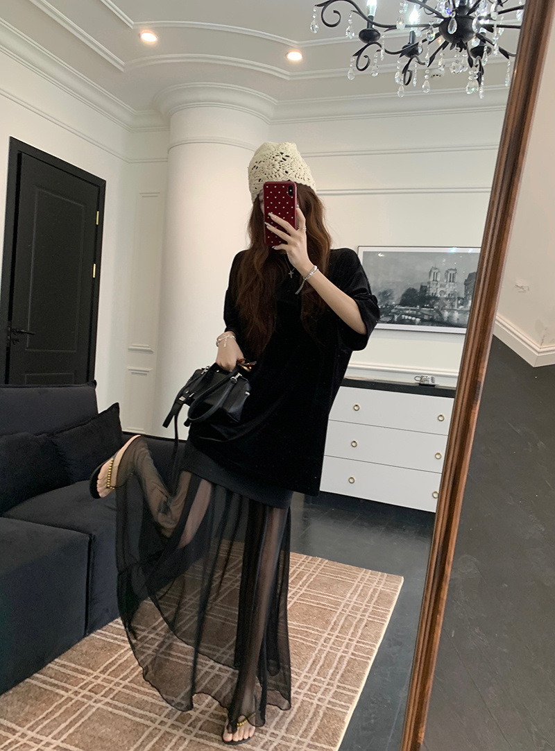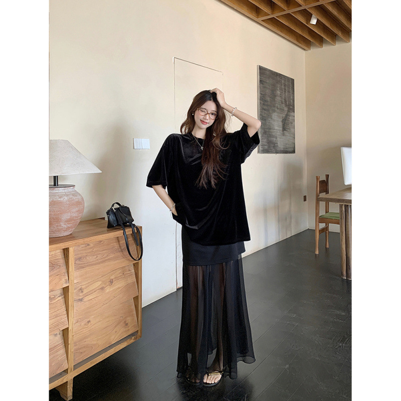 [5480 컬렉션] 느슨한 벨벳 반팔 티셔츠 슬림 메쉬 스커트 여성 2025 년 착용 휴식