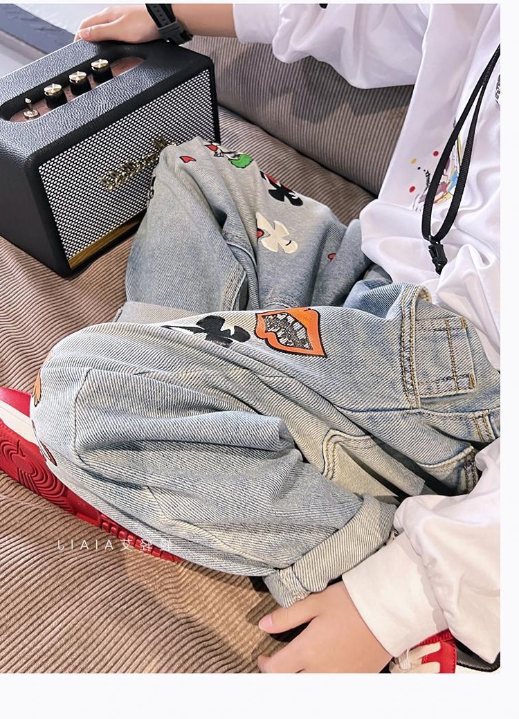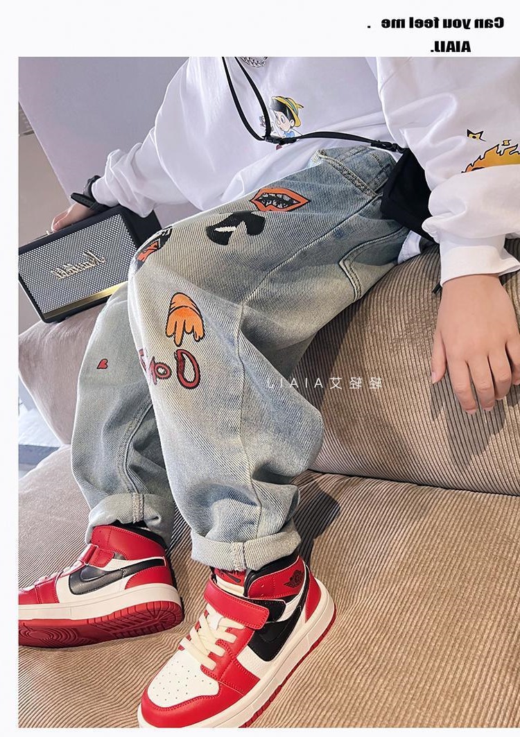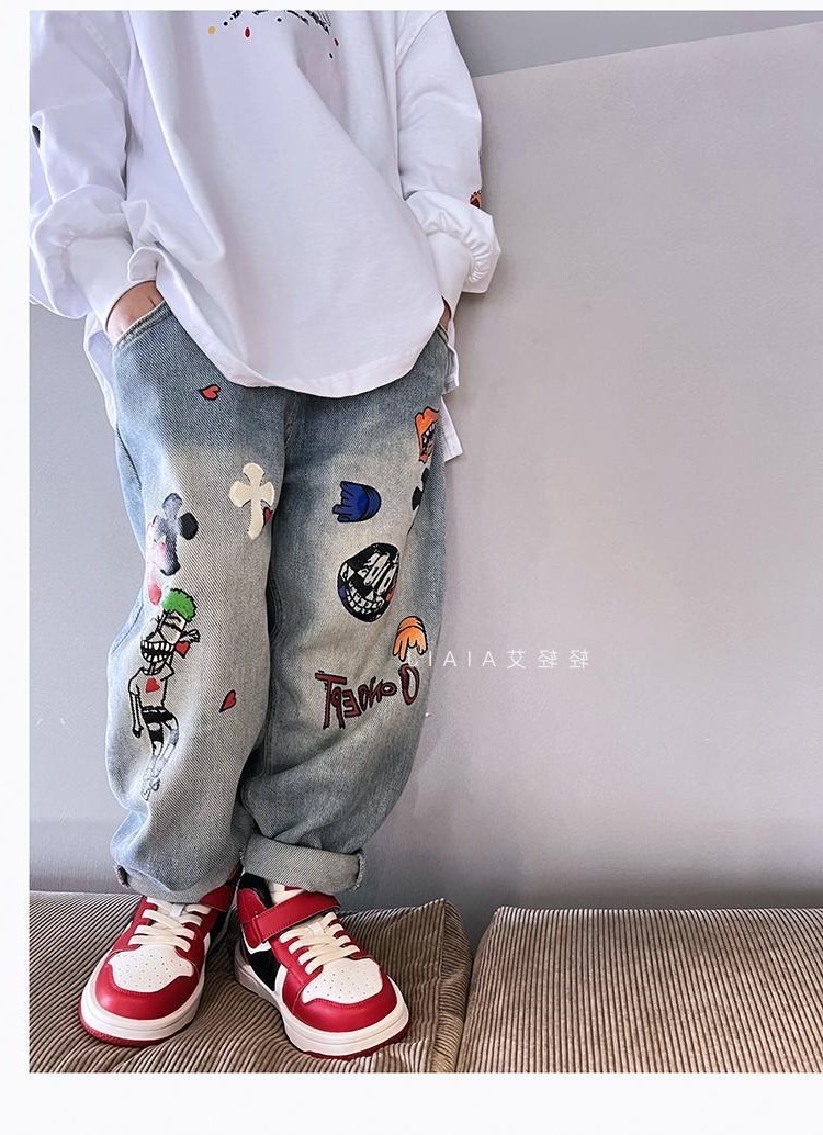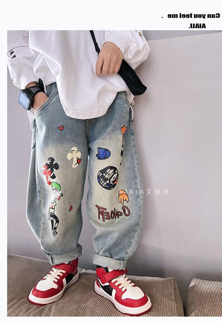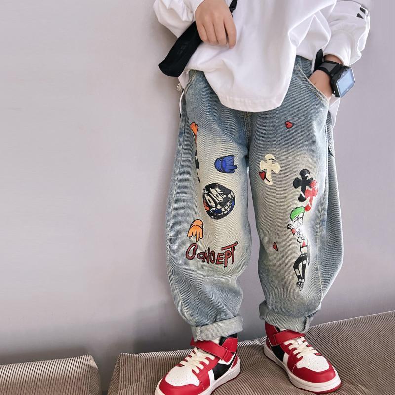 아동용 그래피티 청바지, 봄, 가을 스타일, 다재다능한 남아용 바지, 루즈한 새해맞이 의류, 중대형 아동용 가을, 겨울 바지스토어 가기