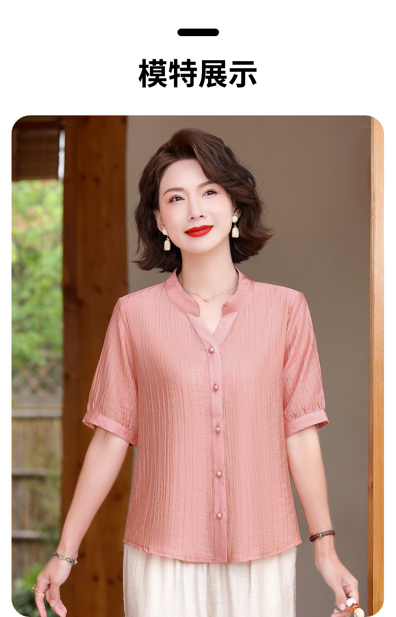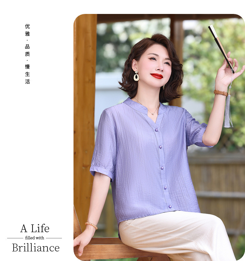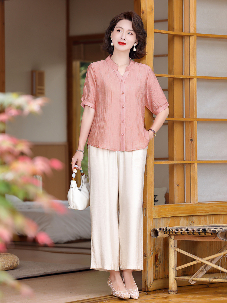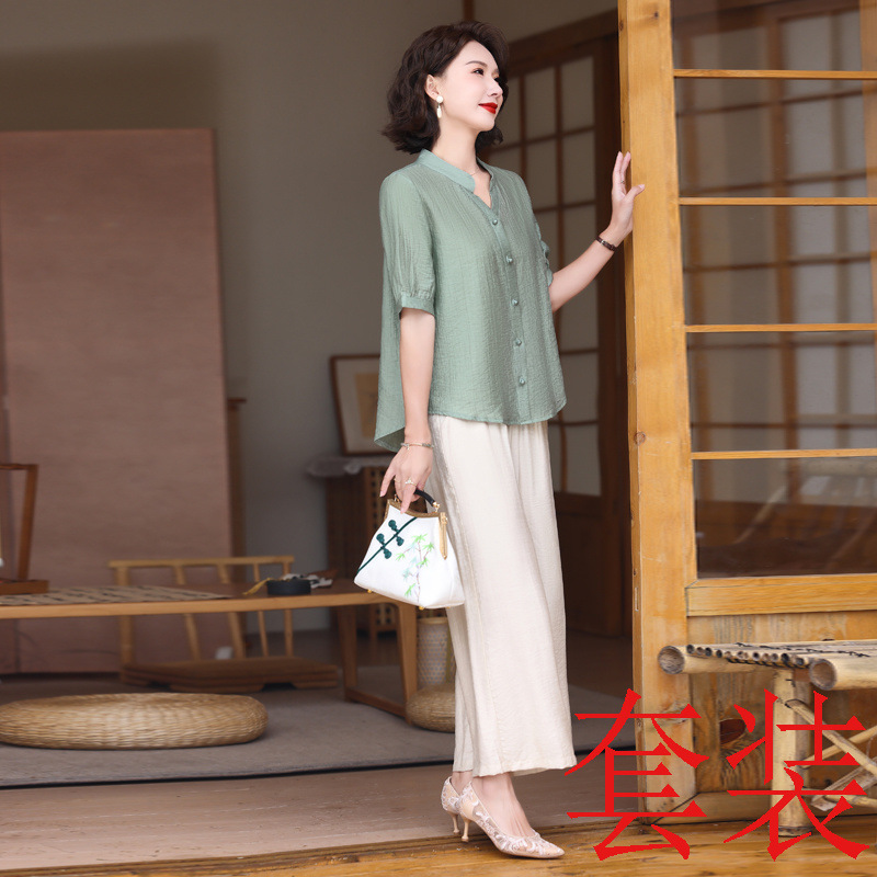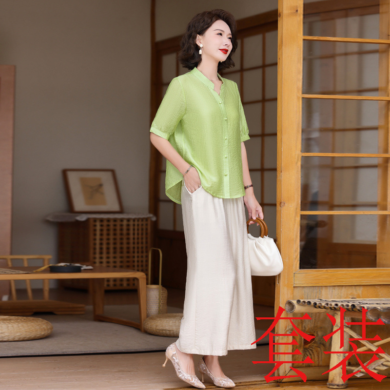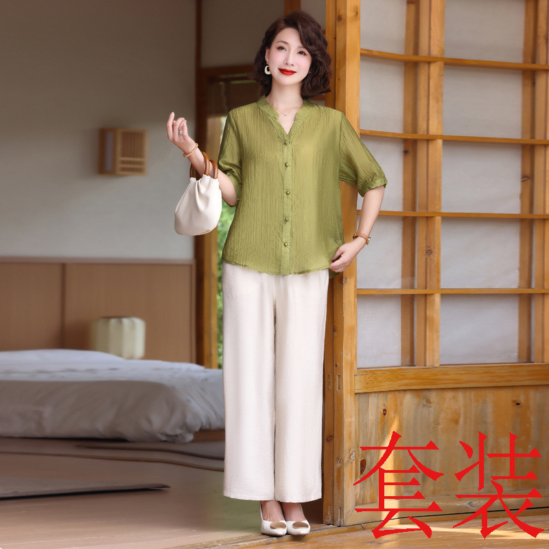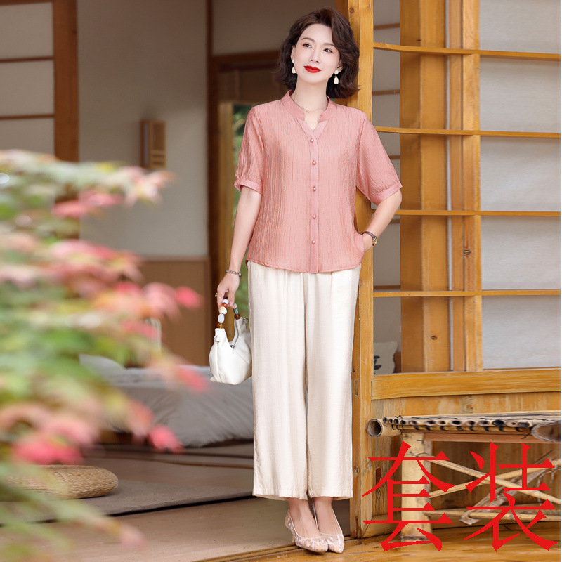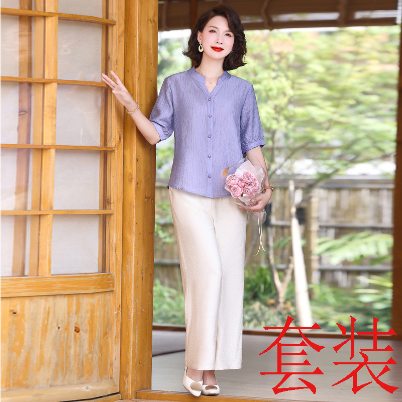 젊은 어머니의 투피스 여름 반팔 작은 셔츠 2024 새로운 외국식 중년 및 노인 여성 텐셀 셔츠 세트
