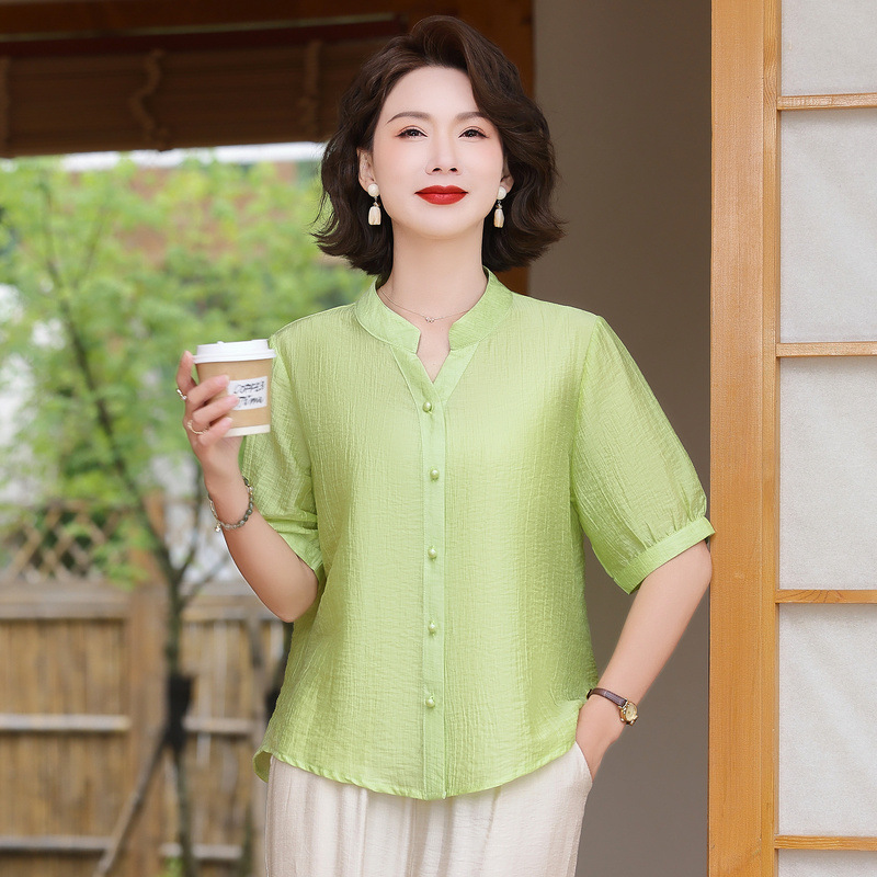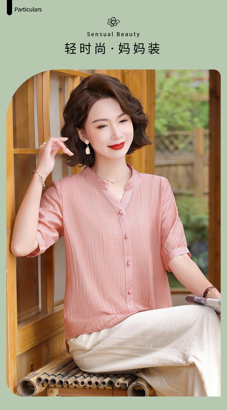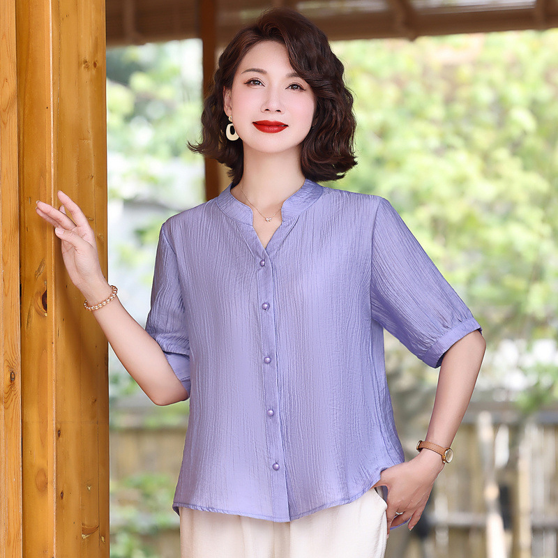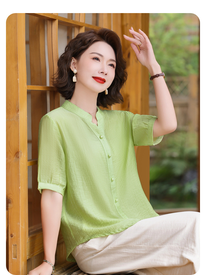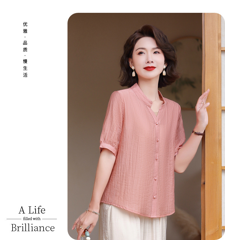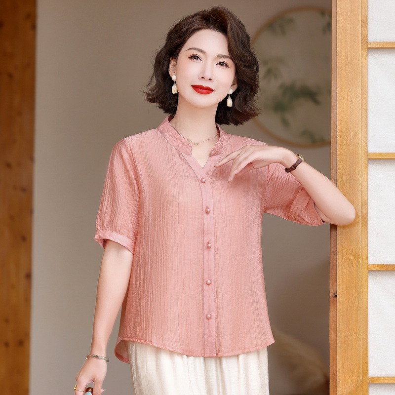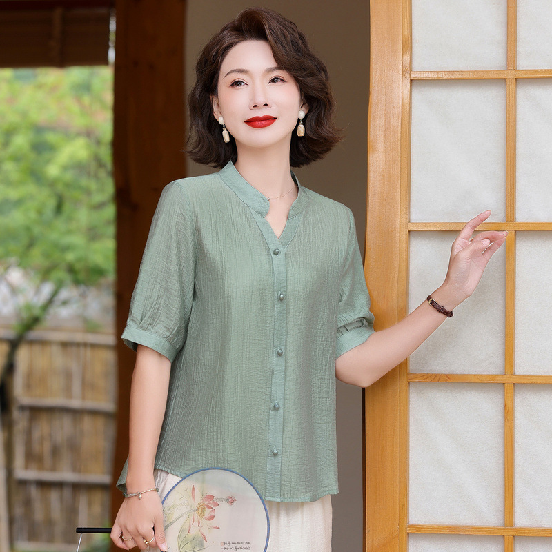 젊은 어머니의 투피스 여름 반팔 작은 셔츠 2024 새로운 외국식 중년 및 노인 여성 텐셀 셔츠 세트
