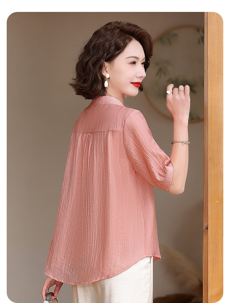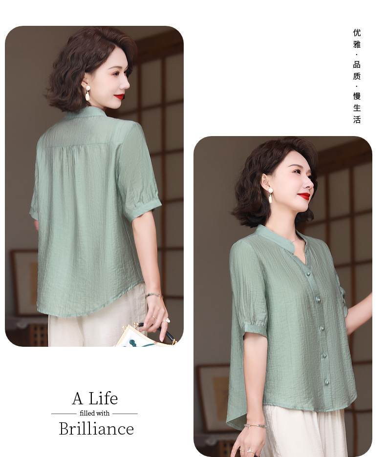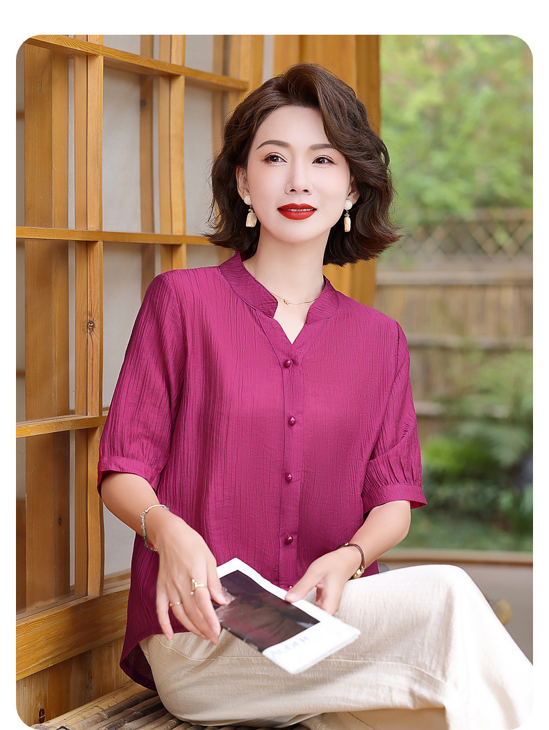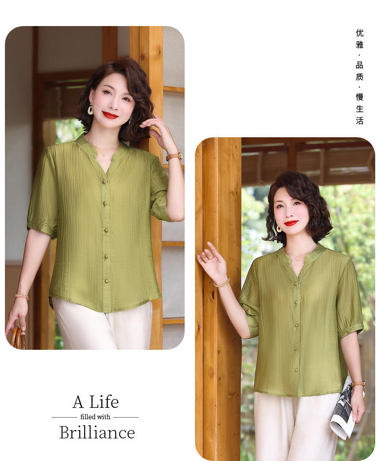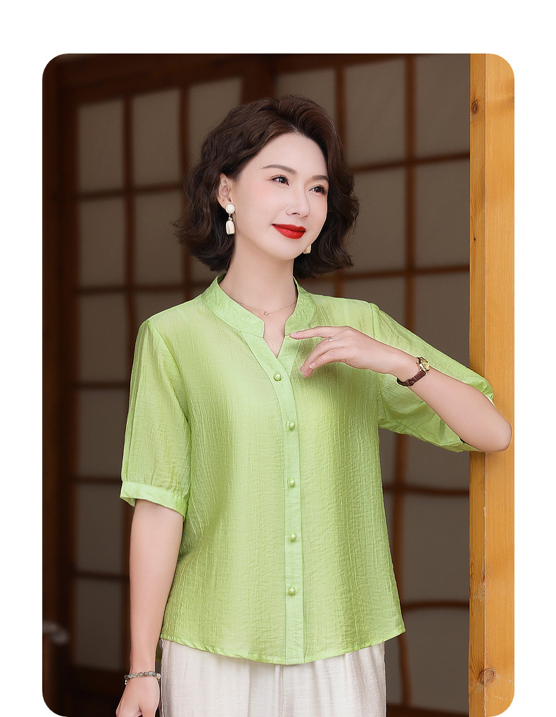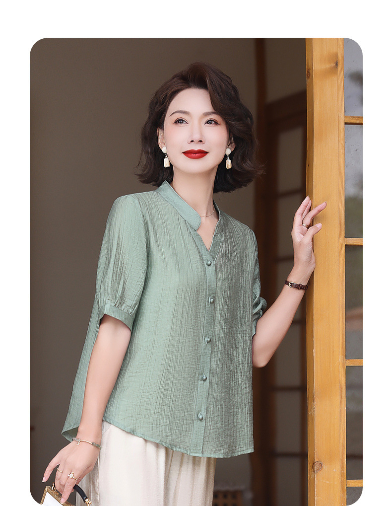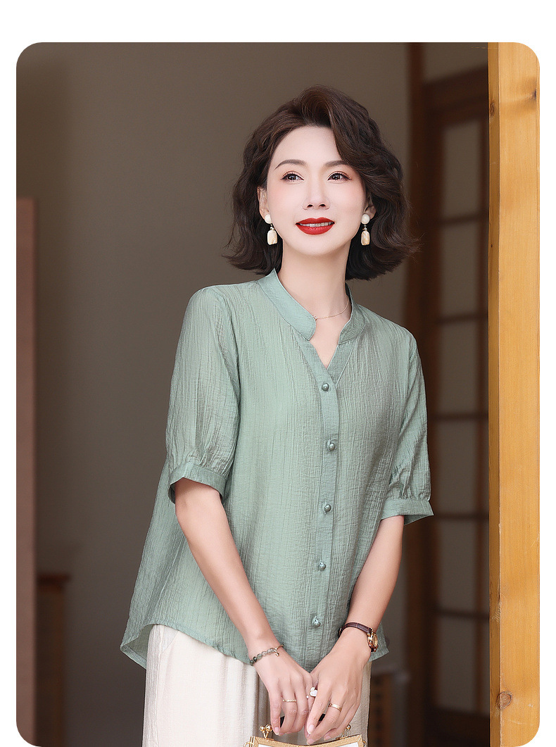 젊은 어머니의 투피스 여름 반팔 작은 셔츠 2024 새로운 외국식 중년 및 노인 여성 텐셀 셔츠 세트