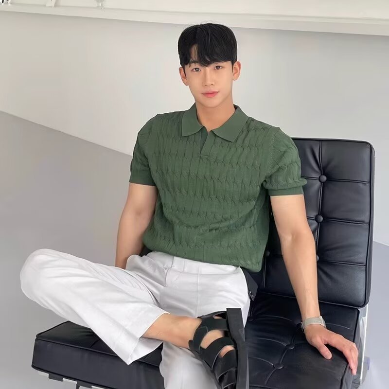 여름 반팔 폴로 남성 하이 엔드 한국 스타일 슬림 라펠 솔리드 컬러 캐주얼 얇은 반팔 니트 탑 트렌디스토어 가기