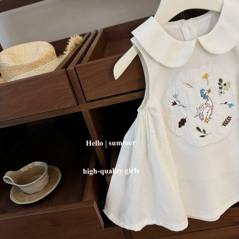 여자 프렌치 스타일 원피스 2025 여름 자수 꽃 데칼 민소매 원피스 아기 소녀 유행 얇은 옷깃 스커트스토어 가기