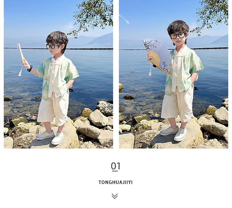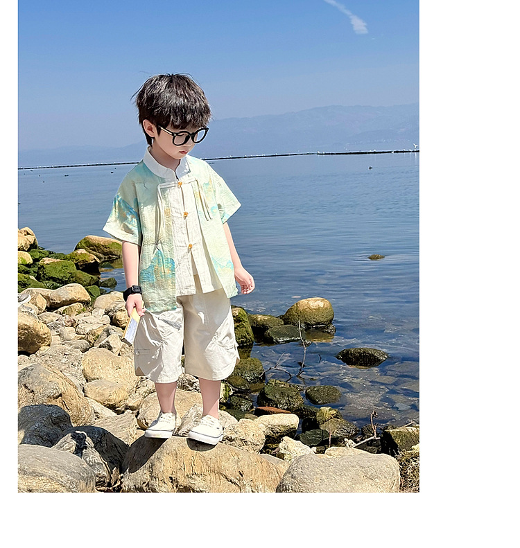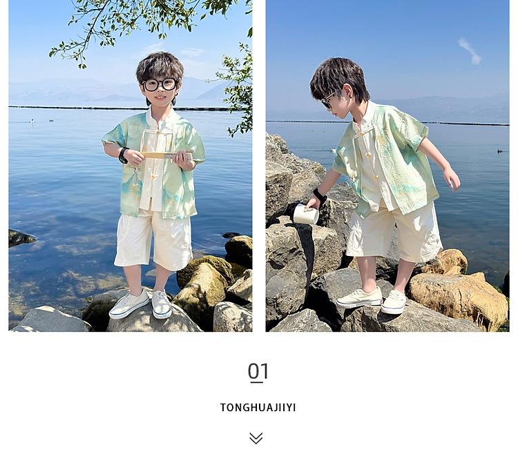 소년의 여름 옷 한푸 세트 2025 새로운 어린이 서양식 중국 스타일 탕 세트 소년을위한 새로운 중국 짧은 소매스토어 가기