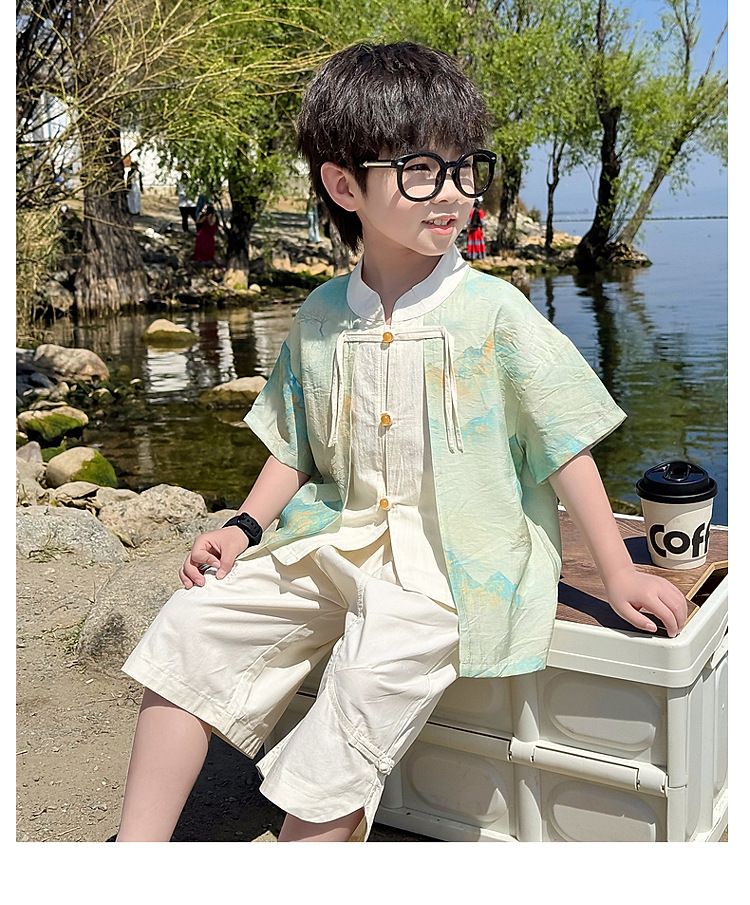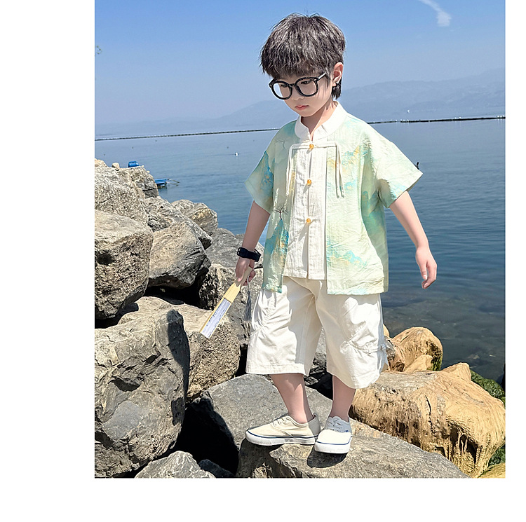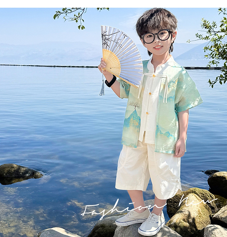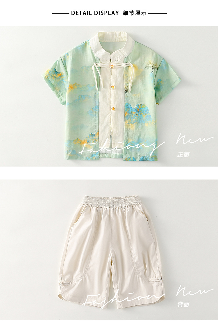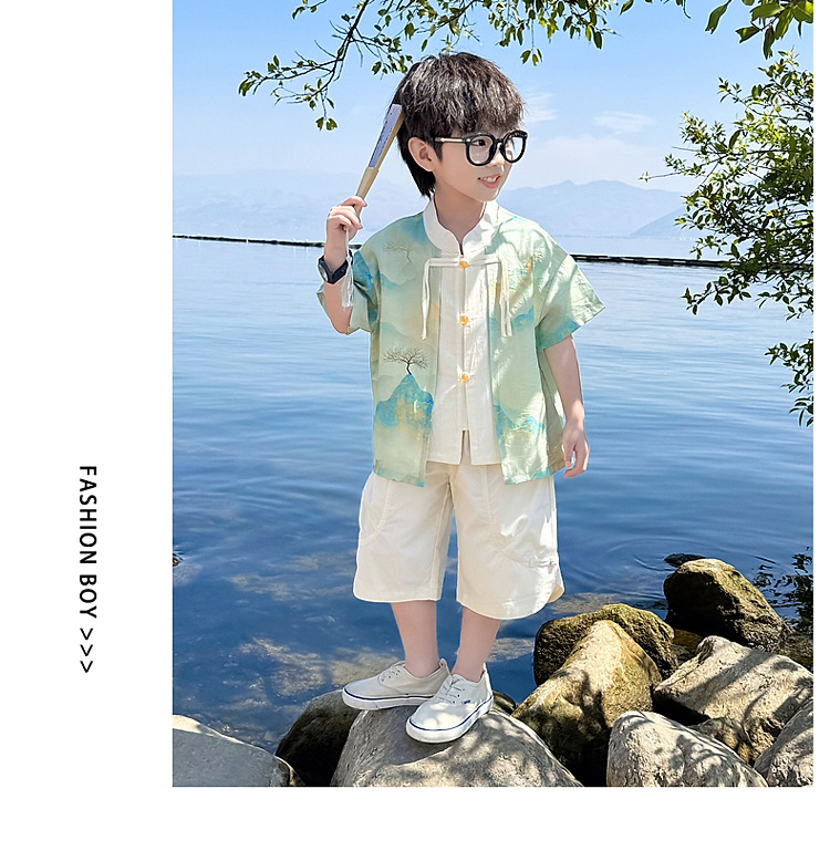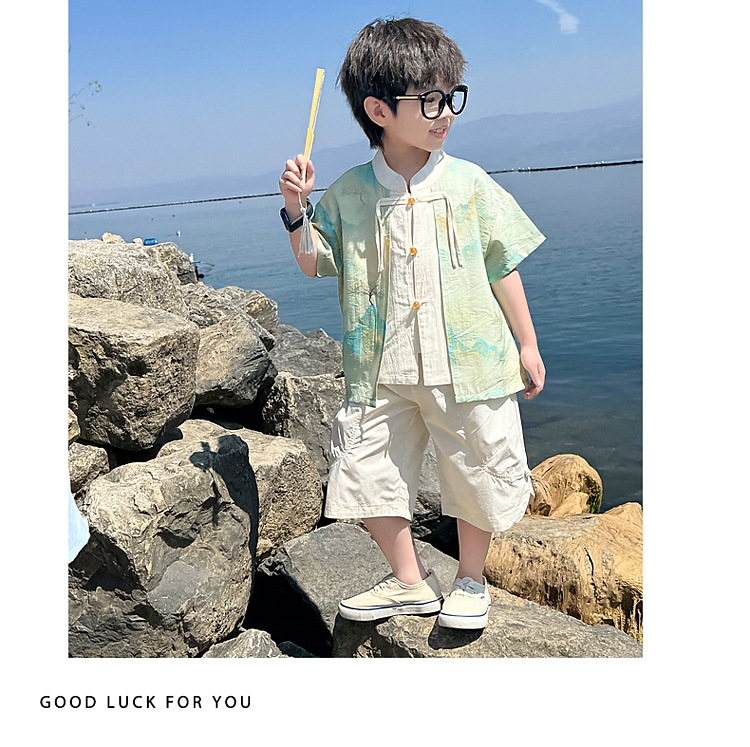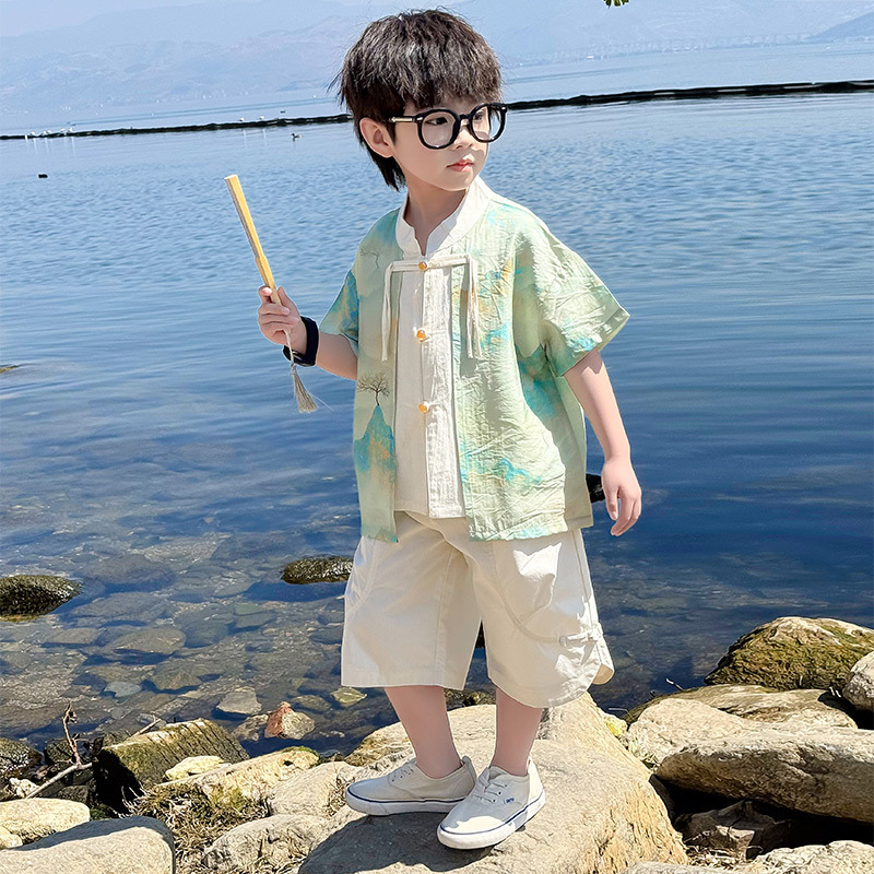 소년의 여름 옷 한푸 세트 2025 새로운 어린이 서양식 중국 스타일 탕 세트 소년을위한 새로운 중국 짧은 소매
