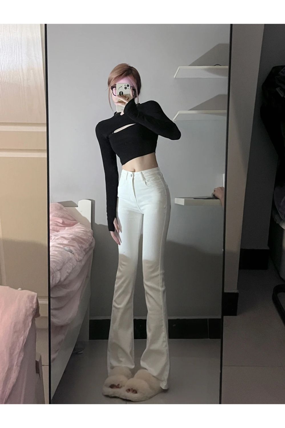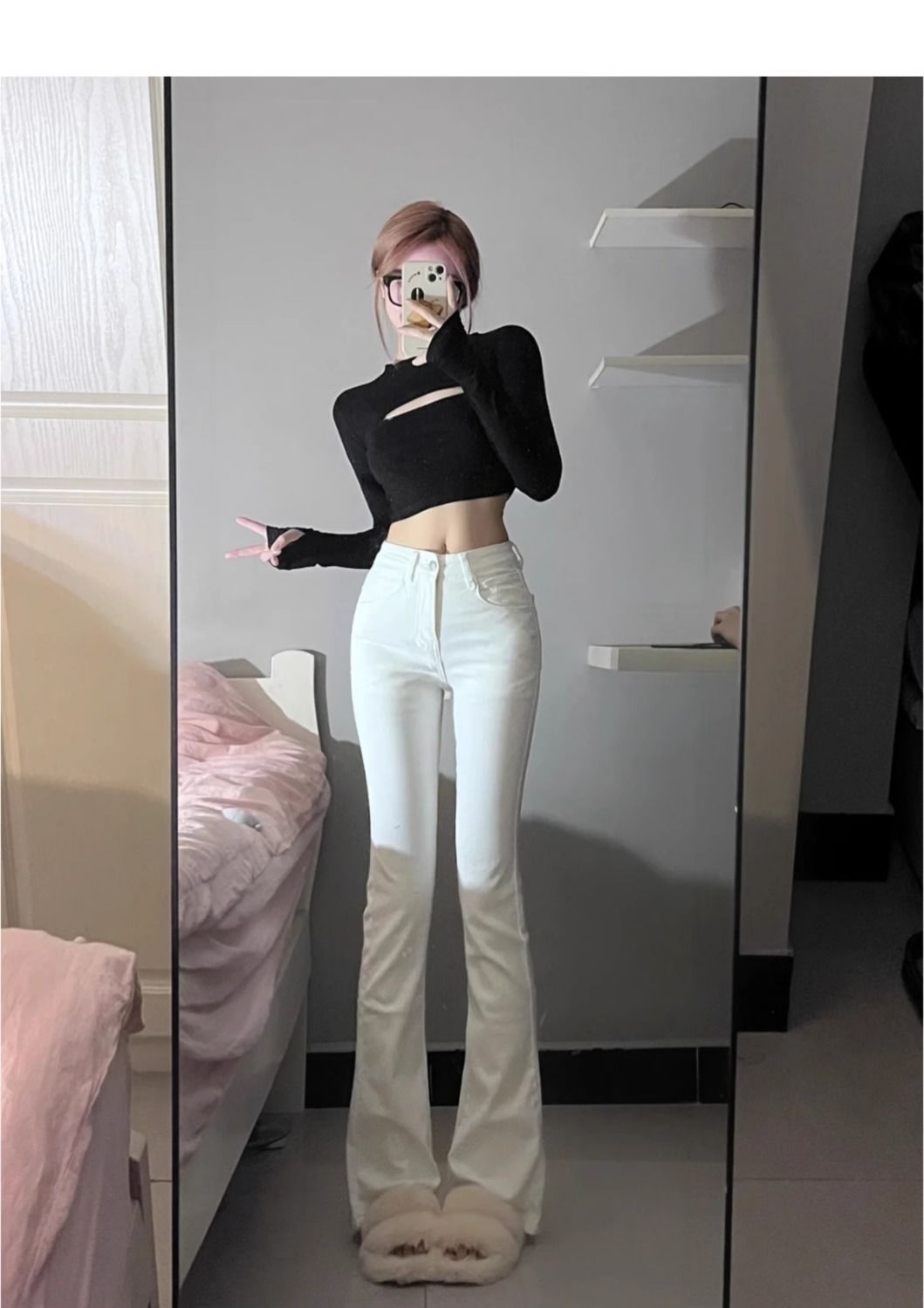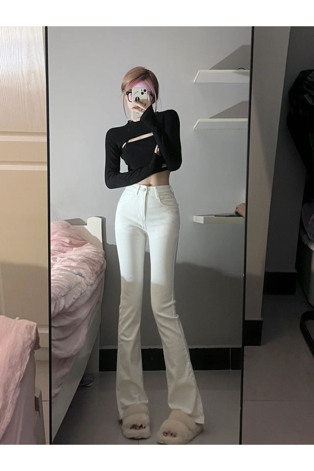 여성용 화이트 마이크로 플레어 청바지 2024 봄, 가을 새로운 스타일 하이 웨이스트 슬림 스트레치 소형 바닥 길이 말굽 바지스토어 가기