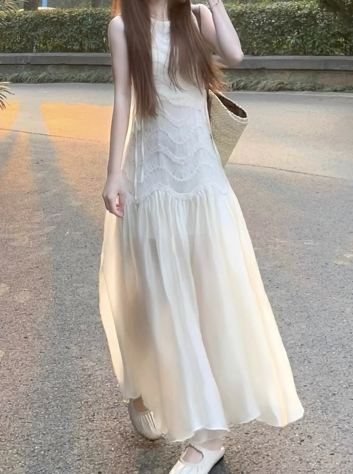 흰색 원피스 민소매 디자인 틈새 부드러운 편안한 패션 레이스 캐주얼 휴일 스커트 여성