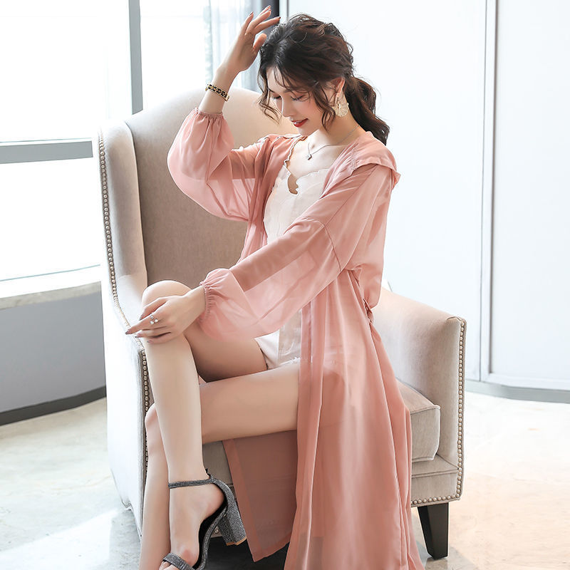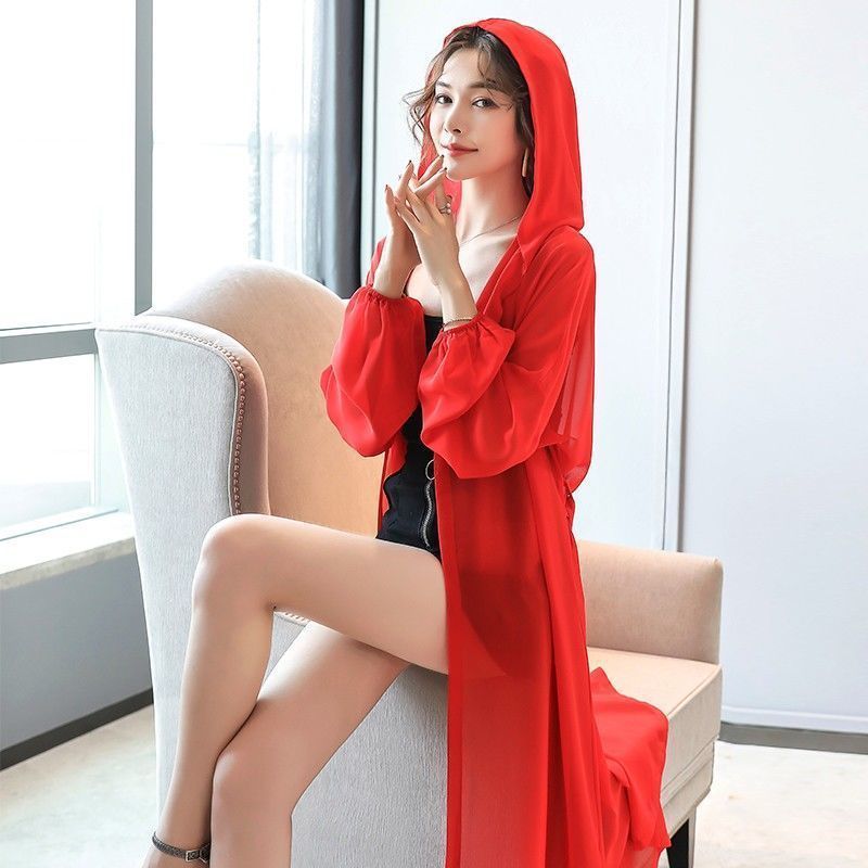 시폰 후드 썬 보호 의류 여성 중간 길이의 레이스 업 Ins 슈퍼 인기있는 솔리드 컬러 에어컨 카디건 패셔너블 숄 얇은 코트