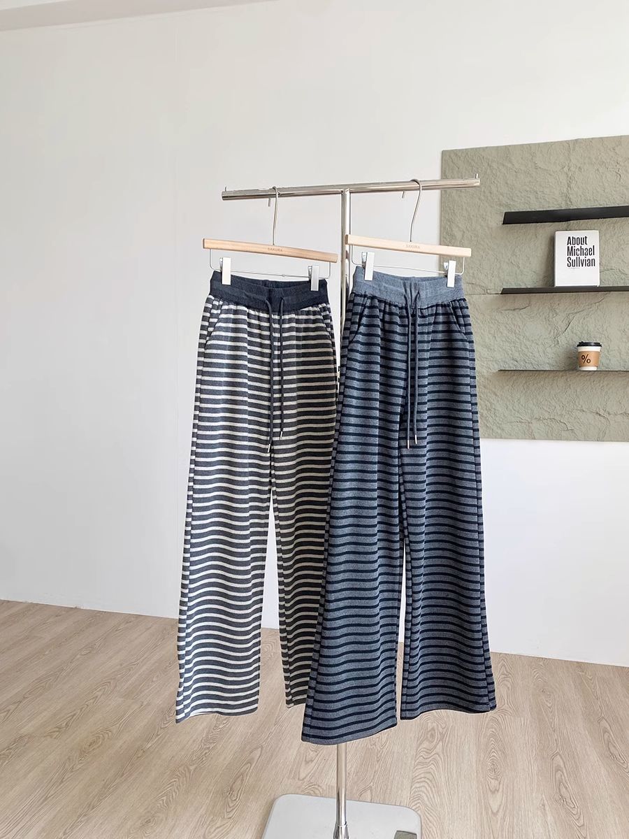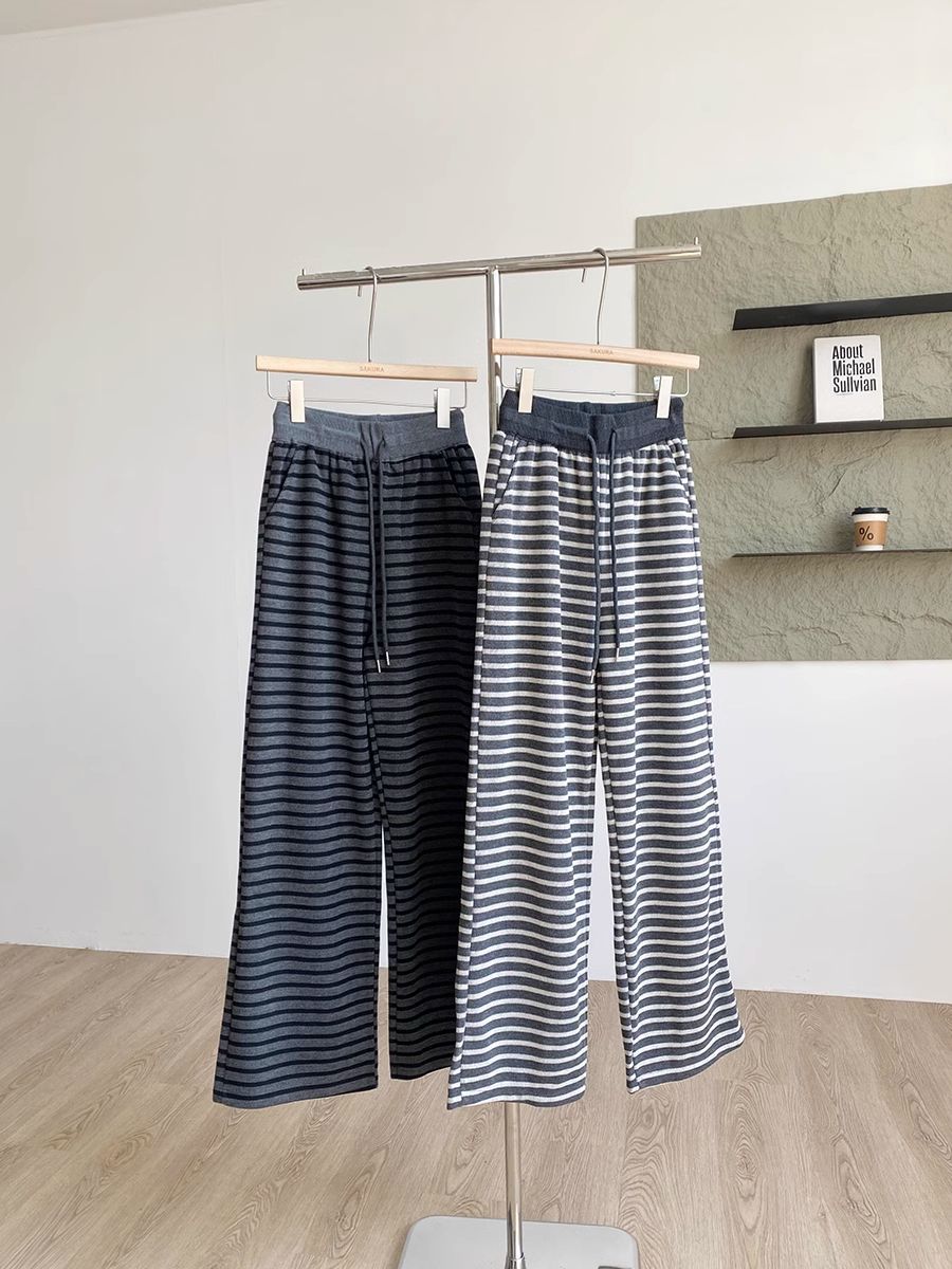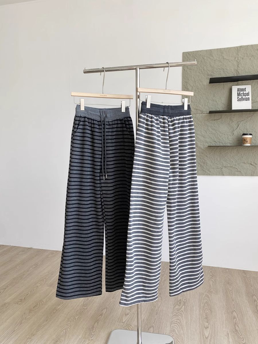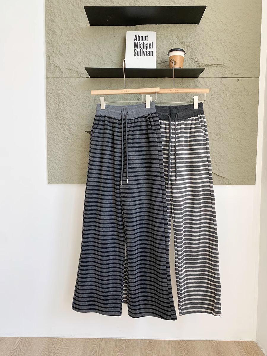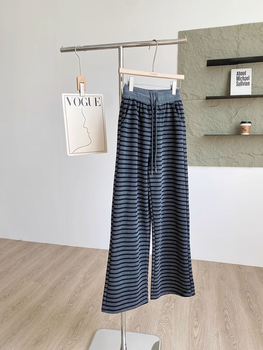 탄성 허리 드로 스트링 복고풍 줄무늬 넓은 다리 바지 여성 2025 봄 새로운 게으른 느슨한 높은 허리 드레이프 캐주얼 바지스토어 가기