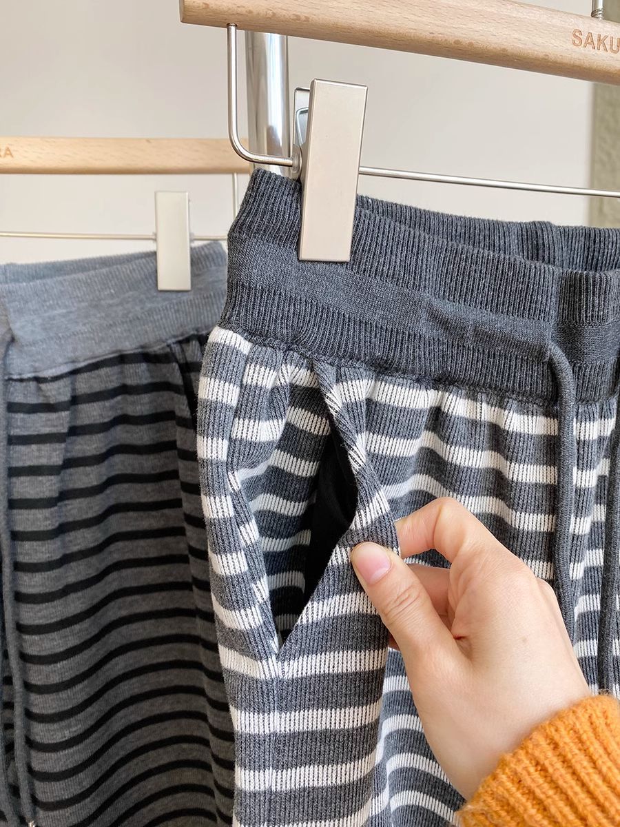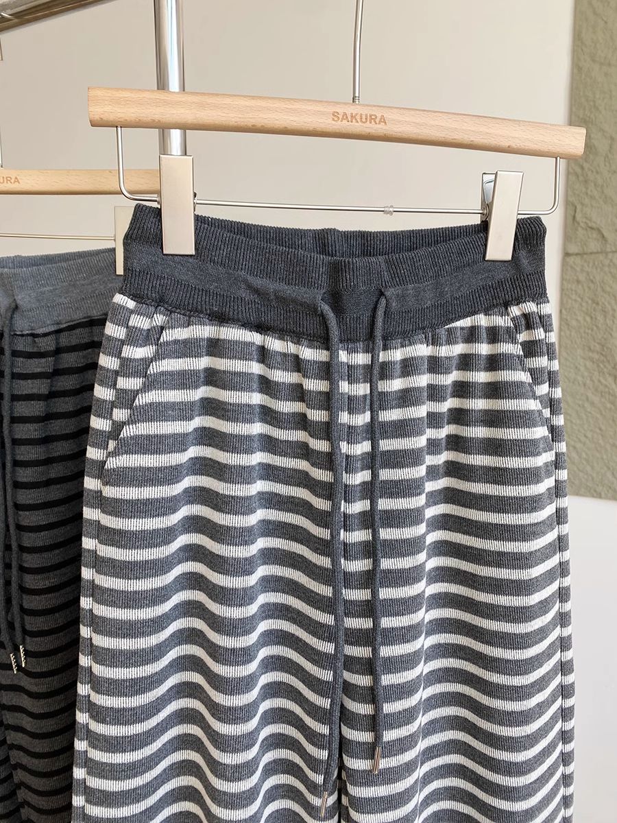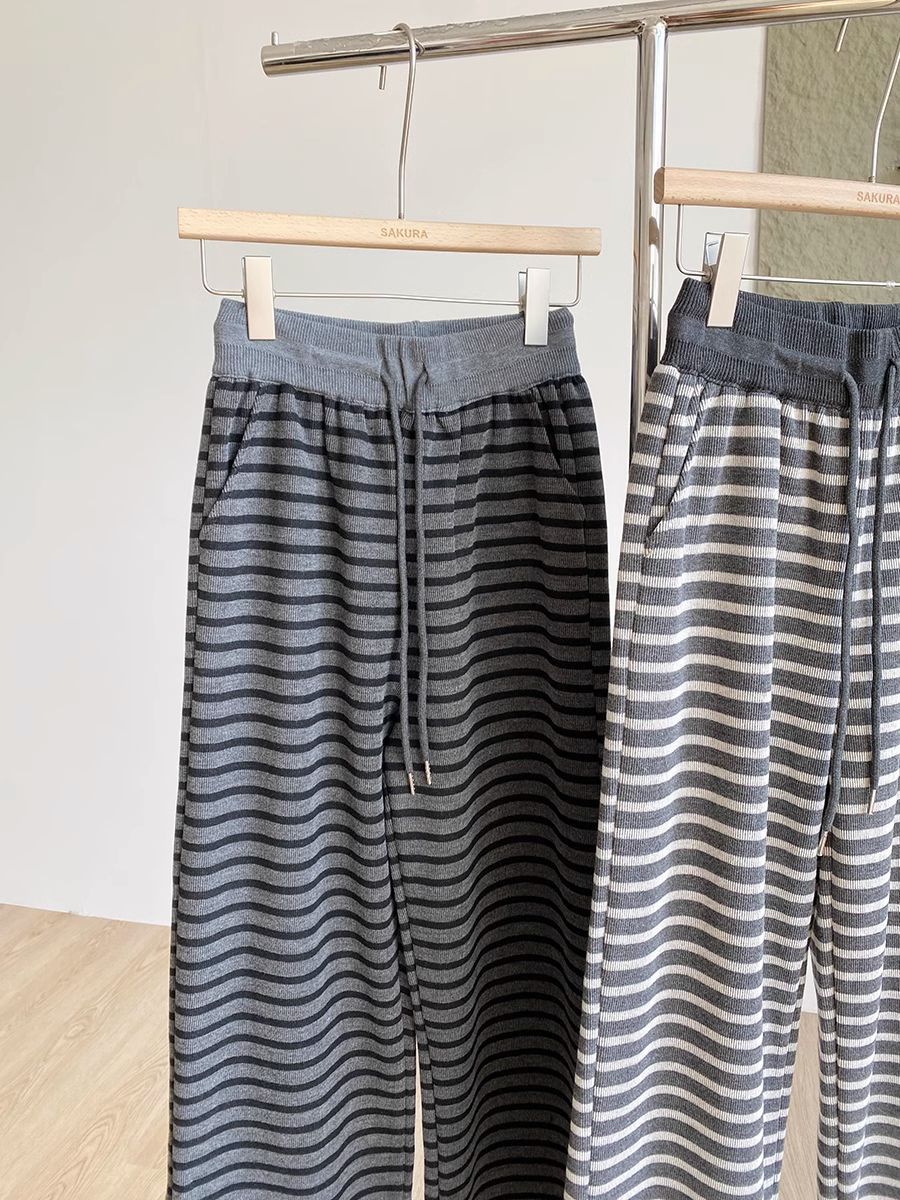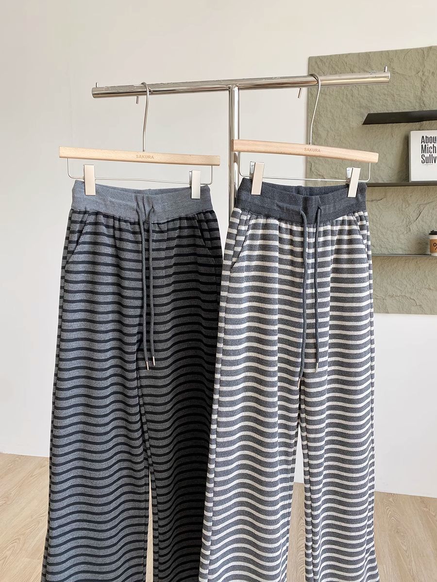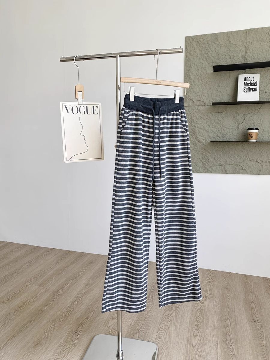 탄성 허리 드로 스트링 복고풍 줄무늬 넓은 다리 바지 여성 2025 봄 새로운 게으른 느슨한 높은 허리 드레이프 캐주얼 바지스토어 가기