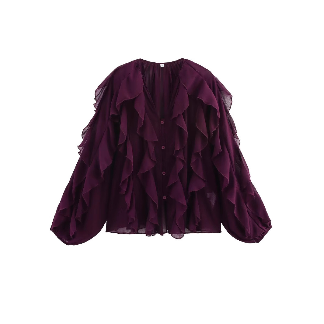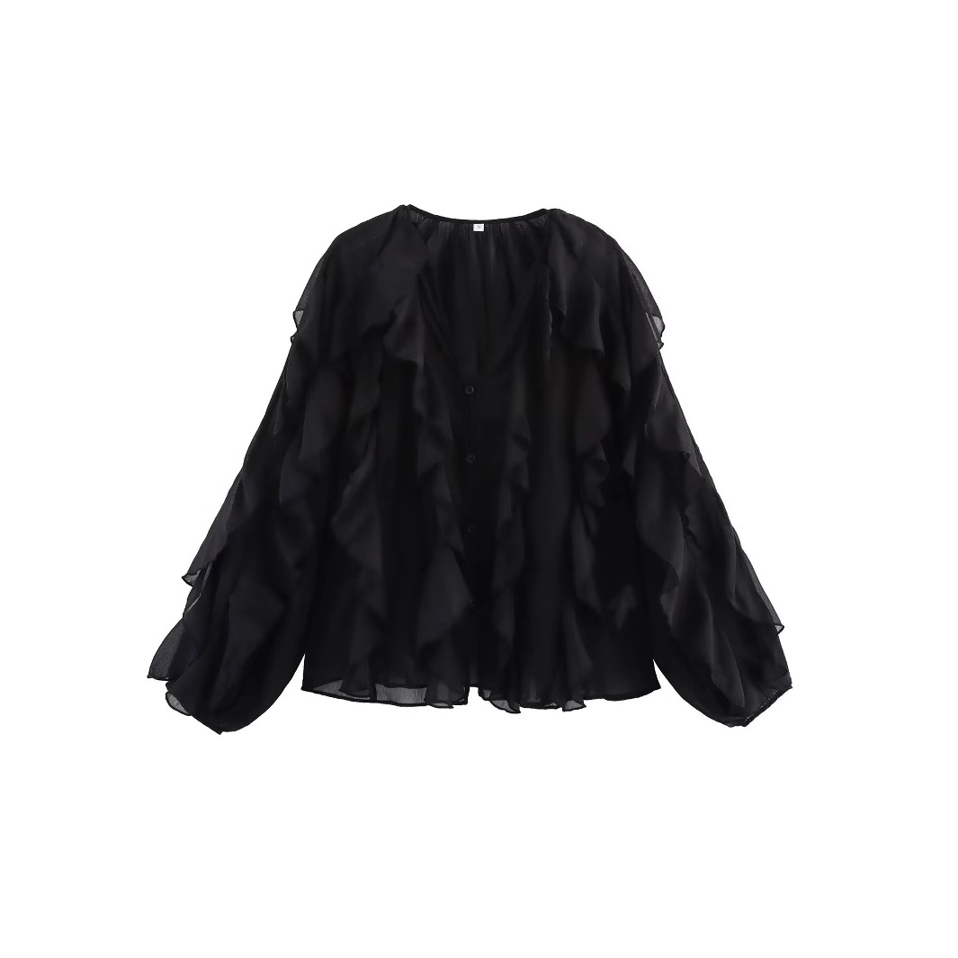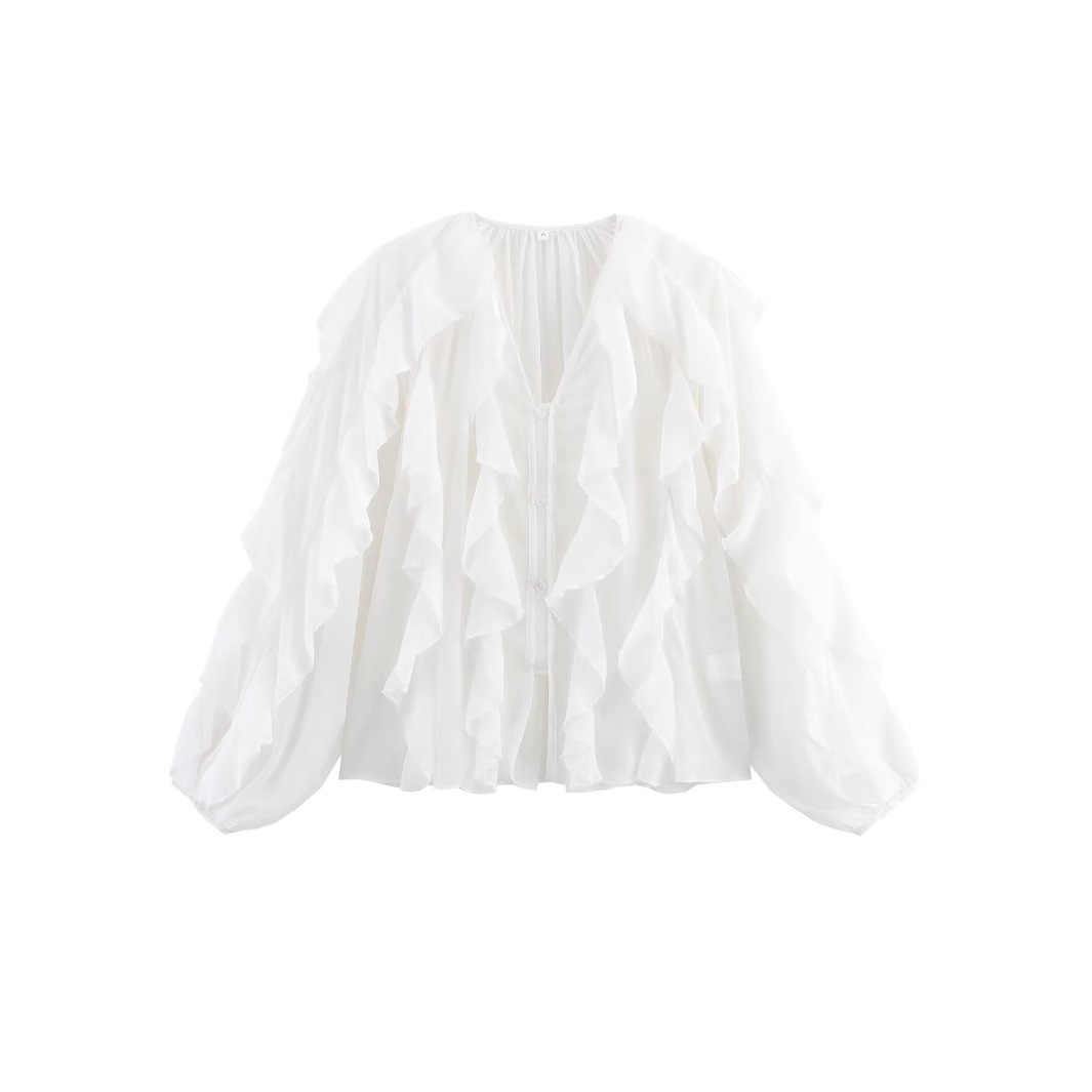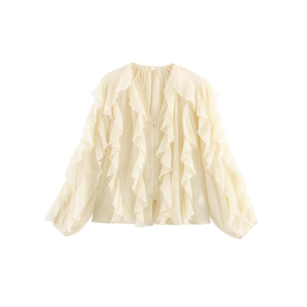 ZA 크로스보더 2025 신작 봄 여성 브이넥 심플하고 다재다능한 레이어드 장식 셔츠 탑스토어 가기