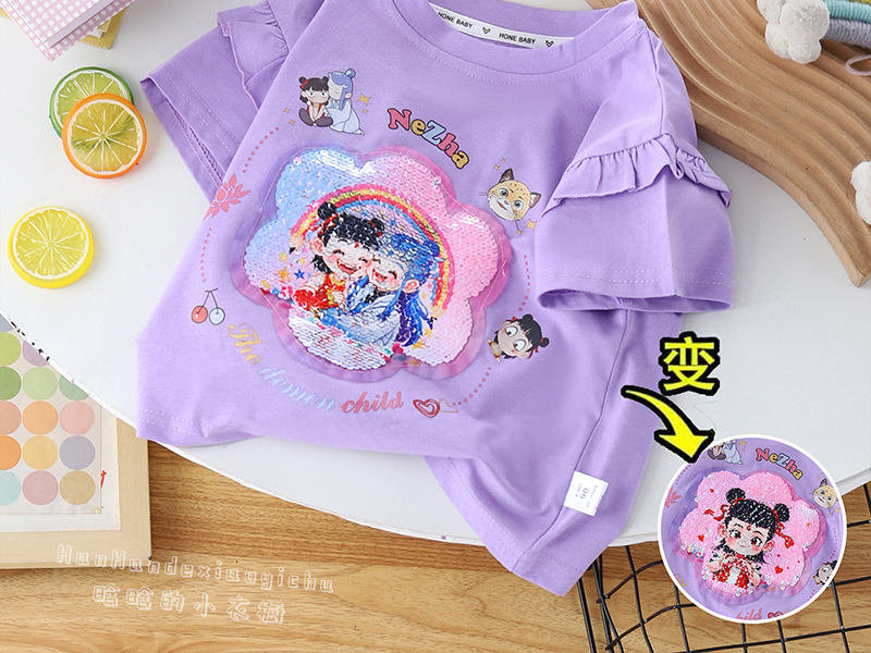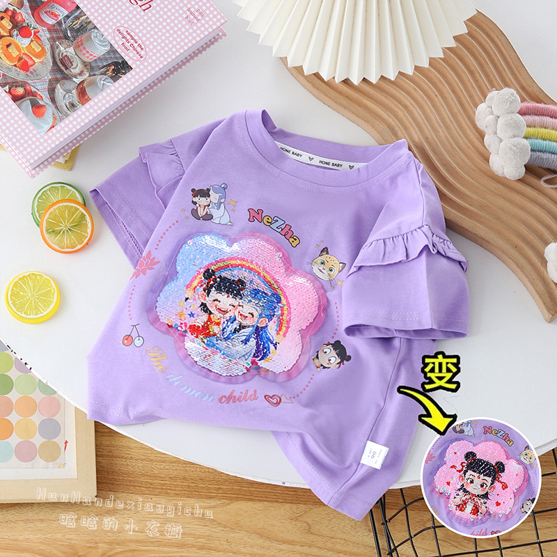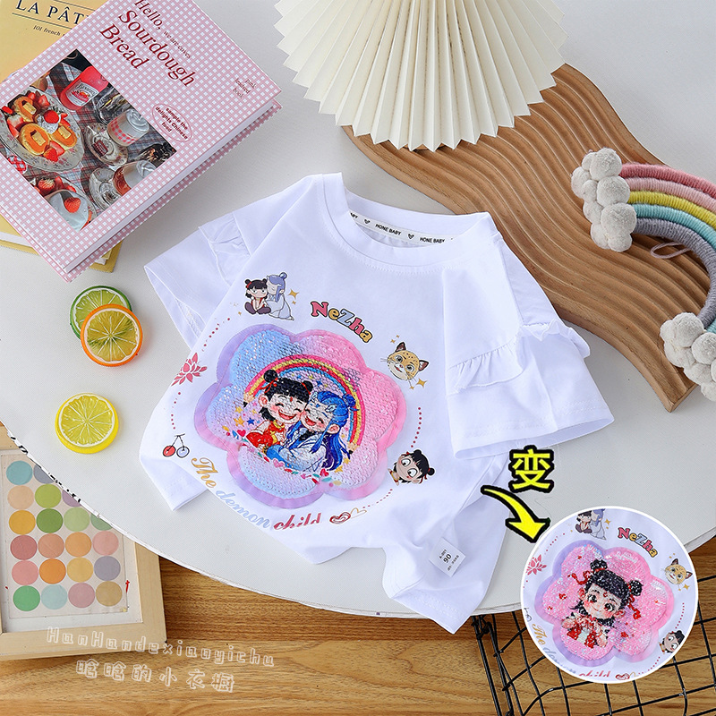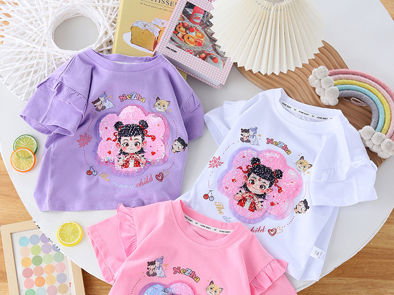 여름 유행 반소매 셔츠를위한 가역적 인 변화 패턴 시퀀스가있는 소녀 새 여름 소매 반팔 티셔츠스토어 가기