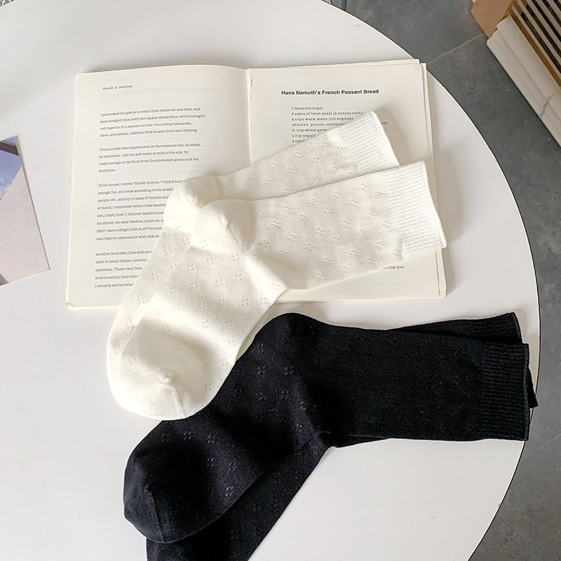 봄과 여름 얇은 양말 여성용 할로우 아웃 4 잎 클로버 트렌디 미드 튜브 여성용 양말 크림 화이트 메쉬 뼈없는 코튼 스택 양말