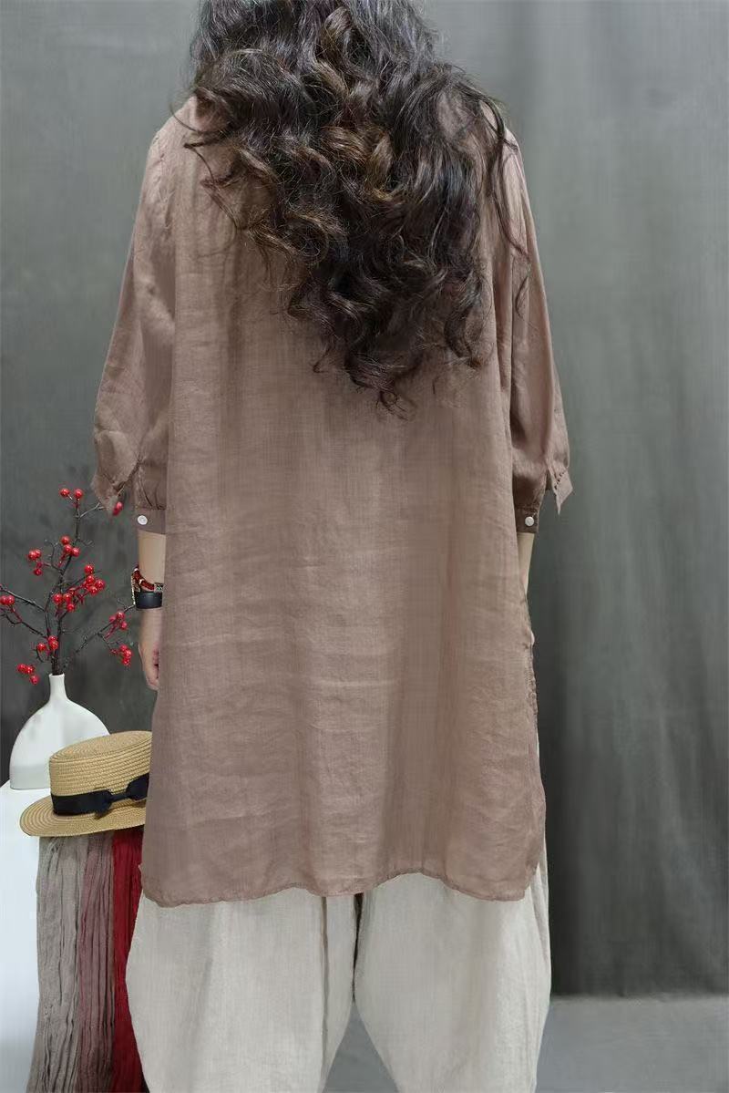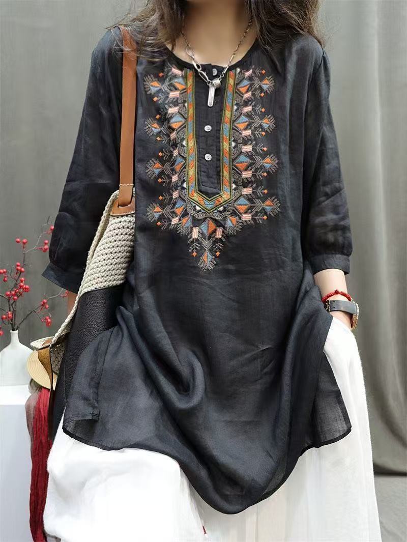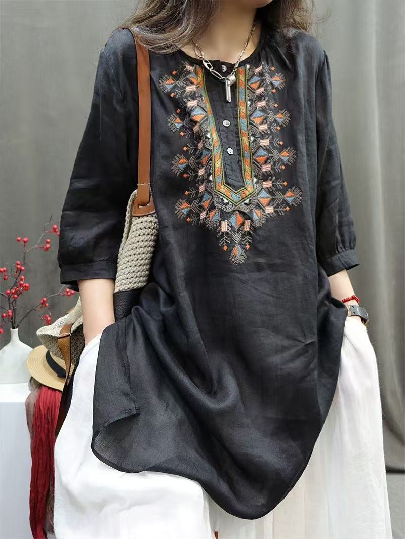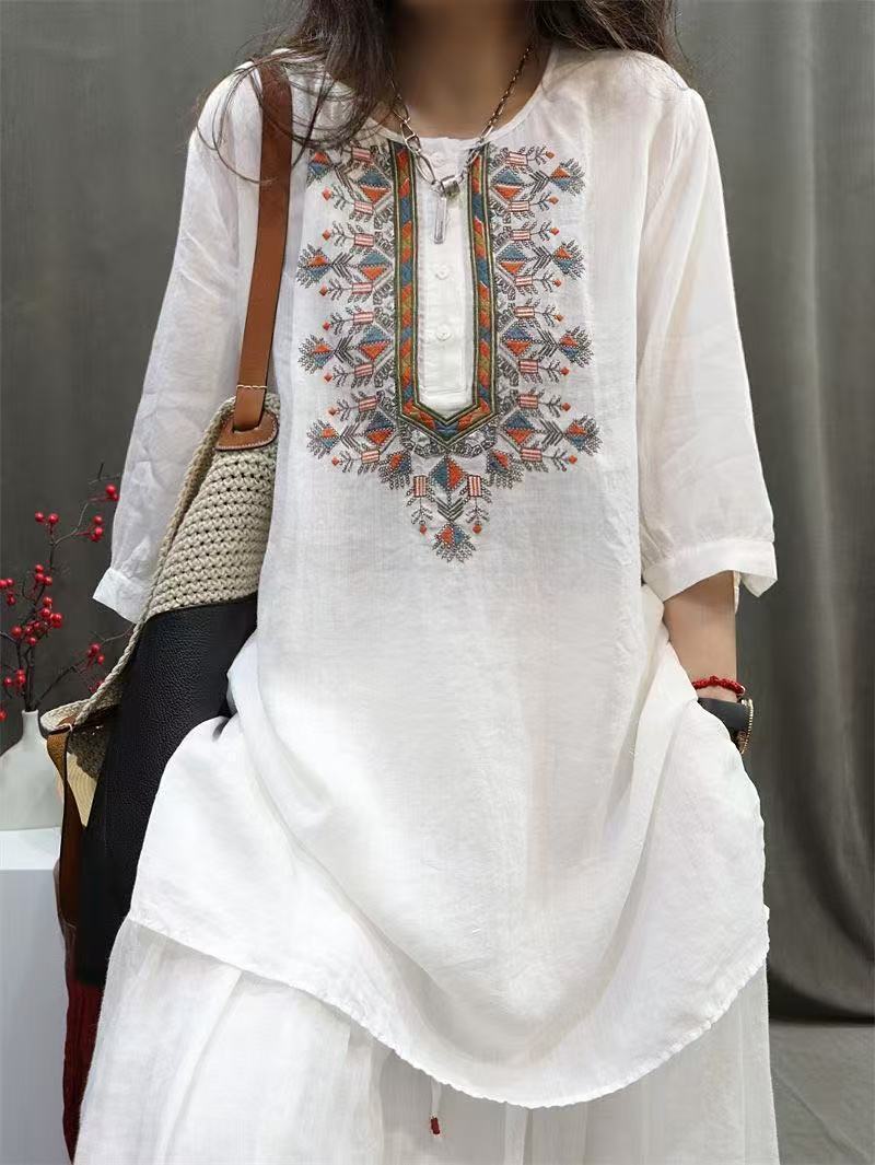 빈티지 자수 여름 중공업 셔츠 중간 길이의 느슨한 면과 리넨 서양식 셔츠 캐주얼 예술적 풀오버 탑스토어 가기