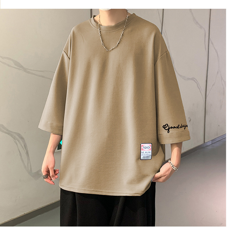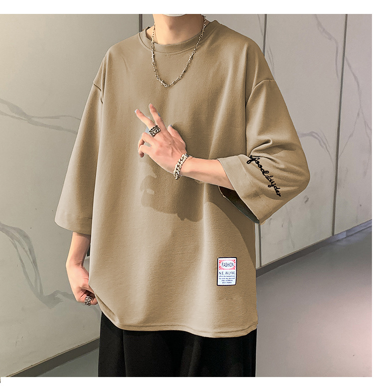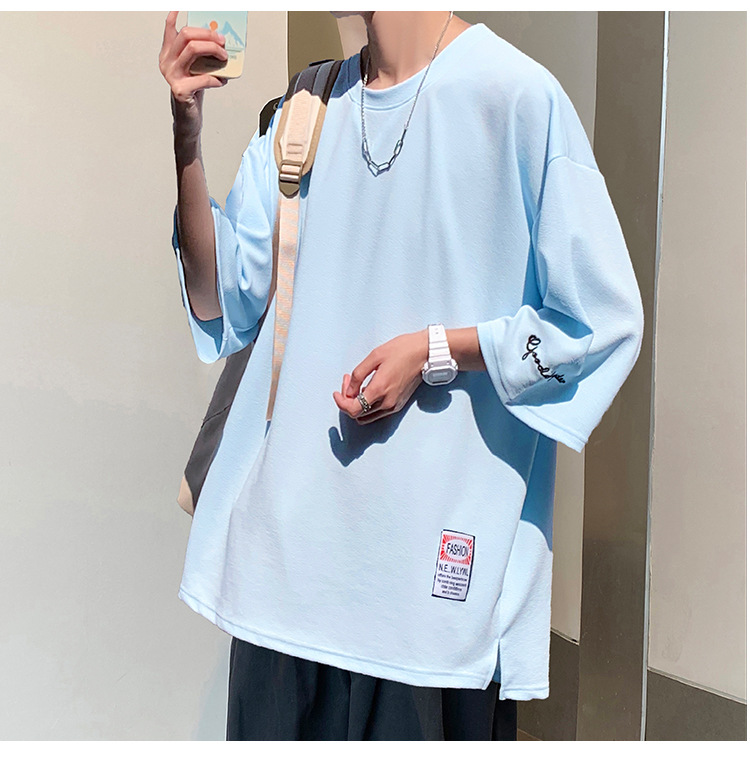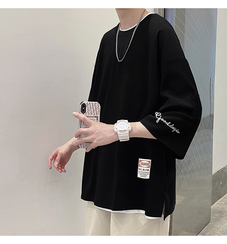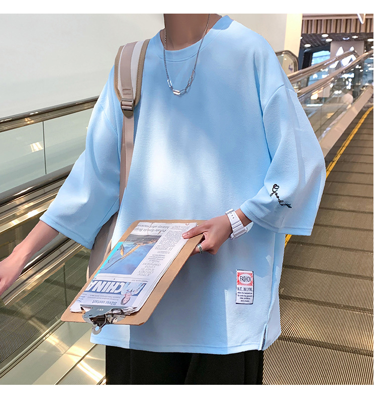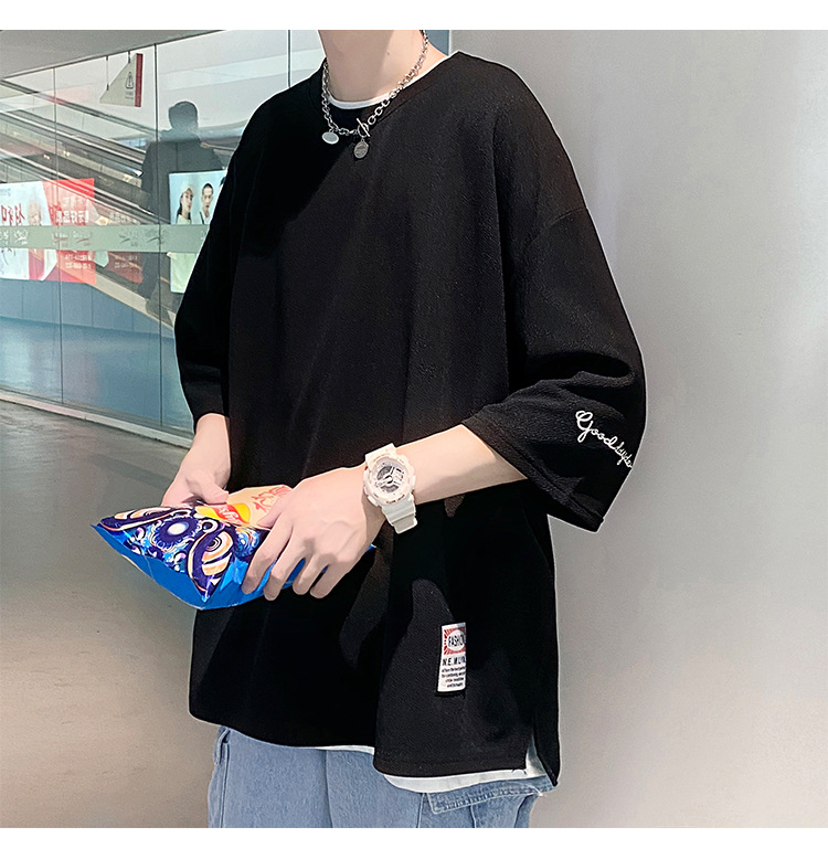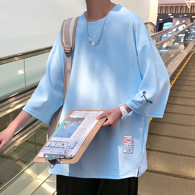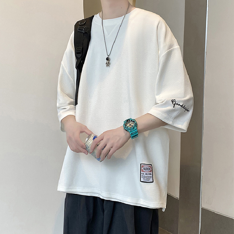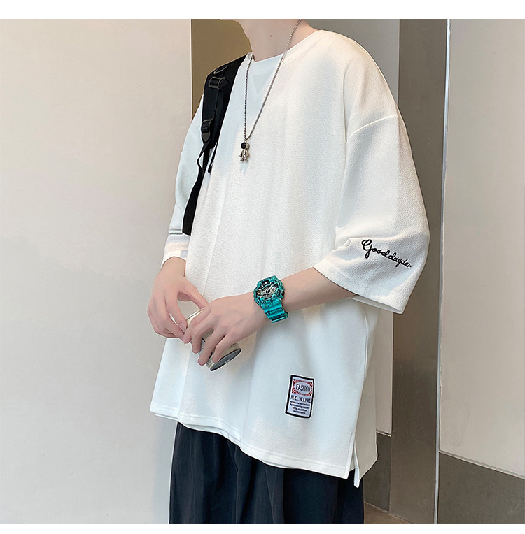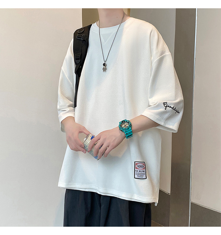 자수 7부소매 남성 티셔츠 여름 트렌디 브랜드 트렌디 루즈한 대형 반팔 티셔츠 헤비 반팔 아이스 실크 의류