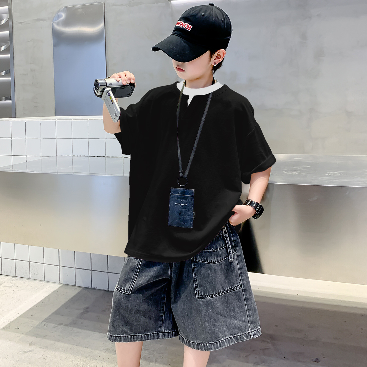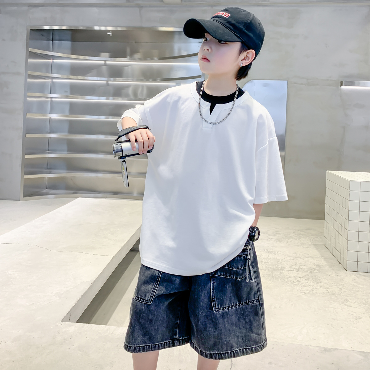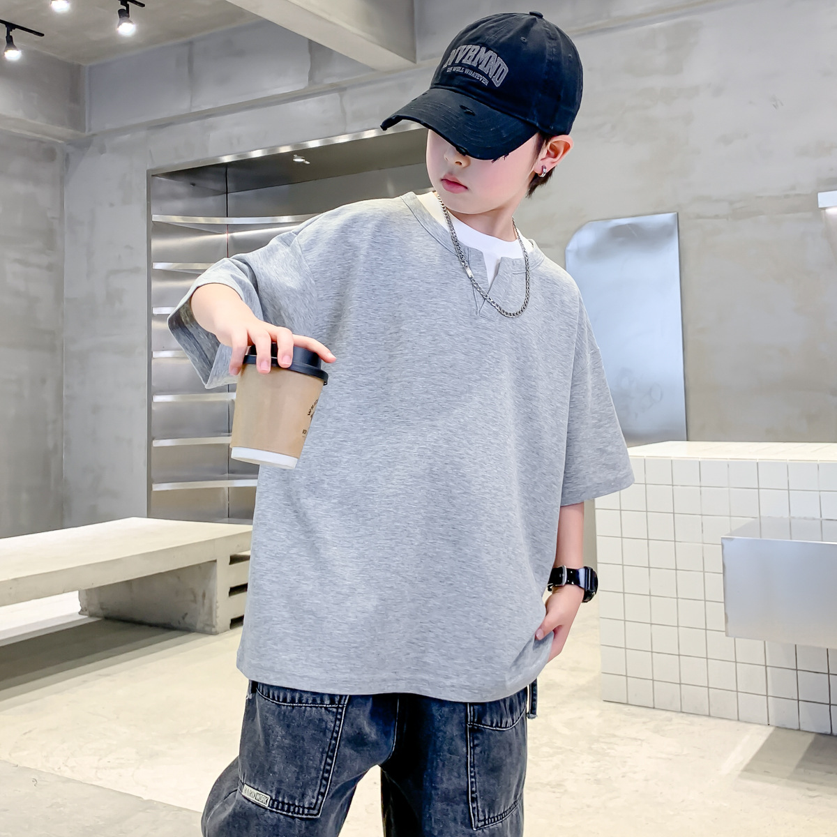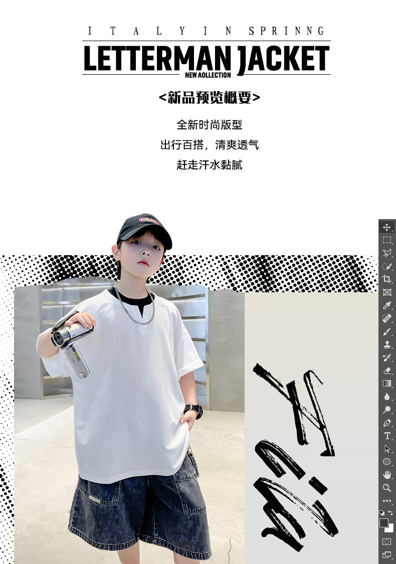 남자들의 여름 반팔 티셔츠 2025 대형 어린이와 소년을위한 새로운 여름 원피스 여름 탑 얇은 멋진 핸섬 트렌디 티셔츠스토어 가기