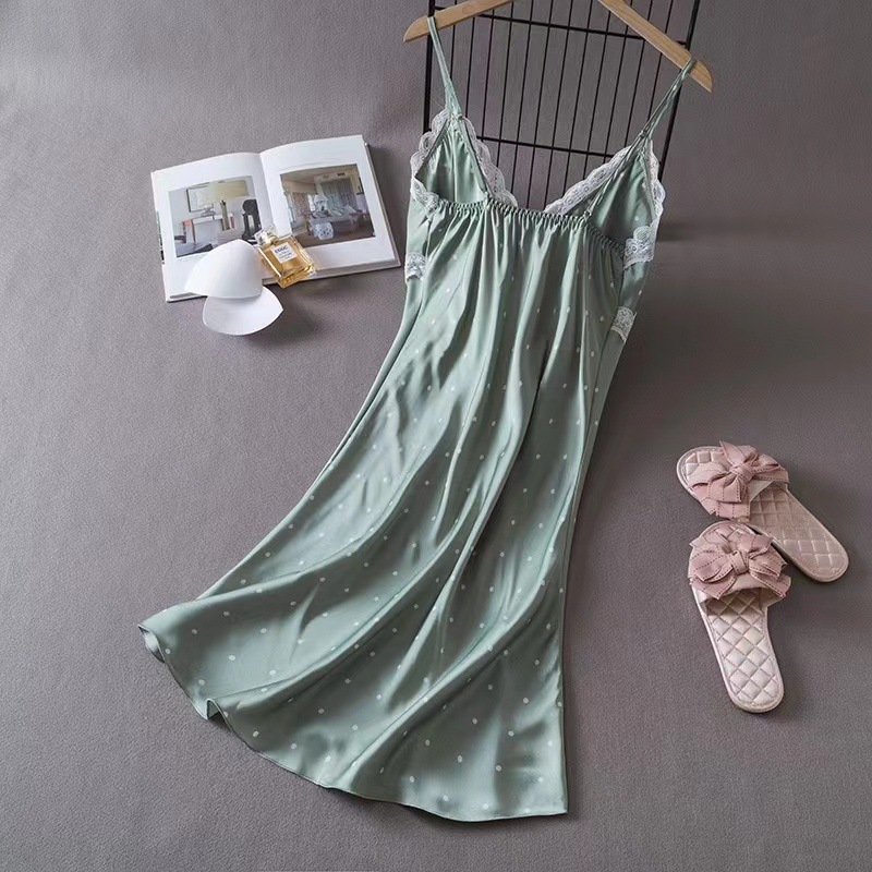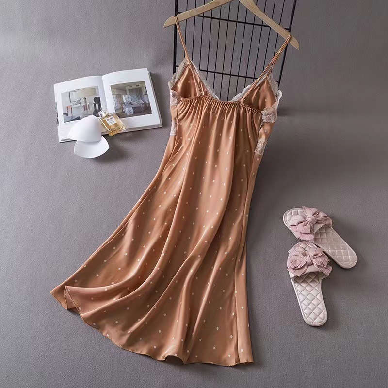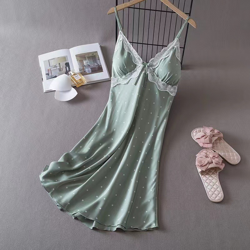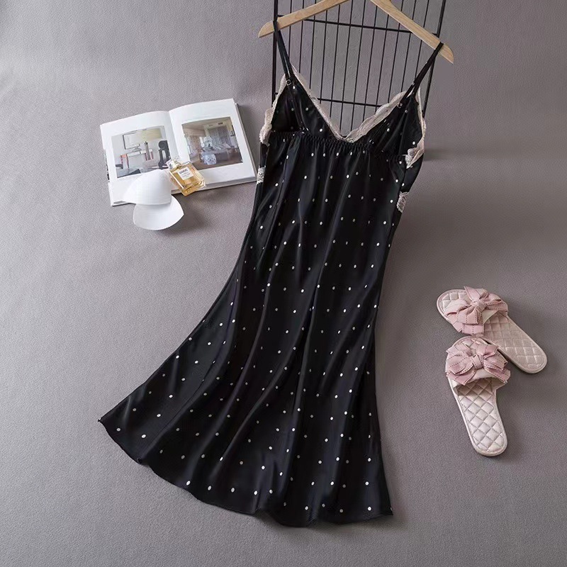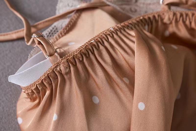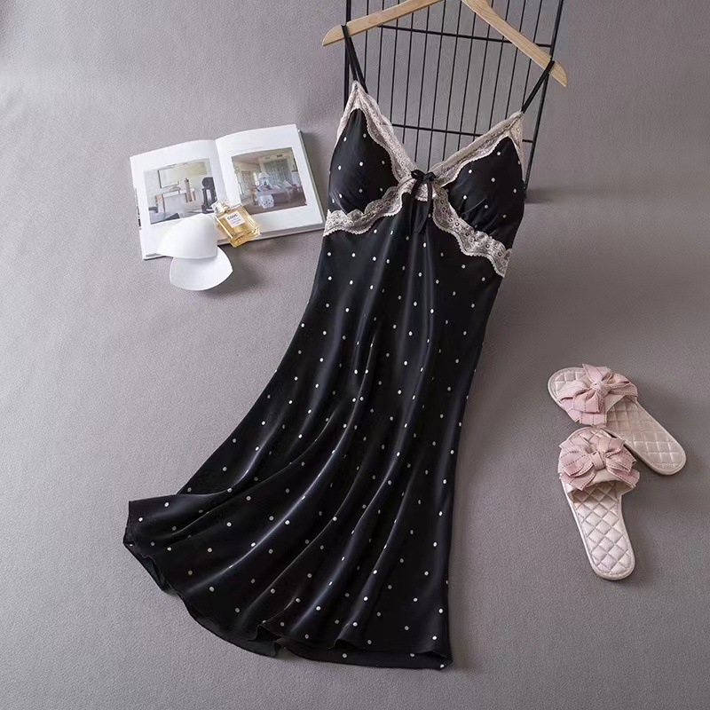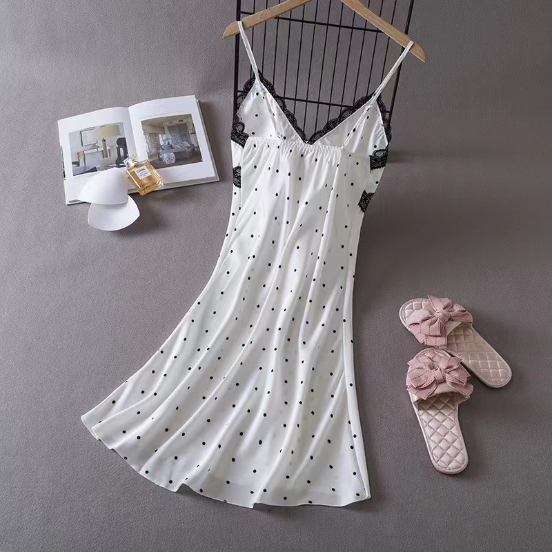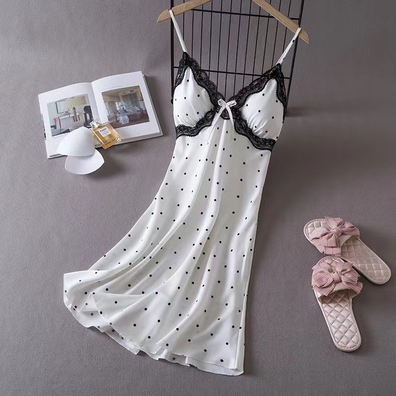 여성을위한 Ins 스타일 잠옷 얼음 실크 섹시한 유혹 여름 숙녀 잠옷 가슴 패드 폴카 도트 잠옷 순수한 욕망 홈웨어스토어 가기